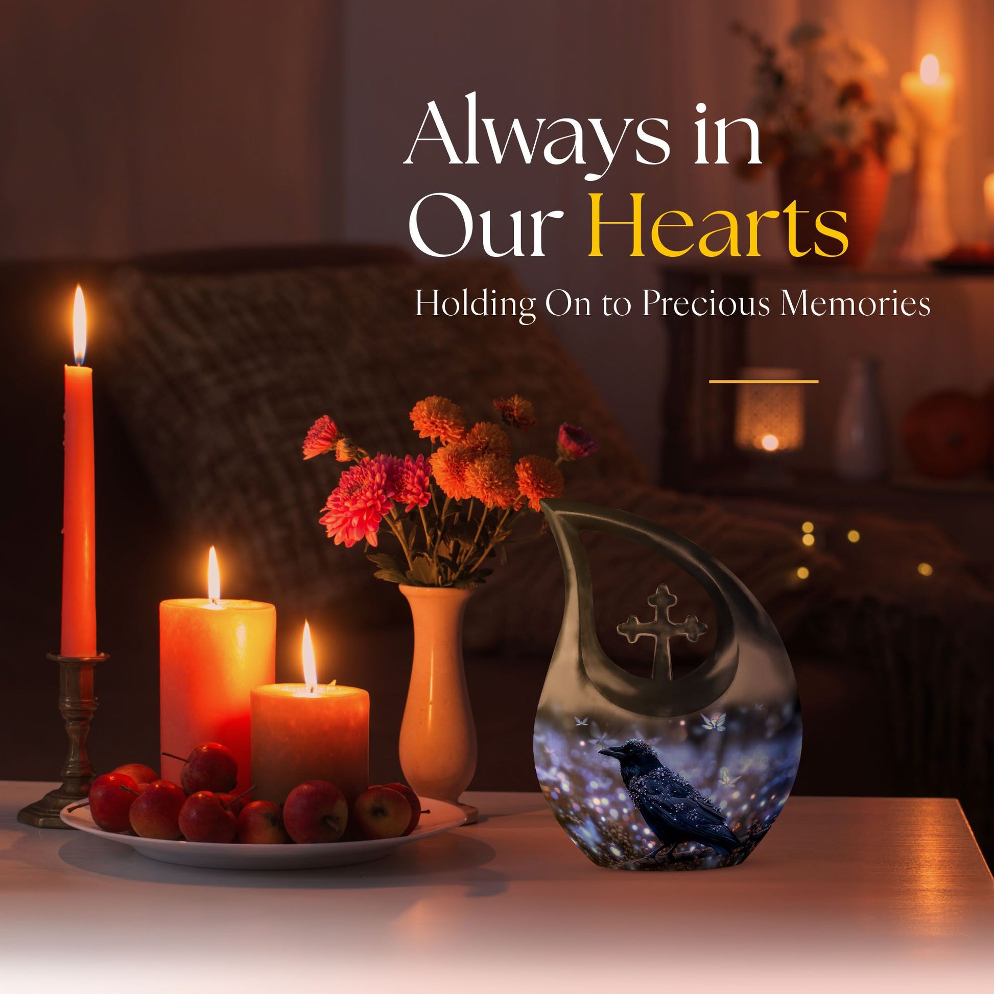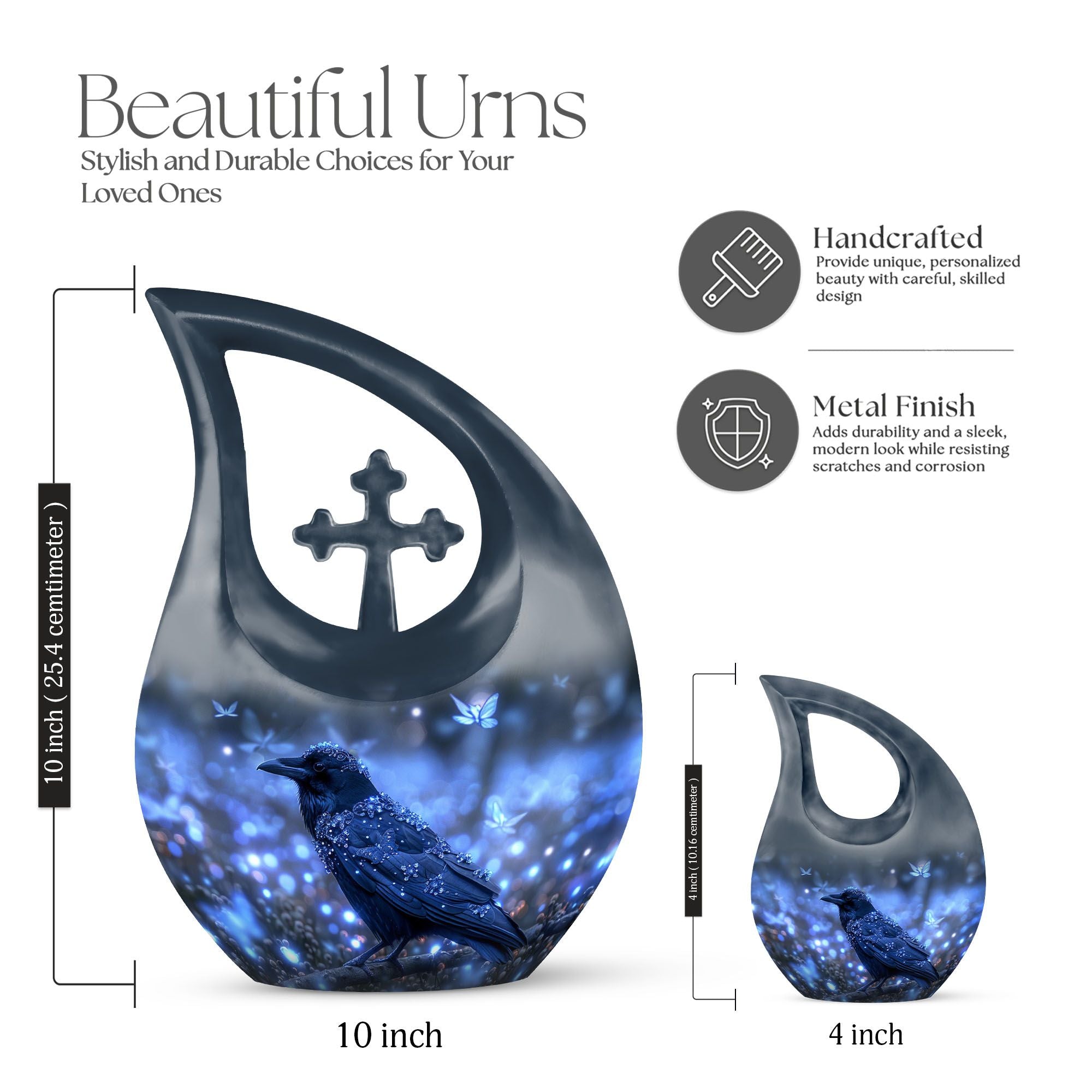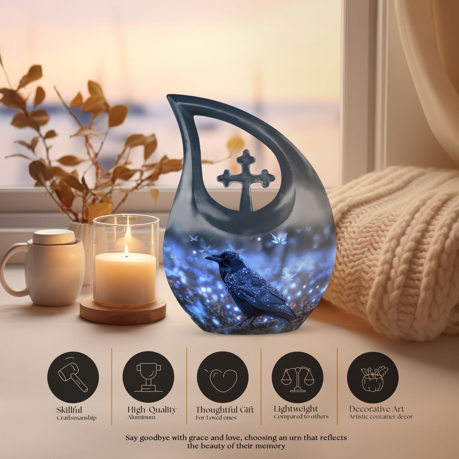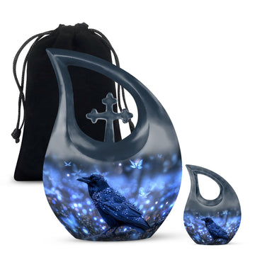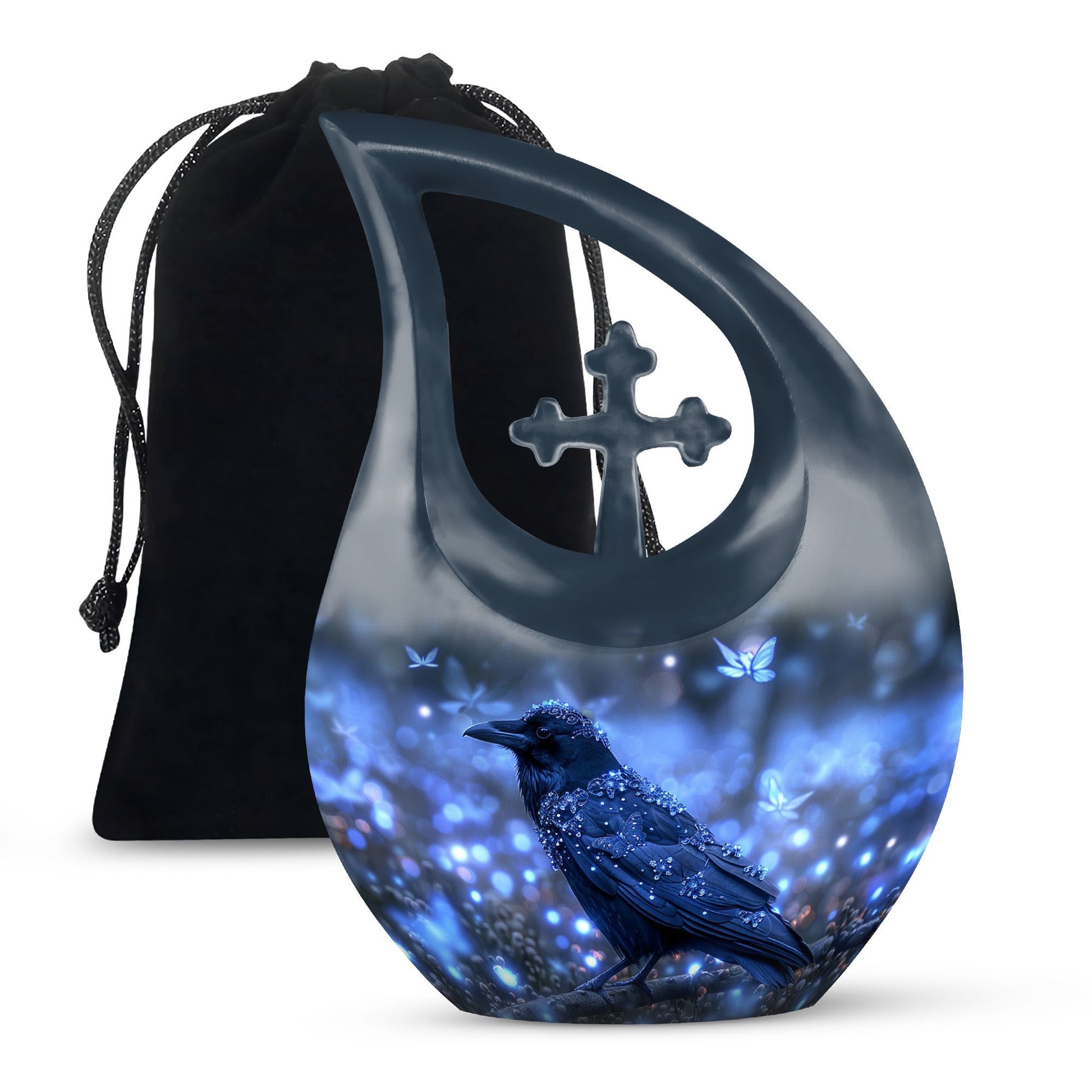The Royal Raven Urn for Human Ashes is a magnificent tribute that embodies mystery, wisdom, and everlasting remembrance. With its deep blue glow and intricate raven artwork, this urn keepsake for human ashes represents guidance and protection through the spiritual journey. Crafted for those who lived boldly and left behind powerful memories, it stands as a timeless ashes memorial keepsake for families seeking beauty and meaning in remembrance.