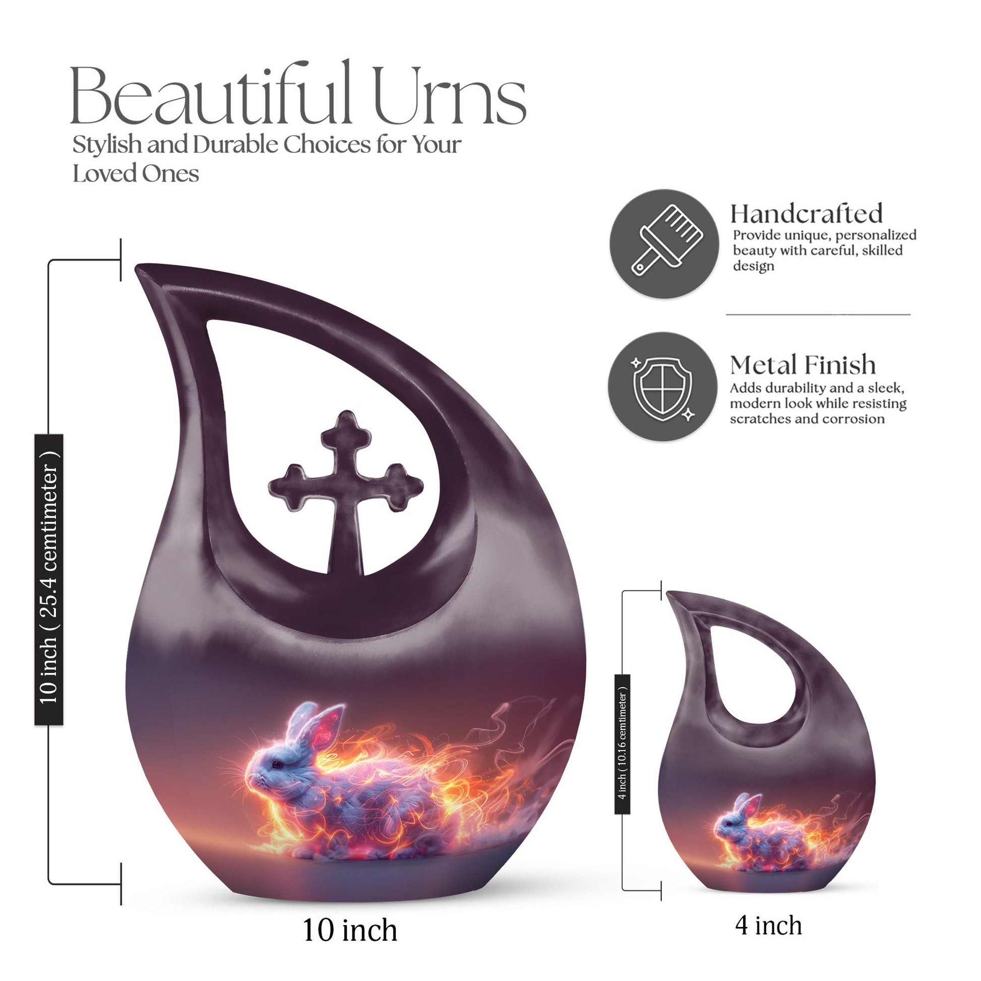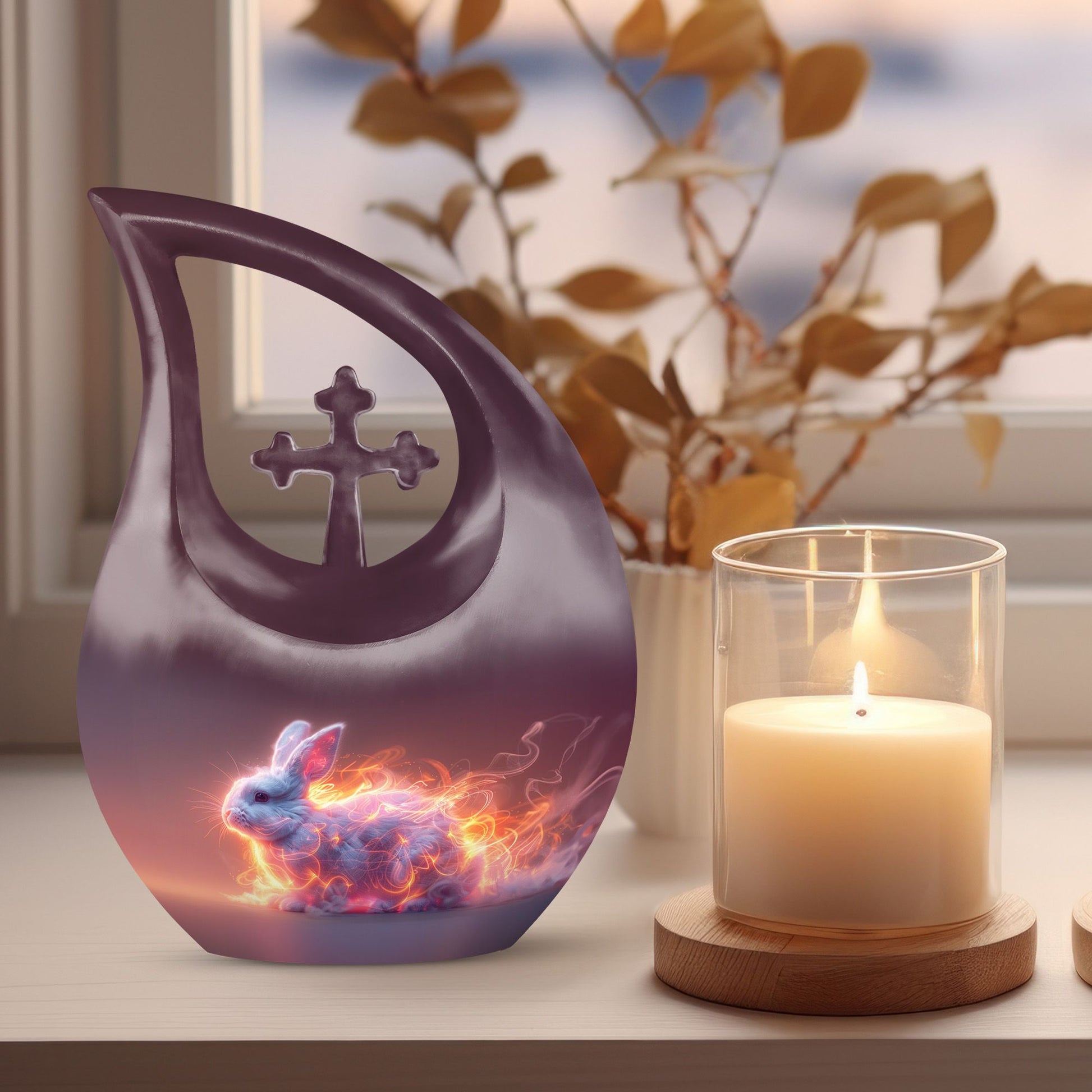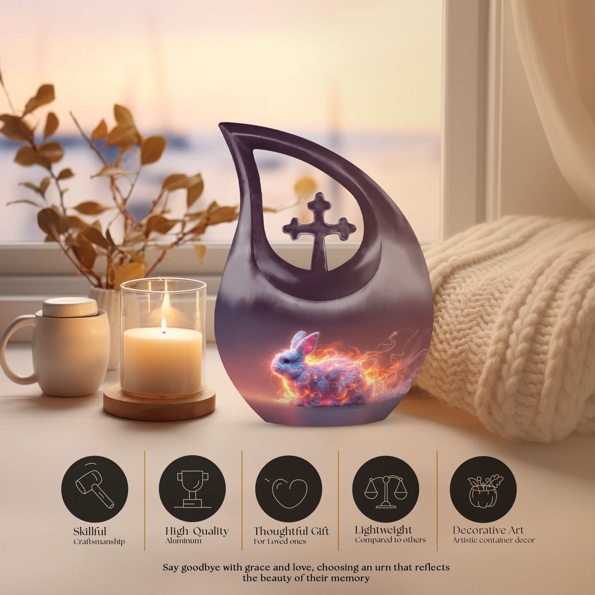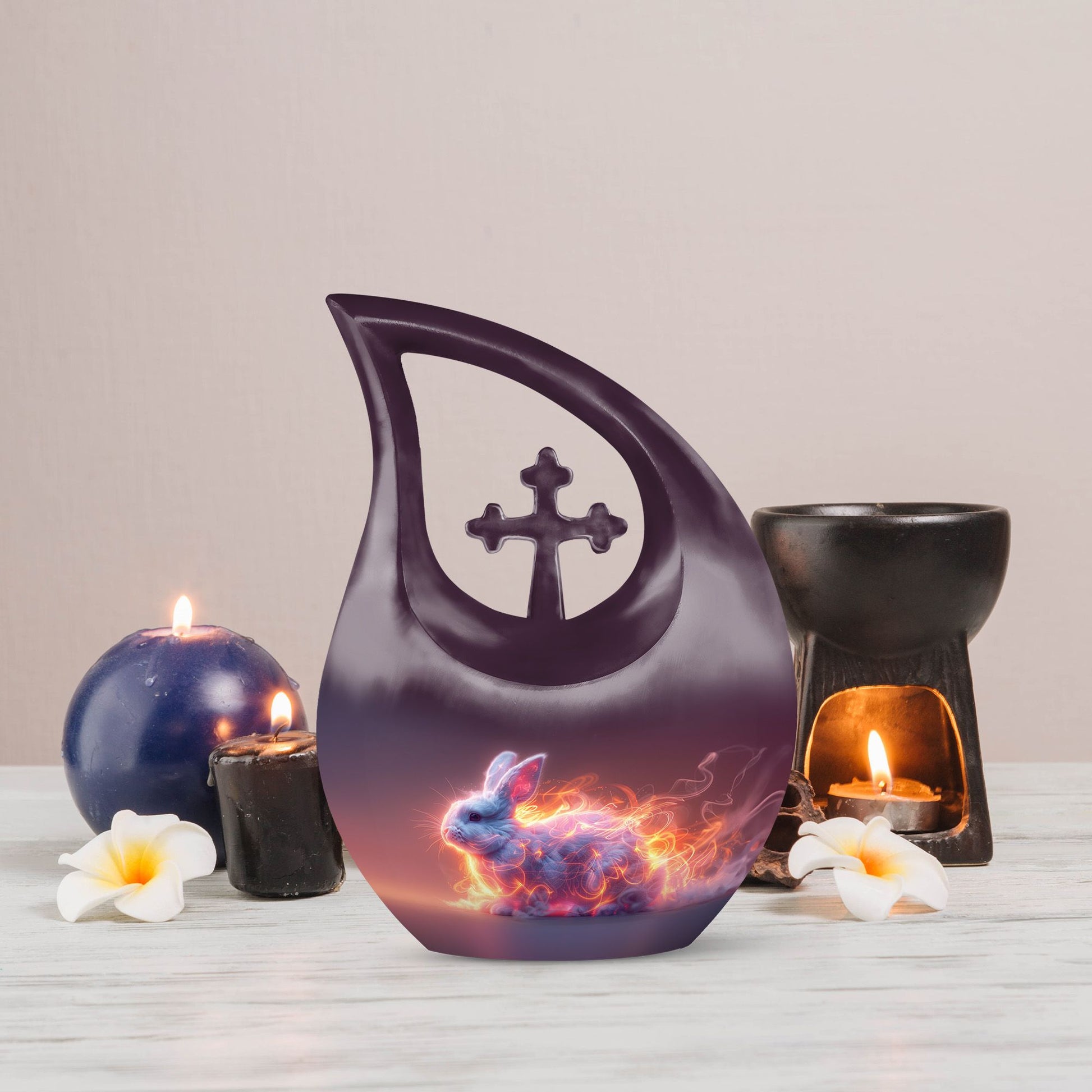 Discover our Fiery Ethereal Rabbit Urn, a rare and stunning memorial piece from our Cool Urns For Ashes collection. This Large Urn, built for durability with Aluminum, graciously stands as high as 10 inches and weighs 3.3 pounds. Its unique Fiery Ethereal Rabbit theme distinguishes it apart from the rest. It possesses a capacity of 200 cubic inches, ensuring ample space to hold precious memories encapsulated in ashes. The urn comes in a rich 'Cross Drop' urn design and is complemented by a soft velvet pouch for the containment of the ashes. Our customization feature lets you personalize this memorial urn with engraved names, making it a truly one-of-a-kind memorial. For those searching for Affordable Cremation options, Cheap Urns, or a unique Box For Ashes Human, our Purple Urn fits the bill. This urn is not just a product but a precious vessel that helps keep cherished memories alive.