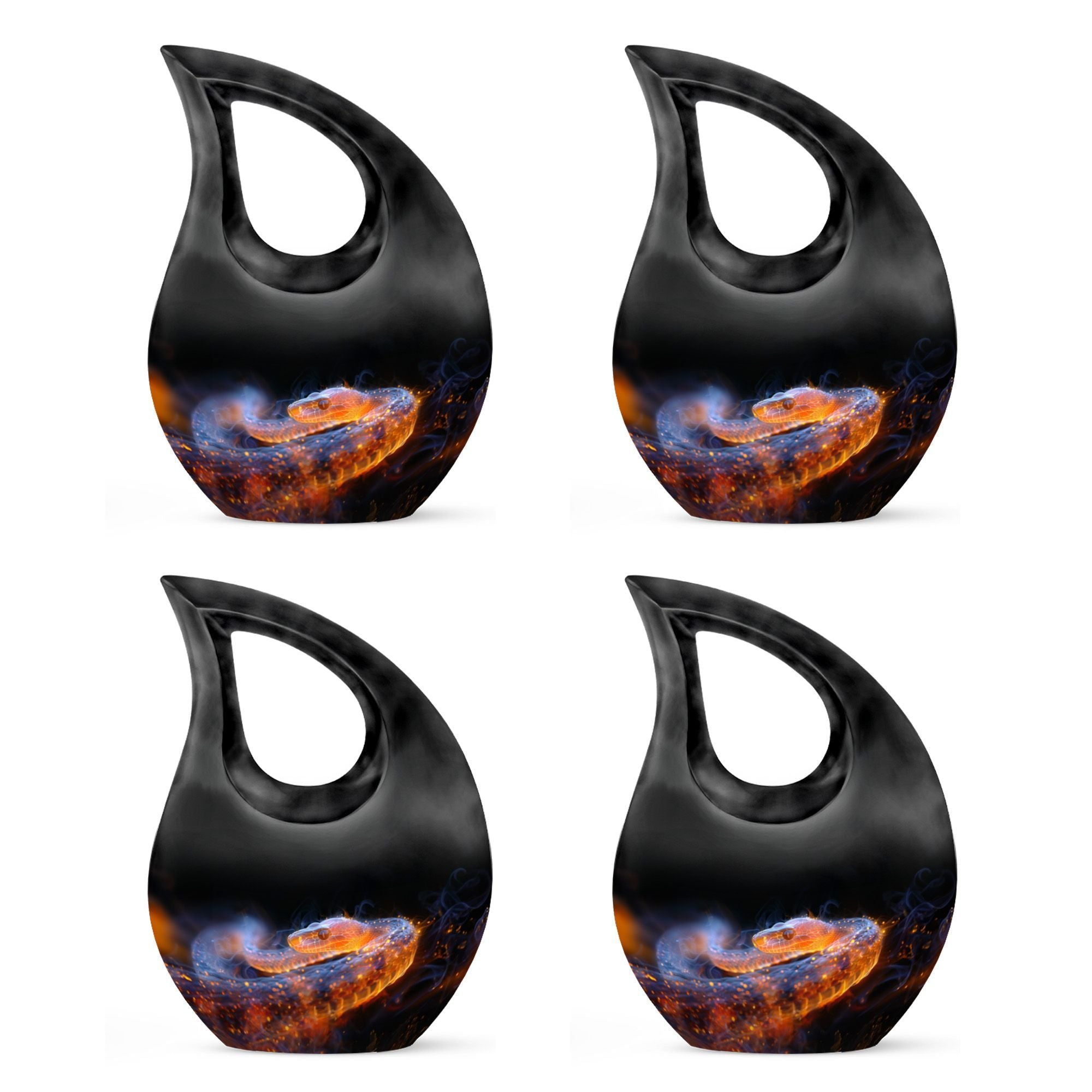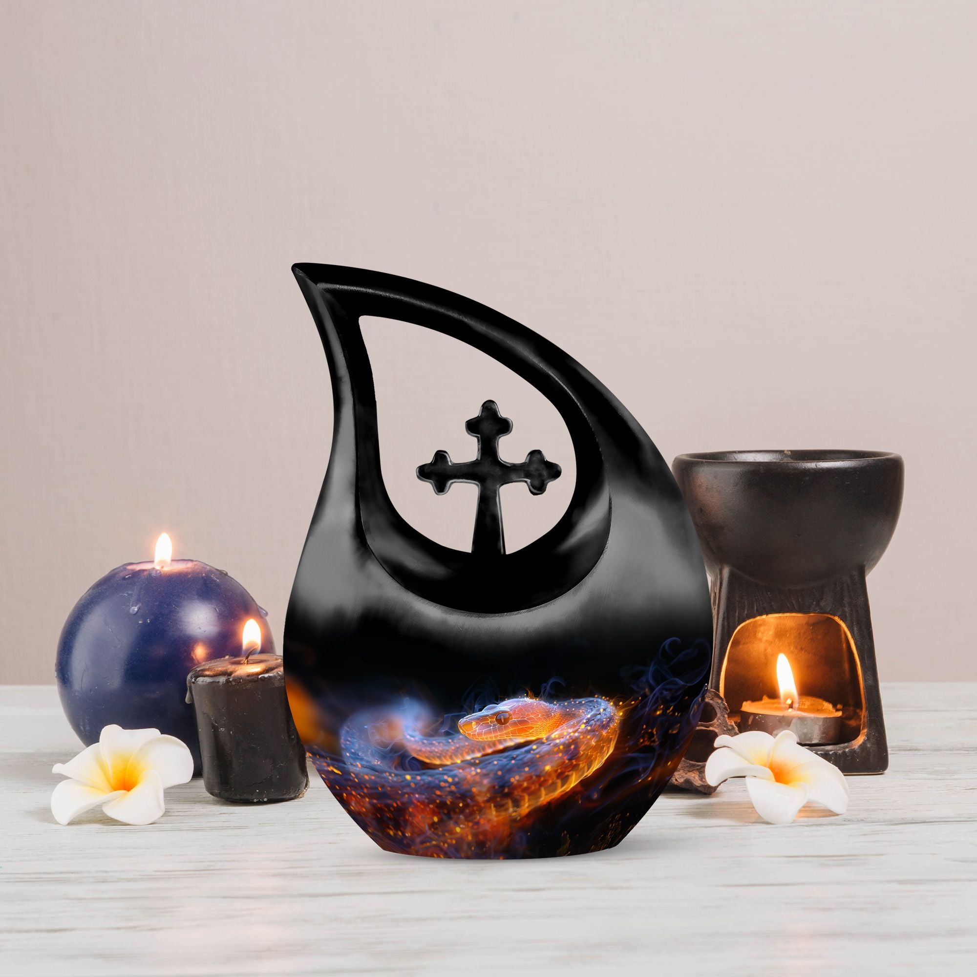Discover the unique appeal of our exquisite 10-inch 'Fiery Serpent Fantasy Urn'. Masterfully crafted in robust yet lightweight aluminium, this notable urn has a roomy capacity of 200 cubic inches, making it a perfect choice for adults. Weighing a mere 3.3 pounds and standing at 10 inches in height, this Large Urn boasts a stunning 'Cross Drop' theme, adding a spiritual touch to its design. Want to make it truly unique? You have the freedom to personalize it with engraved names, encapsulating your heartfelt sentiments. Each purchase includes a velvet pouch, designed to respectfully contain the ashes. With its unparalleled aesthetic appeal and thoughtful features, this urn transcends ordinary vials to put ashes in or cremation boxes for human ashes. Whether you're seeking modern urns for ashes or personalised urns, this fantastic urn elegantly meets your needs. Remember your loved ones with the reverence they deserve with our 'Fiery Serpent Fantasy Urn'.