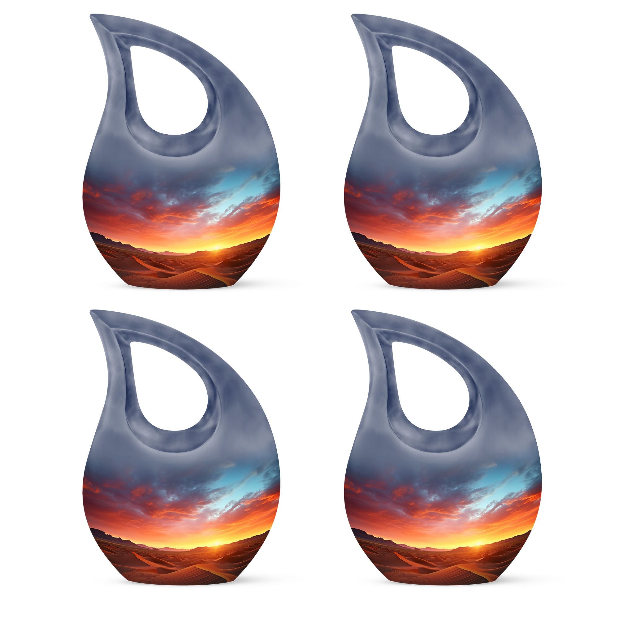 Crafted with precision, this sunset large urn combo set features warm desert hues with a lustrous finish that glows softly under light. Each urn is made from durable aluminum with a secure screw-top lid ensuring ashes remain safely protected. The design brings together strength and serenity, making it a meaningful choice for adult urns for women, urns for human ashes women, or adult urns for men & women who shared a love for nature’s beauty.