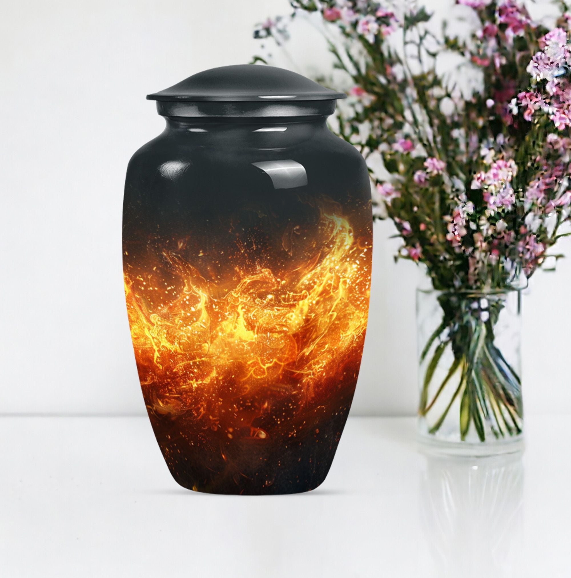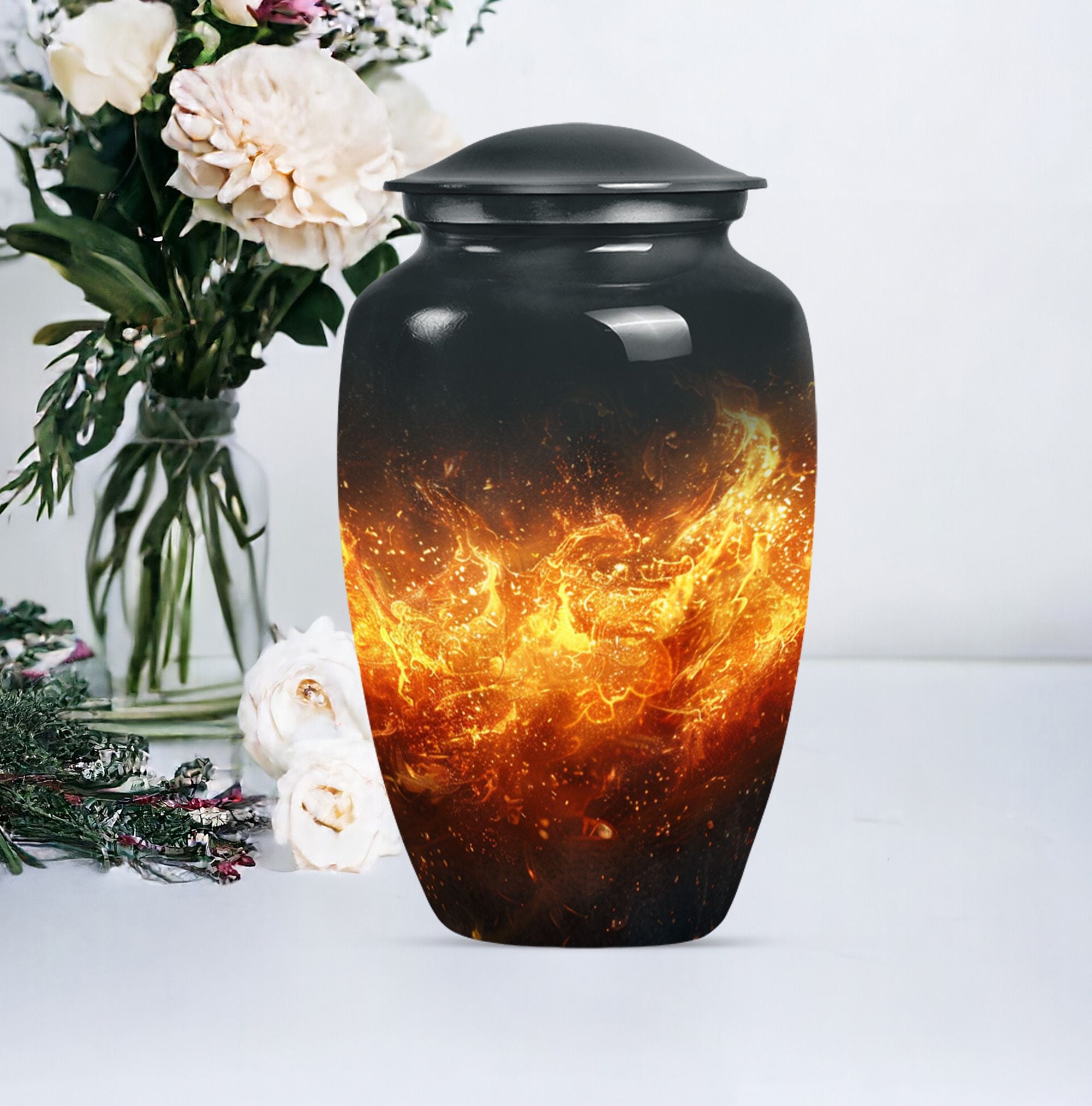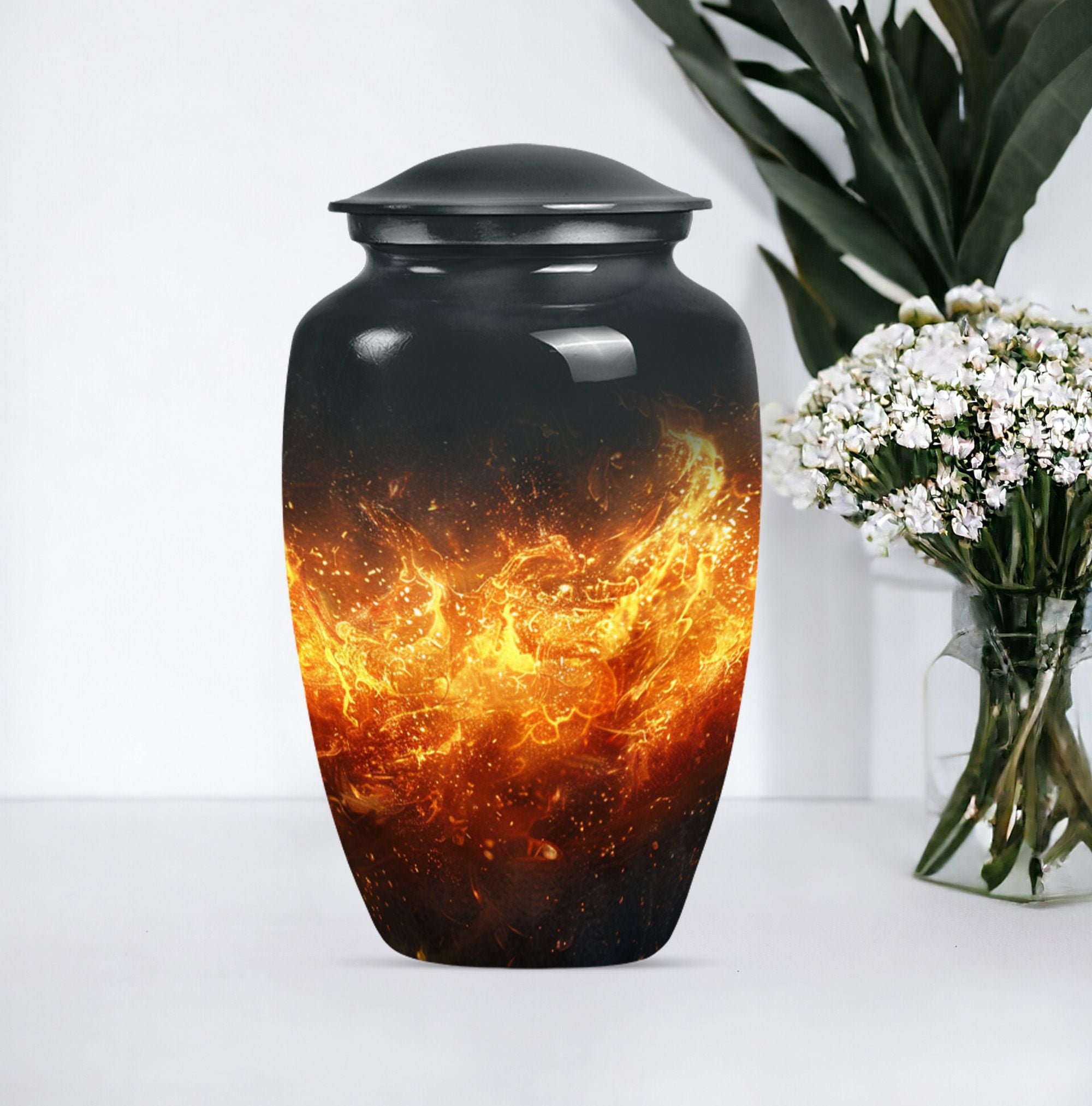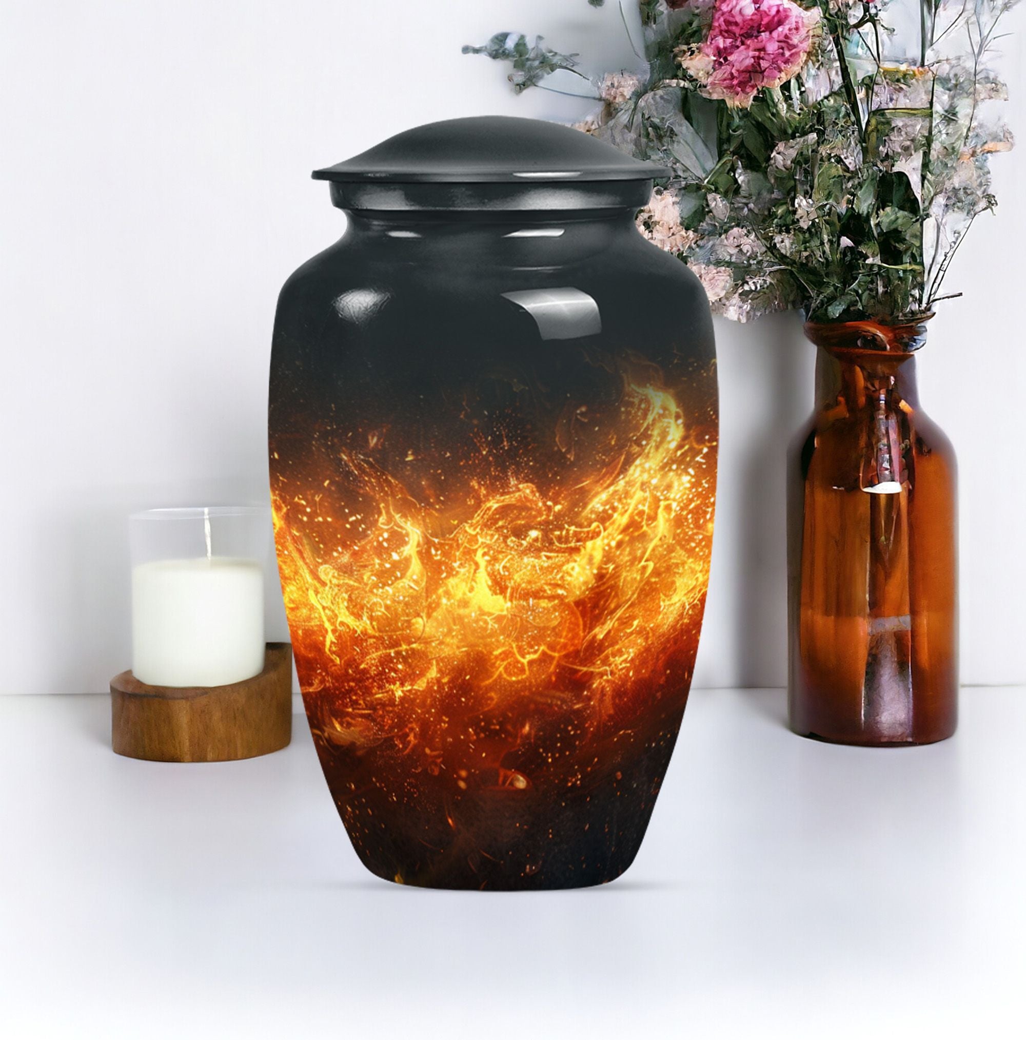This classic fire urn is an elegant and respectful option in memorial ceremony supplies. Made from durable aluminium, this large urn for an adult man is both practical and elegant. Measuring at a height of 10 Inches, the weight of this urn is 3.3 pounds. It has a capacity to securely hold up to 200 cubic inches of cremation ashes, ensuring your loved one's memory is preserved. This urn for funeral ashes comes with a velvet pouch, offering an additional layer of containment and protection. The urn can be personalized with engraved names, allowing for meaningful customization. Although its design follows an abstract theme, it maintains its classical elegance. This unique, innovative urn for human ashes ensures a robust and honoring memorial product. Uncommonly used in the category of urns for cremation ashes, this modern urn stands out with its notable terminology. Note: The urn design and details mentioned do not refer to its physical appearance.