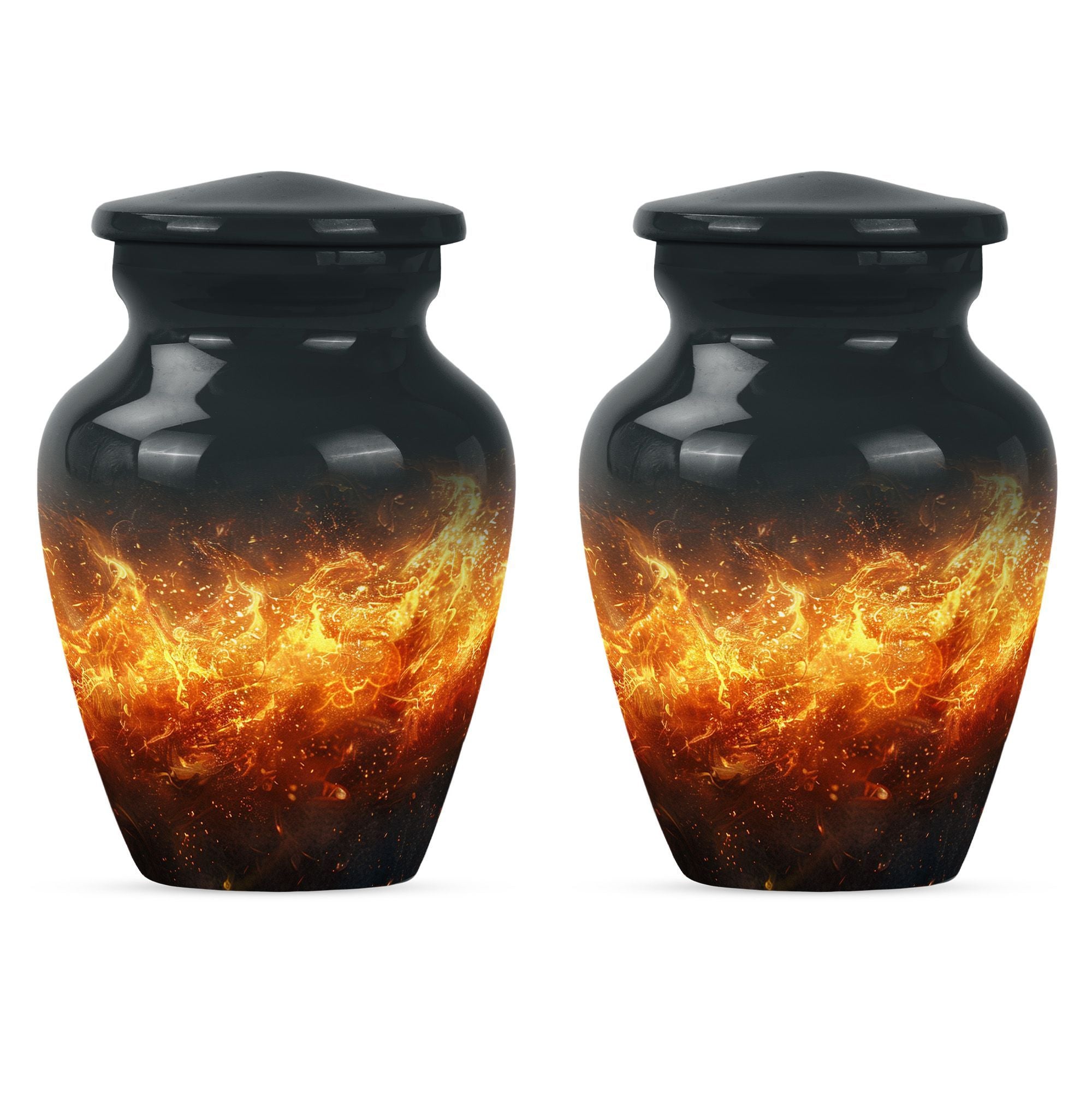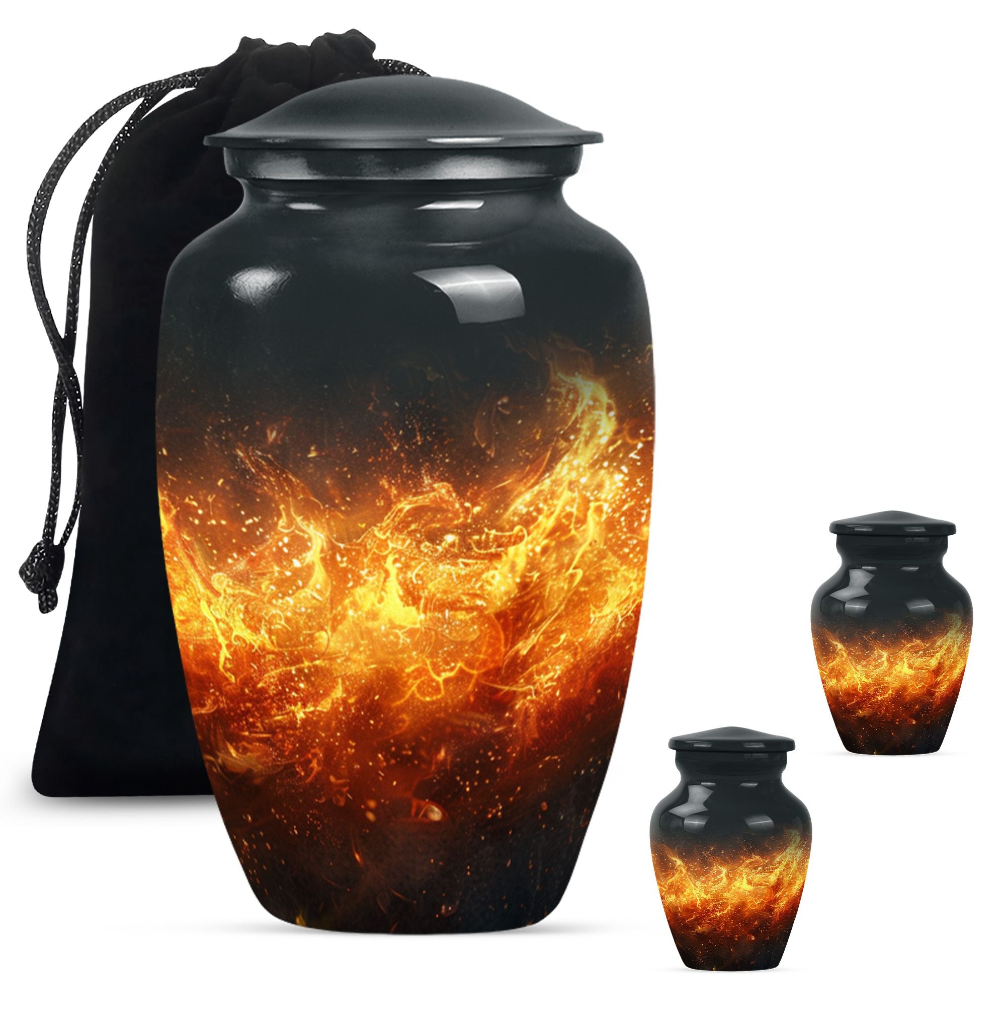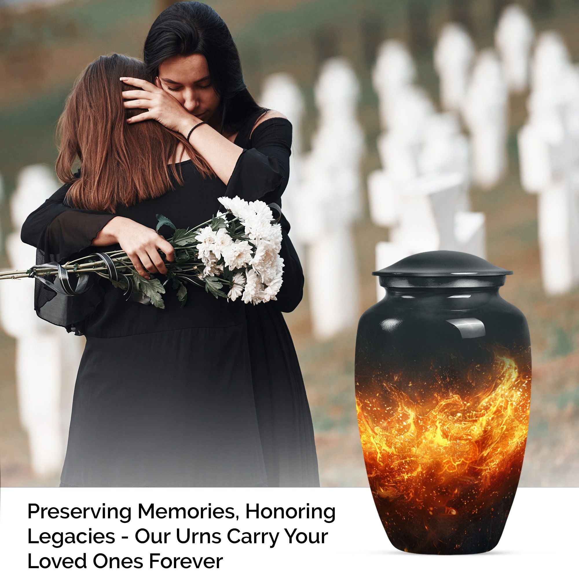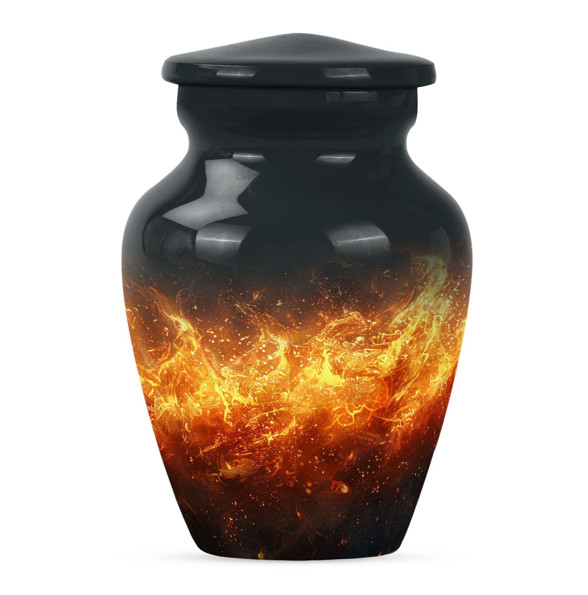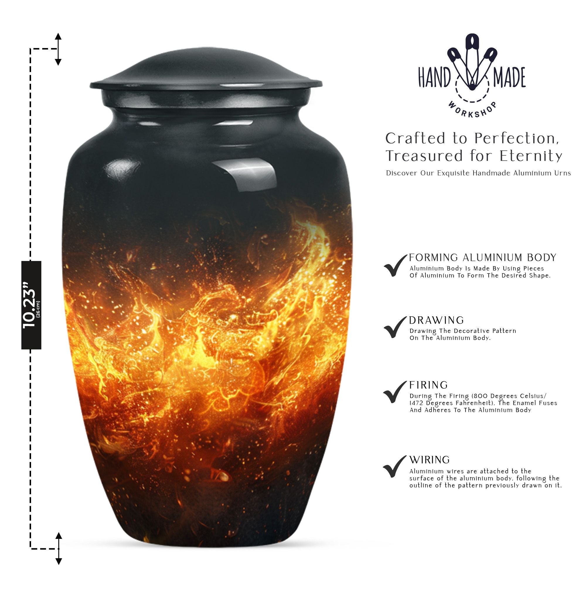 This classic fire urn is an elegant and respectful option in memorial ceremony supplies. Made from durable aluminium, this large urn for an adult man is both practical and elegant. Measuring at a height of 10 Inches, the weight of this urn is 3.3 pounds. It has a capacity to securely hold up to 200 cubic inches of cremation ashes, ensuring your loved one's memory is preserved. This urn for funeral ashes comes with a velvet pouch, offering an additional layer of containment and protection. The urn can be personalized with engraved names, allowing for meaningful customization. Although its design follows an abstract theme, it maintains its classical elegance. This unique, innovative urn for human ashes ensures a robust and honoring memorial product. Uncommonly used in the category of urns for cremation ashes, this modern urn stands out with its notable terminology. Note: The urn design and details mentioned do not refer to its physical appearance.