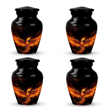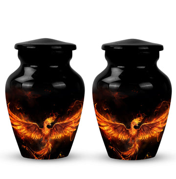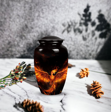 Cherish the memories of your departed loved ones with our Fire Phoenix Memorial Urn. This 3-inch, large-sized aluminium urn is robust yet lightweight at just 3.3 pounds, and skillfully crafted to stand at 10 inches of reverence. This Funeral Urn is uniquely characterized by its classic urn design that's impeccably pleasing to the eyes. The urn is substantial, with a 200 cubic inches capacity, enough to hold the ashes of your loved ones with room to spare. For ease of management, it comes with a velvet pouch for the containment of ashes. Even more, our memorial urns offer a unique touch - they can be personalized with engraved names. This adds an element of reverence, making the urn not just an ashes holder for cremation, but a decorative urn for human ashes. Purchase now to experience not just a container for human ashes, but an ashes keepsake for your lost, but never-forgotten loved ones.