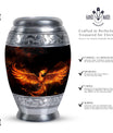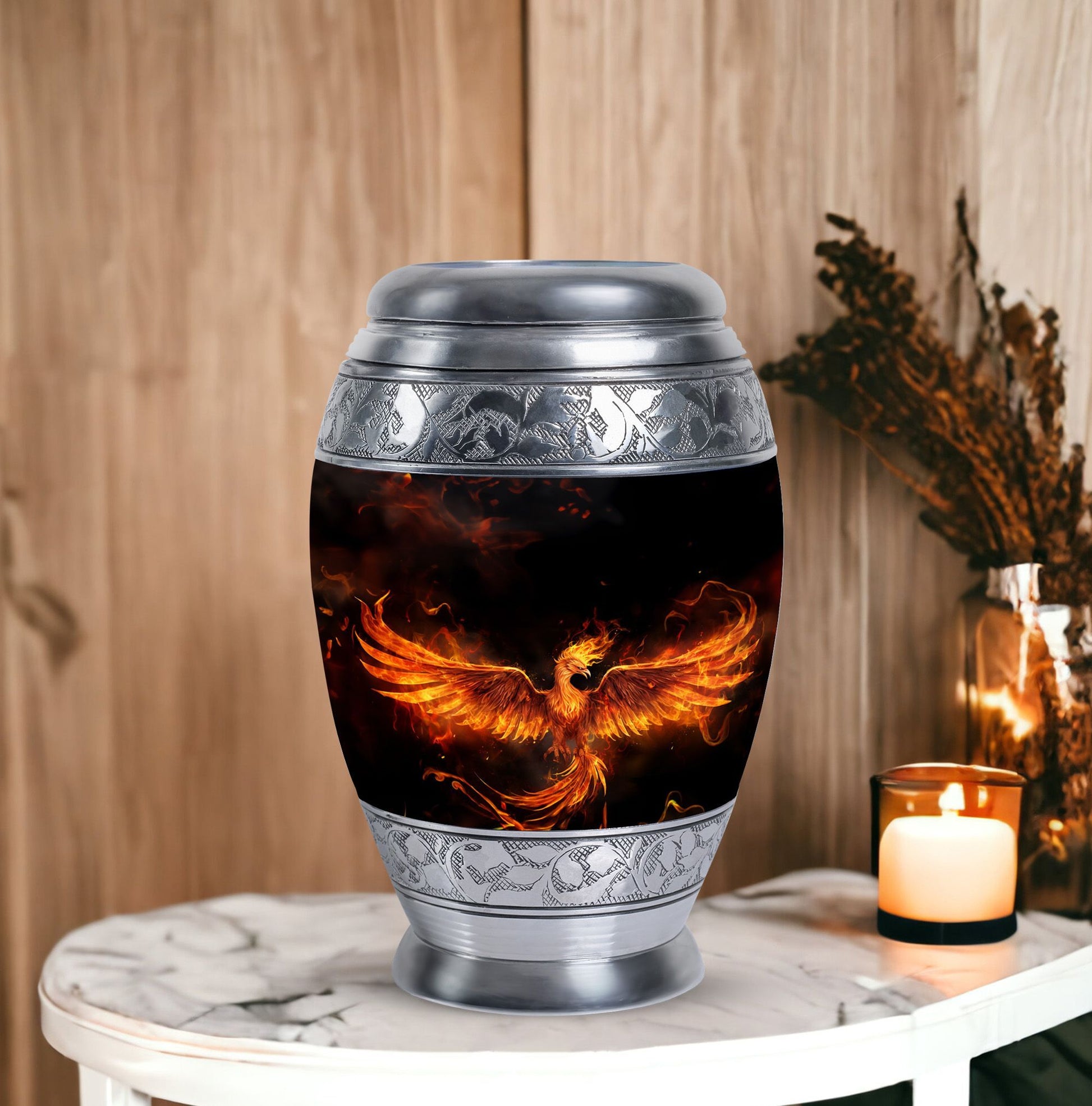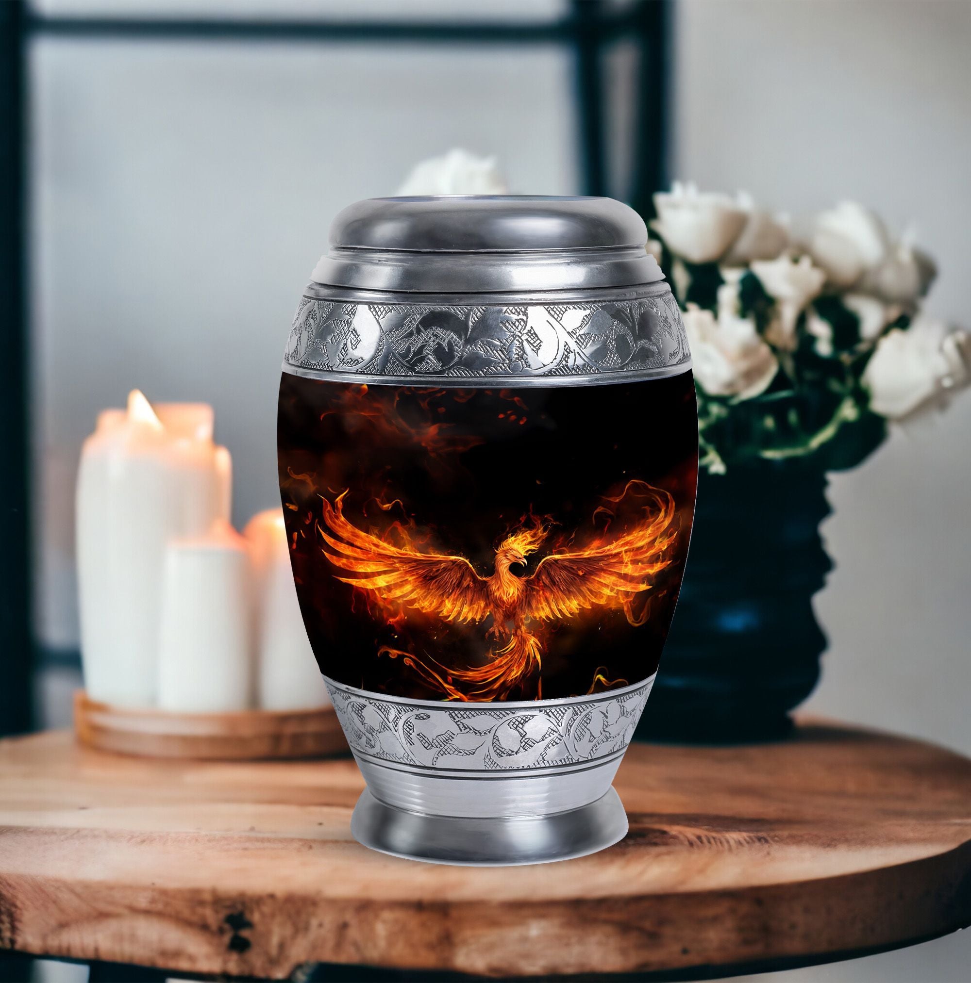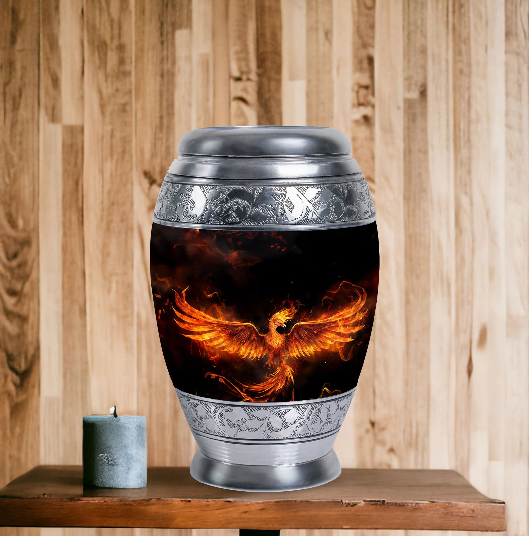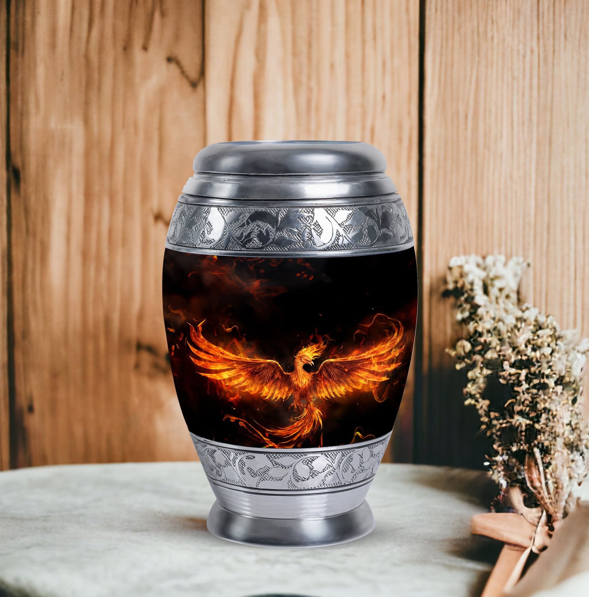 Discover a dignified and lasting memorial with the Fire Phoenix Memorial Urn. Designed to provide an exceptional resting place, this large urn allows up to 200 cubic inches of ashes, a fitting tribute for your loved ones. Expertly crafted from durable and lightweight aluminium, it stands at an impressive 10 inches height and weighs a sturdy 3.3 pounds. Our funeral urns, ideal for seniors and adults alike, can be personalized with engraved names, taking memorization to a uniquely intimate level. Measuring at convenient 3 inches in size, each urn comes with a soft velvet pouch for safe containment of ashes. Embrace the remembrance with our Memorial Urns tailored to provide a peaceful and warm tribute that lasts. The collective charm of decorative urns for human ashes, ashes holders for cremation, or containers for human ashes creates a serene aura, especially for moms ashes. Uncover the grace of remembering with our enticing Fire Phoenix Memorial Urn.
