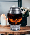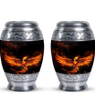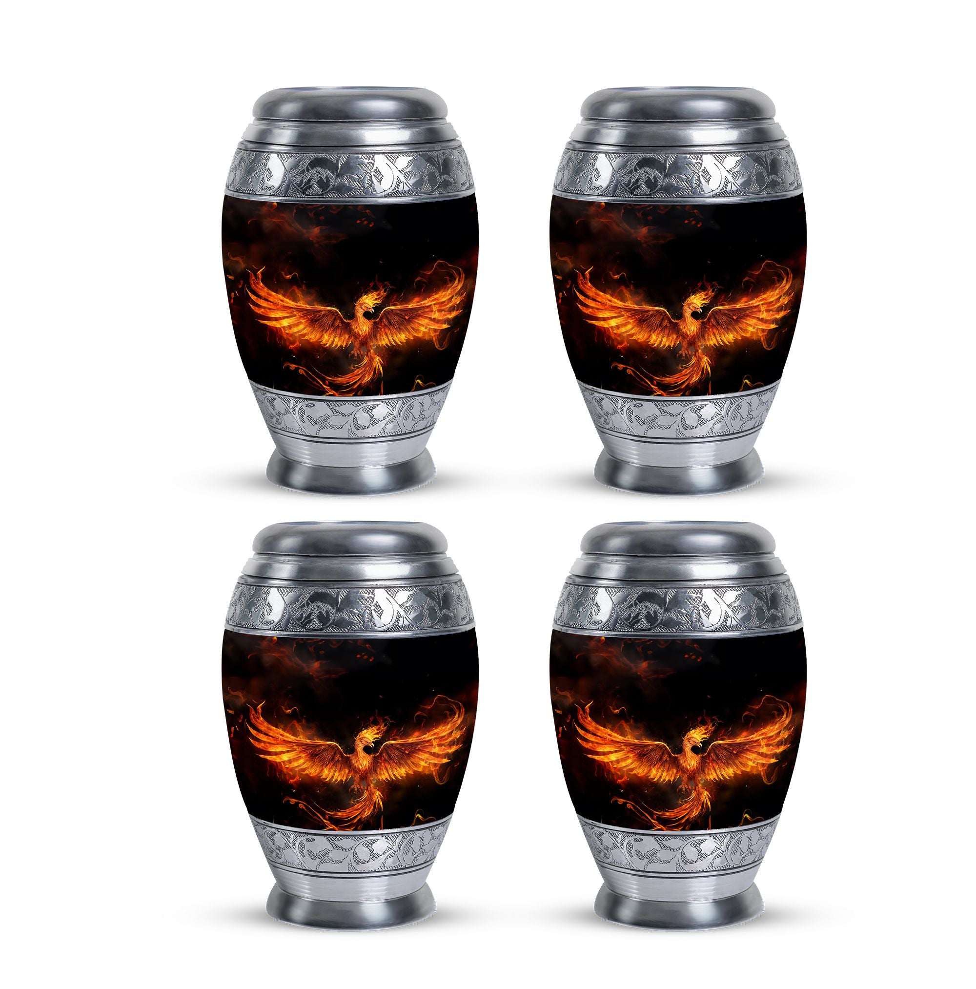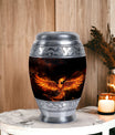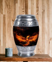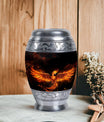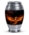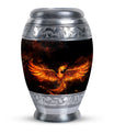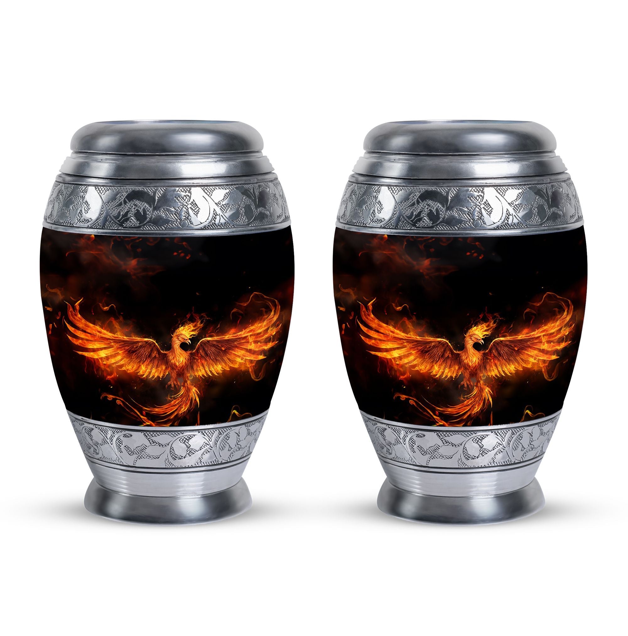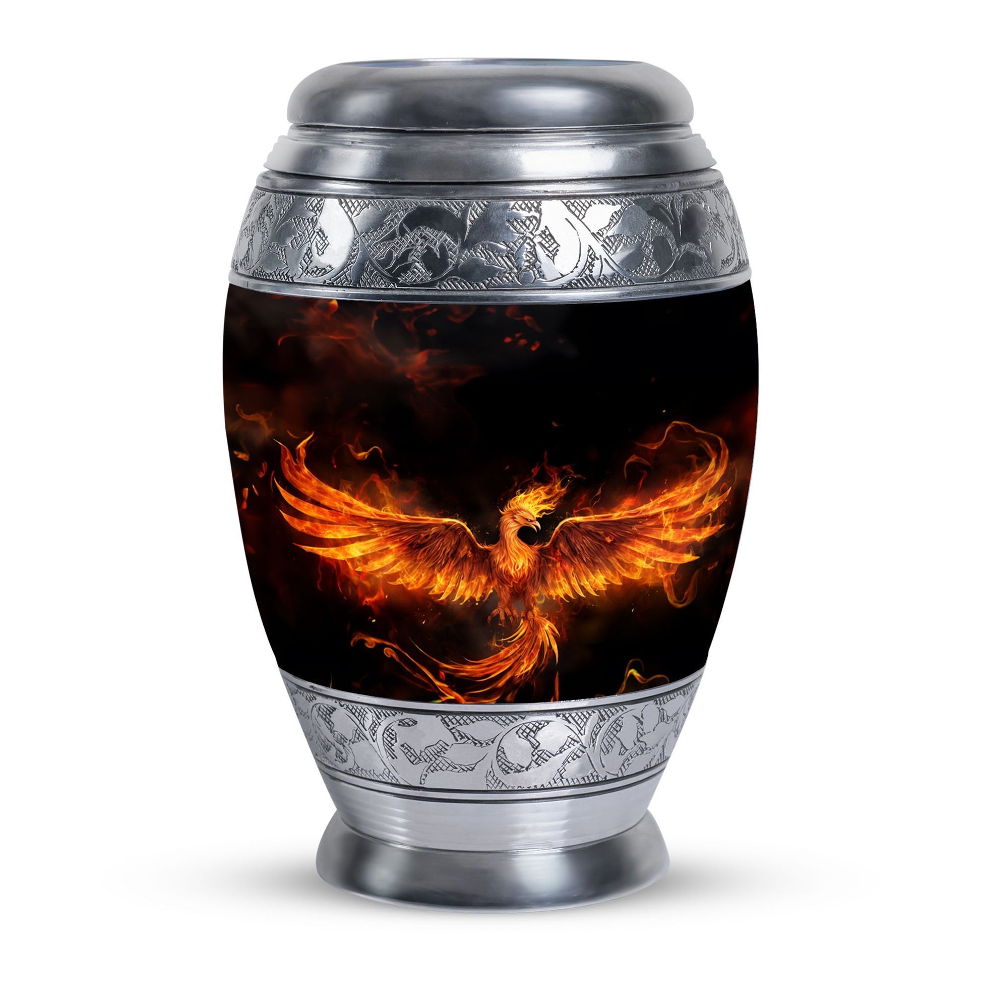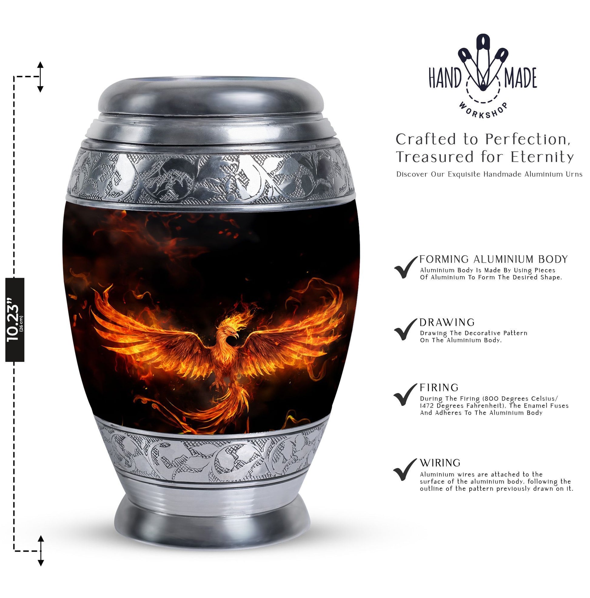 Discover a dignified and lasting memorial with the Fire Phoenix Memorial Urn. Designed to provide an exceptional resting place, this large urn allows up to 200 cubic inches of ashes, a fitting tribute for your loved ones. Expertly crafted from durable and lightweight aluminium, it stands at an impressive 10 inches height and weighs a sturdy 3.3 pounds. Our funeral urns, ideal for seniors and adults alike, can be personalized with engraved names, taking memorization to a uniquely intimate level. Measuring at convenient 3 inches in size, each urn comes with a soft velvet pouch for safe containment of ashes. Embrace the remembrance with our Memorial Urns tailored to provide a peaceful and warm tribute that lasts. The collective charm of decorative urns for human ashes, ashes holders for cremation, or containers for human ashes creates a serene aura, especially for moms ashes. Uncover the grace of remembering with our enticing Fire Phoenix Memorial Urn.