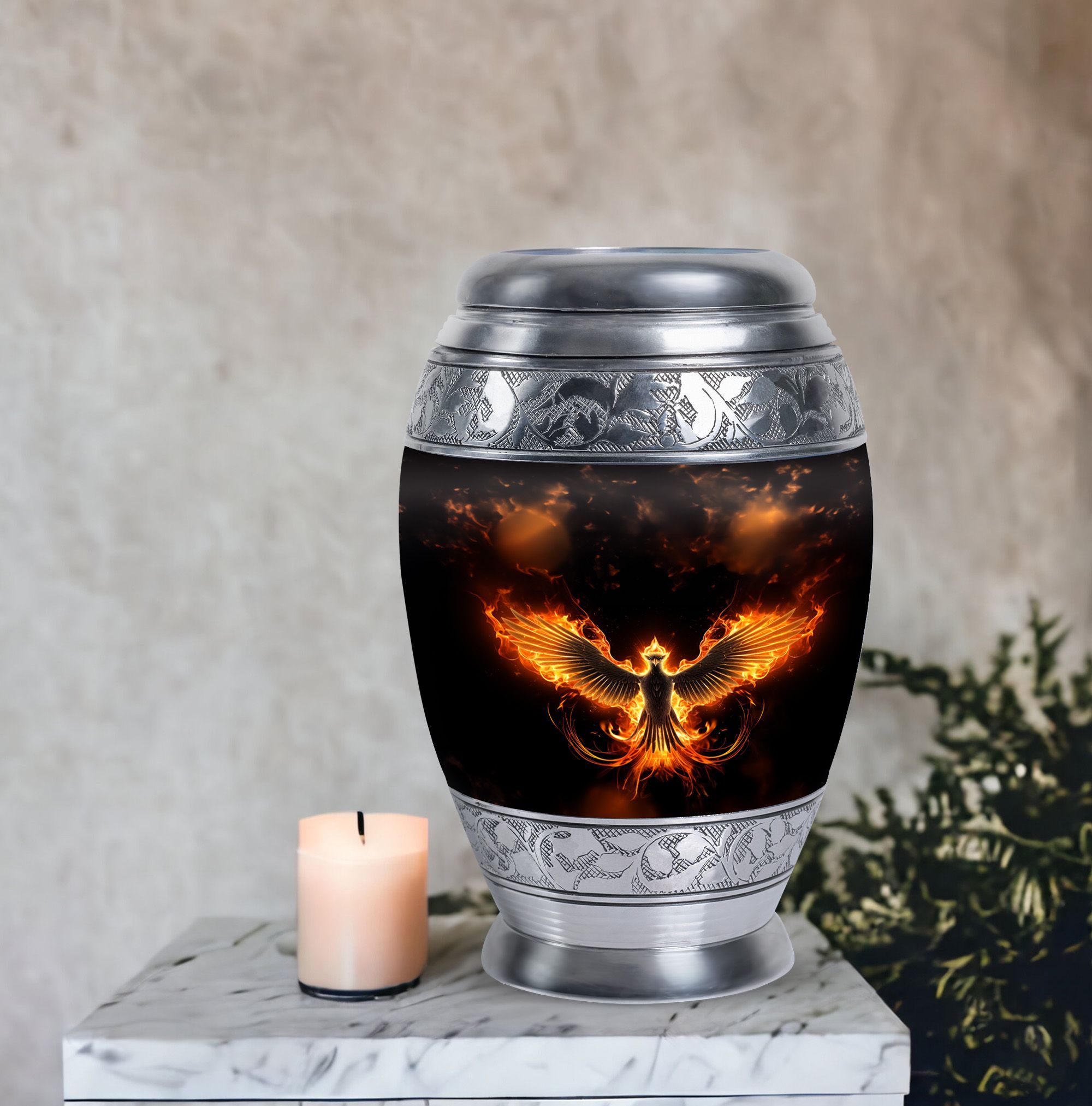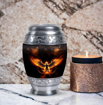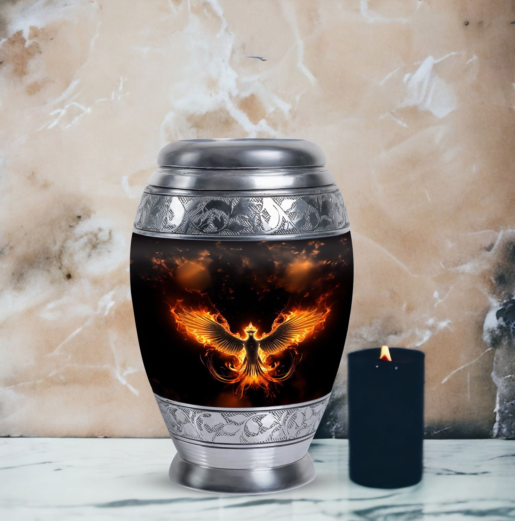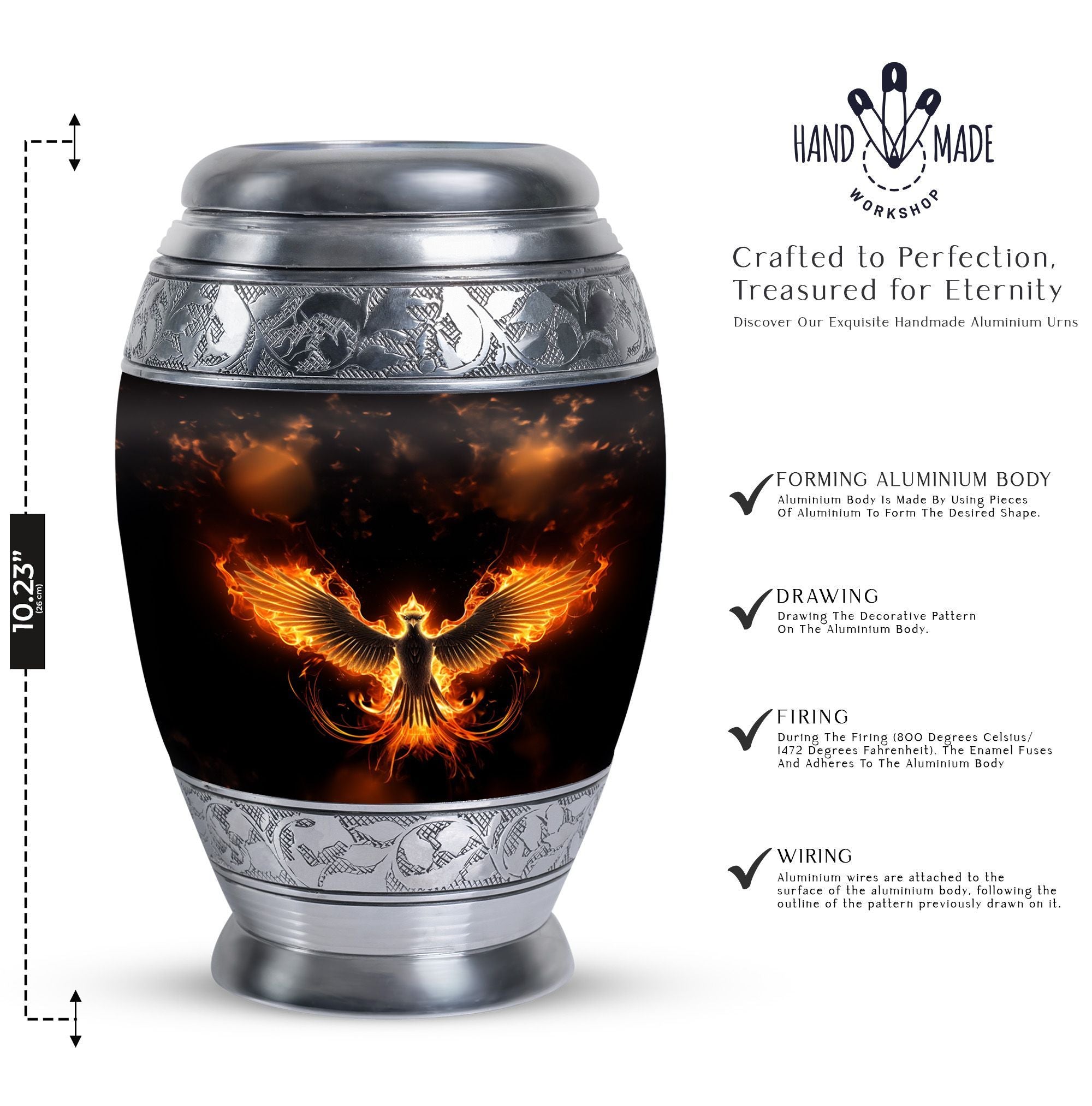 Discover the grandeur of our Fire Phoenix Cremation Urn, a stirring tribute to beloved adults or seniors transitioning to their spiritual life. Crafted in high-quality aluminium, this urn has a carrying capacity of up to 200 cubic inches. Amongst the Large Urn category, it's a standout with a weight of 3.3 pounds and dimensions that measure 10 inches in height. We use an amalgamation of materials designed to hold the sacred remains of your departed loved ones securely. Our cremation urns come with a inclusive velvet pouch for safe containment of ashes, adding an exquisite touch to this ceremonial art piece. Personalize your token of love by engraving names to make this memorial item special. Whether you are seeking Burial Urns for Adults, Urn Container or Urns for Dad, our range of urns fits all these requirements impeccably.