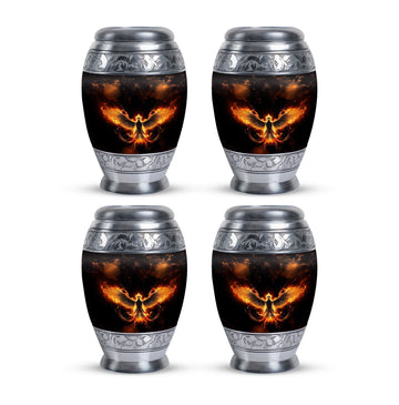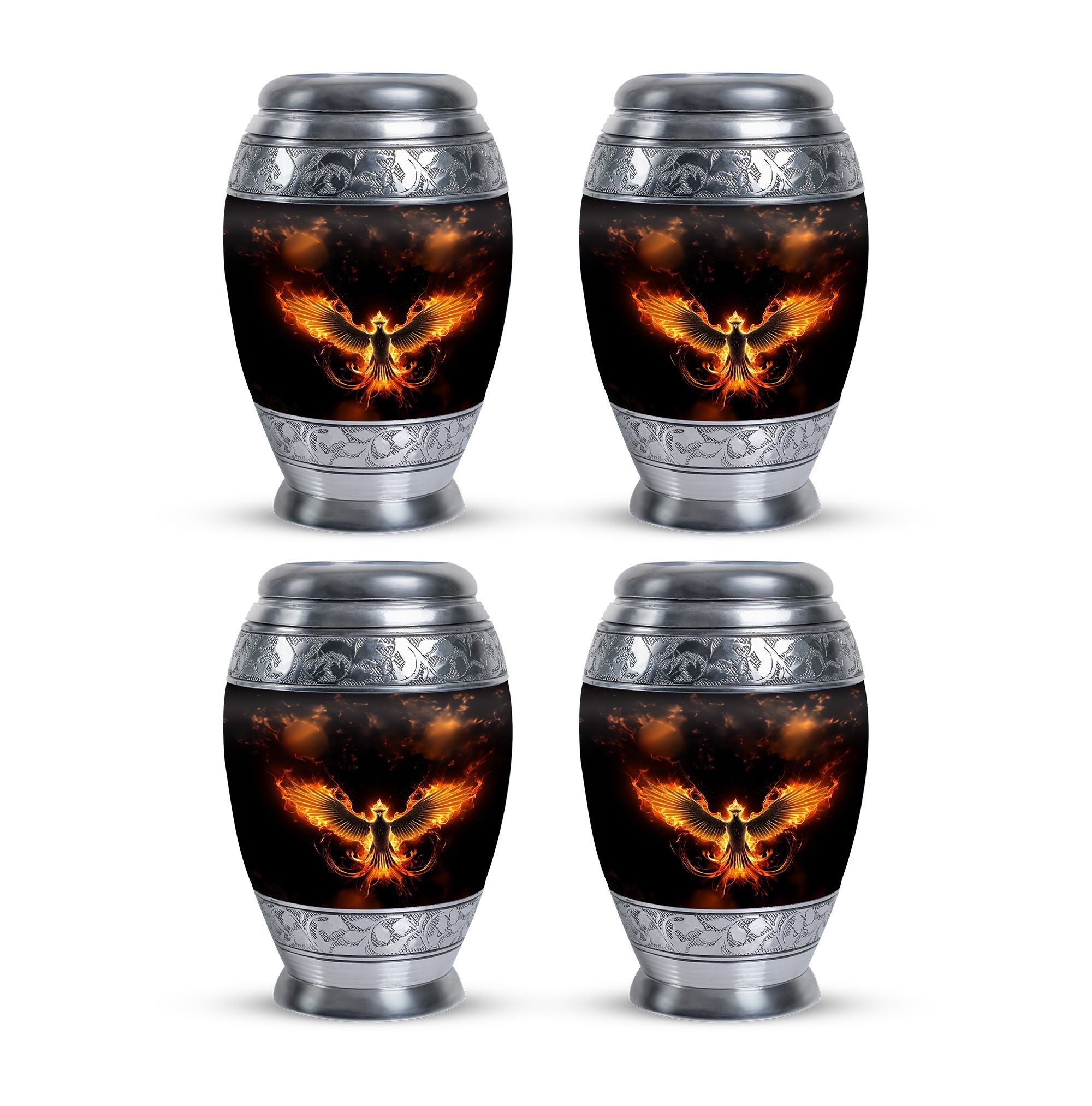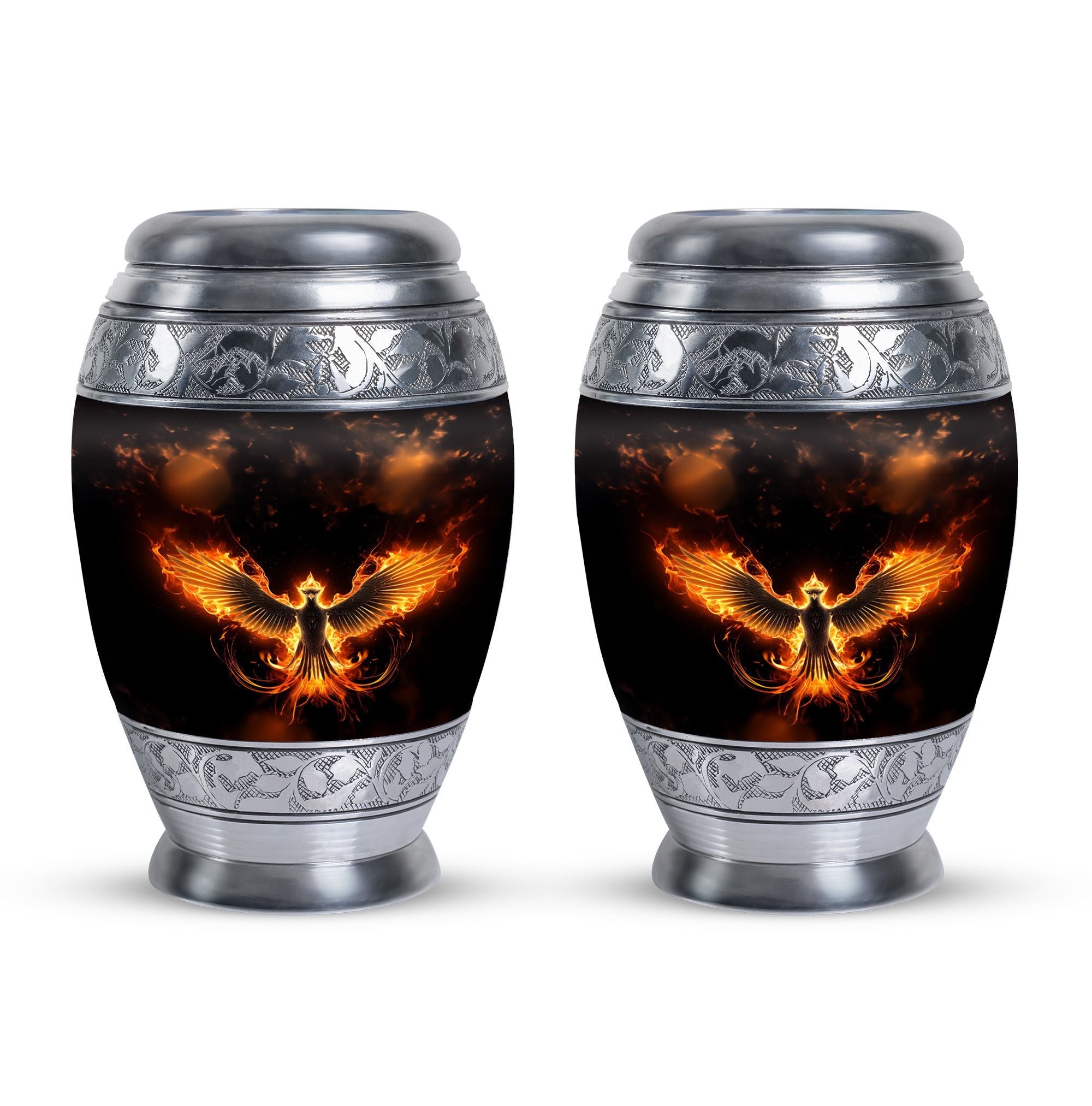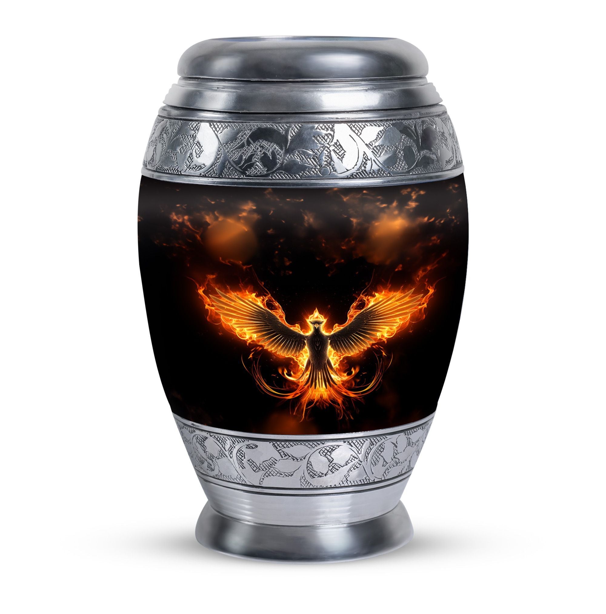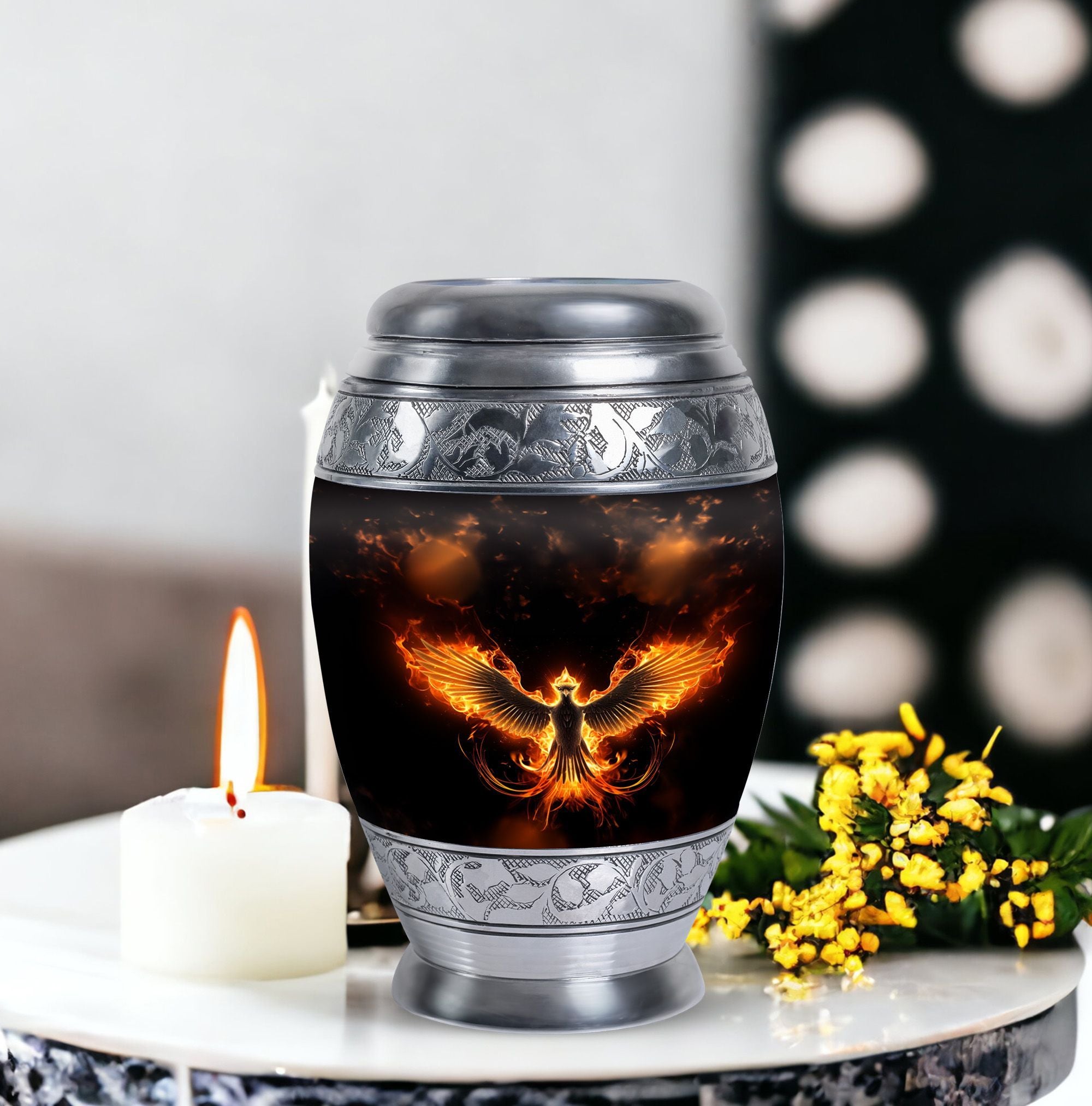 Discover the grandeur of our Fire Phoenix Cremation Urn, a stirring tribute to beloved adults or seniors transitioning to their spiritual life. Crafted in high-quality aluminium, this urn has a carrying capacity of up to 200 cubic inches. Amongst the Large Urn category, it's a standout with a weight of 3.3 pounds and dimensions that measure 10 inches in height. We use an amalgamation of materials designed to hold the sacred remains of your departed loved ones securely. Our cremation urns come with a inclusive velvet pouch for safe containment of ashes, adding an exquisite touch to this ceremonial art piece. Personalize your token of love by engraving names to make this memorial item special. Whether you are seeking Burial Urns for Adults, Urn Container or Urns for Dad, our range of urns fits all these requirements impeccably.