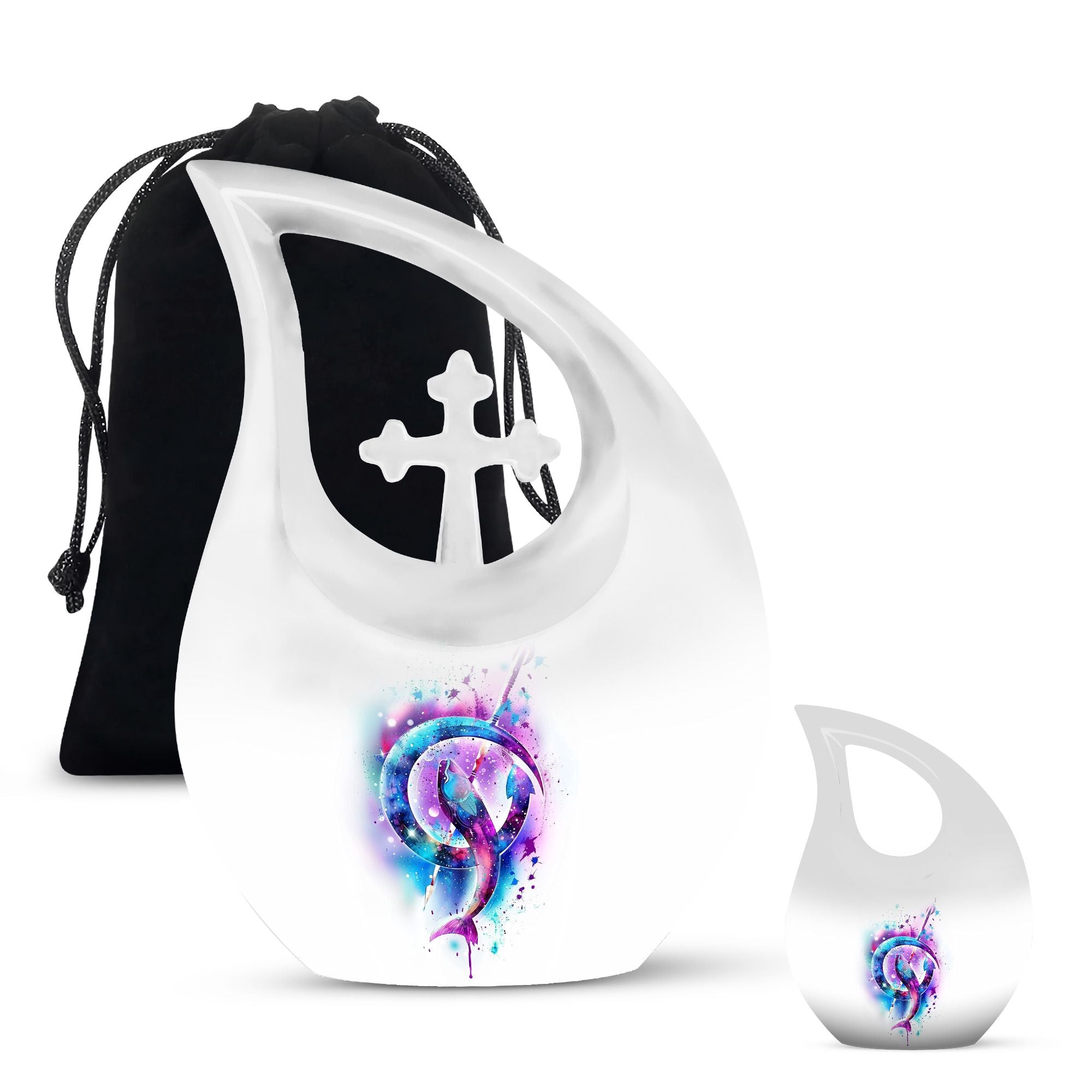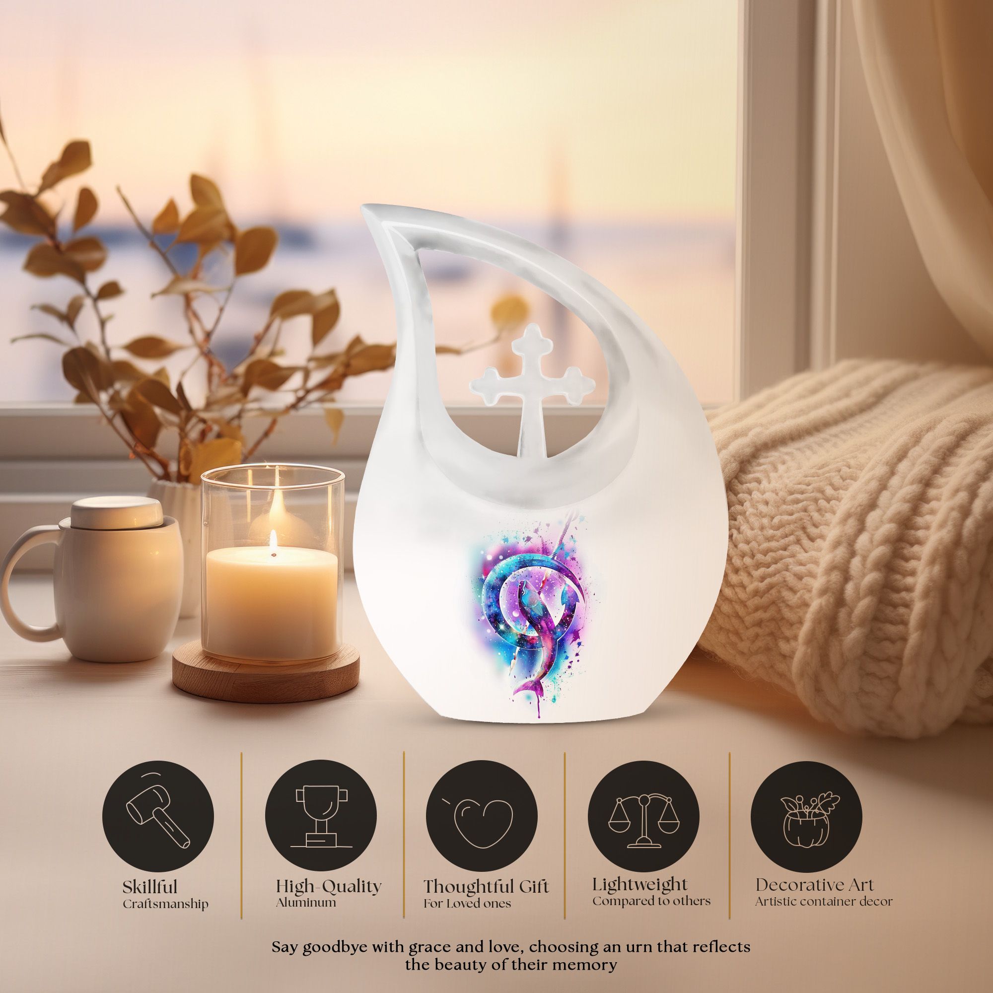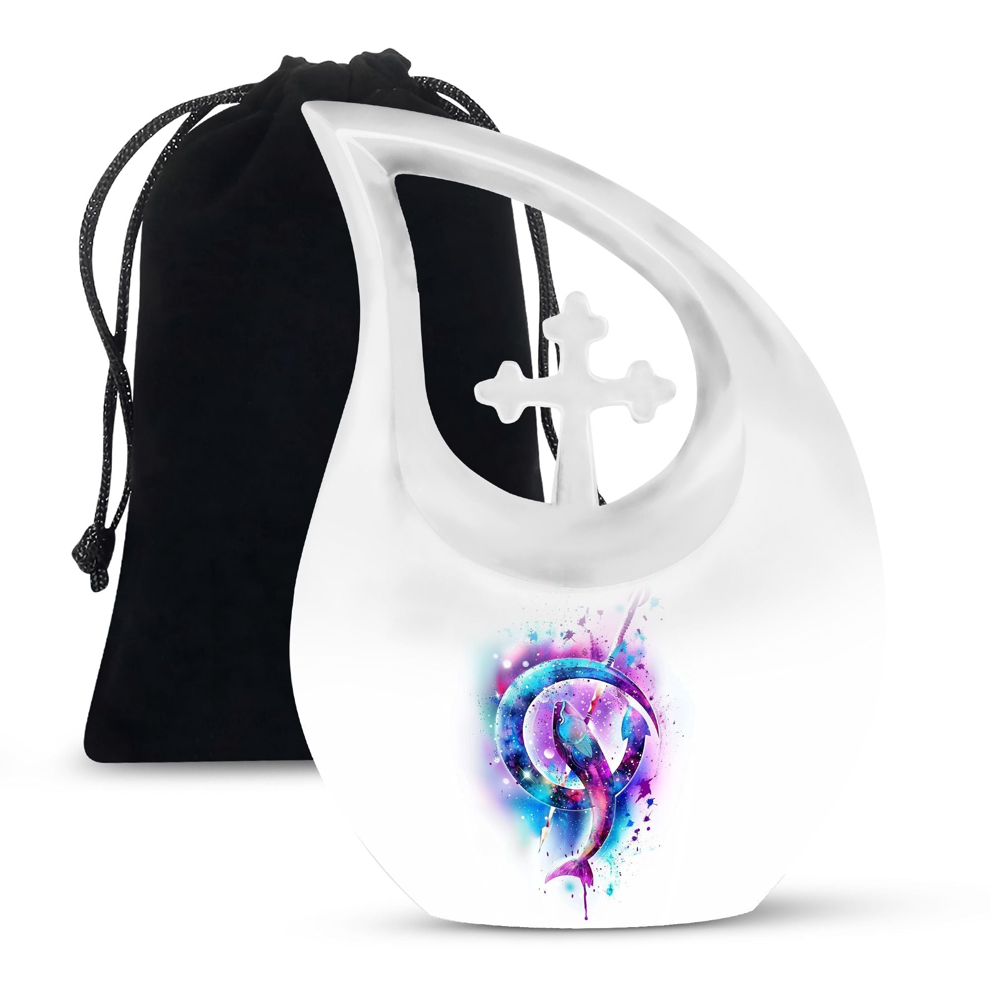 Made from high-quality aluminium, this large decorative urn for human ashes features a detailed fish motif set against a pure white finish, symbolizing harmony and spiritual strength. Designed as an urn human ashes large, it offers generous capacity and secure protection with its screw-top lid. Families seeking an urn large adult or a large urn human ashes piece will appreciate its sturdy construction and timeless aesthetic. A matching small urn for ashes for women may also complement your memorial arrangement if needed.