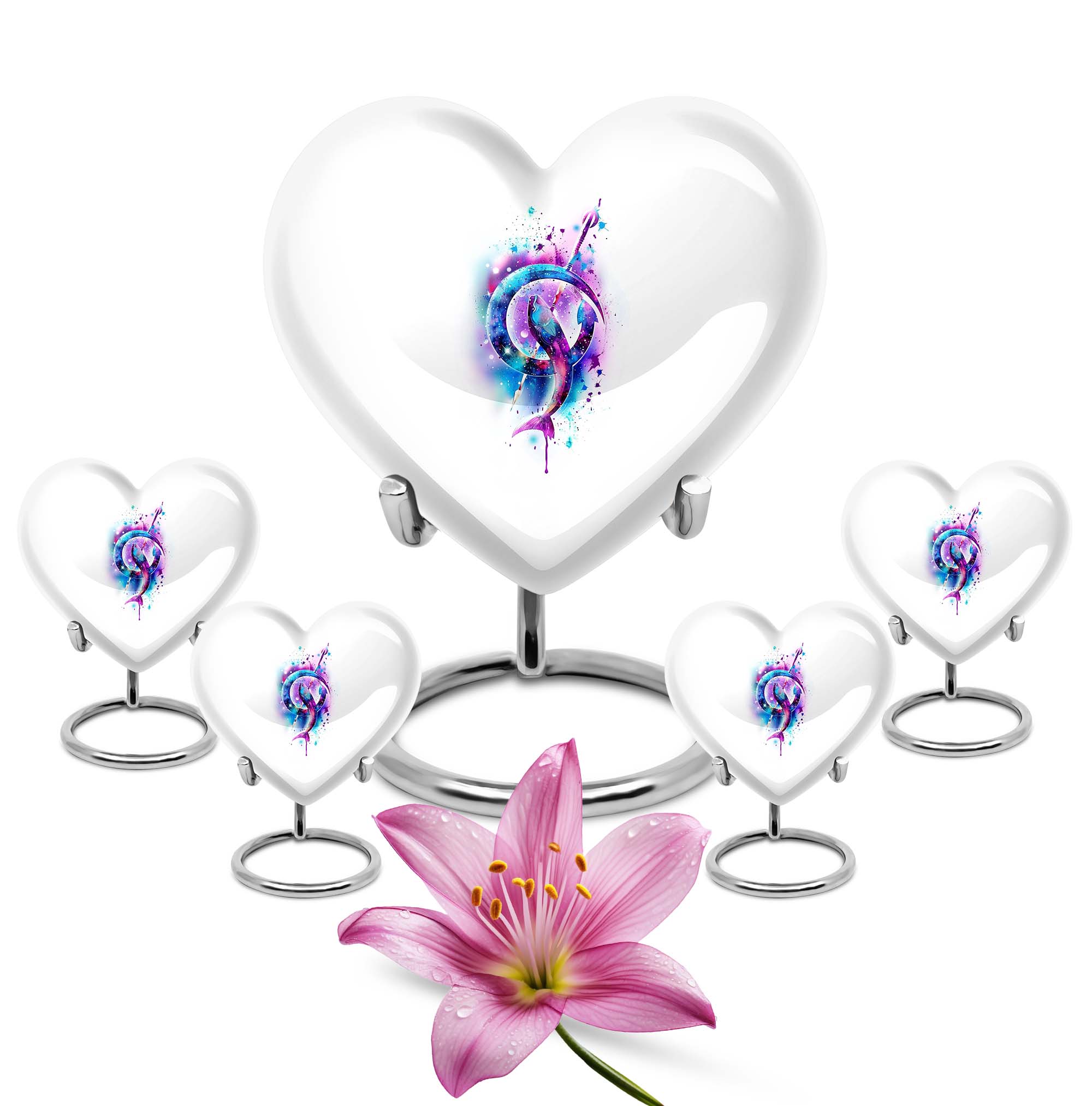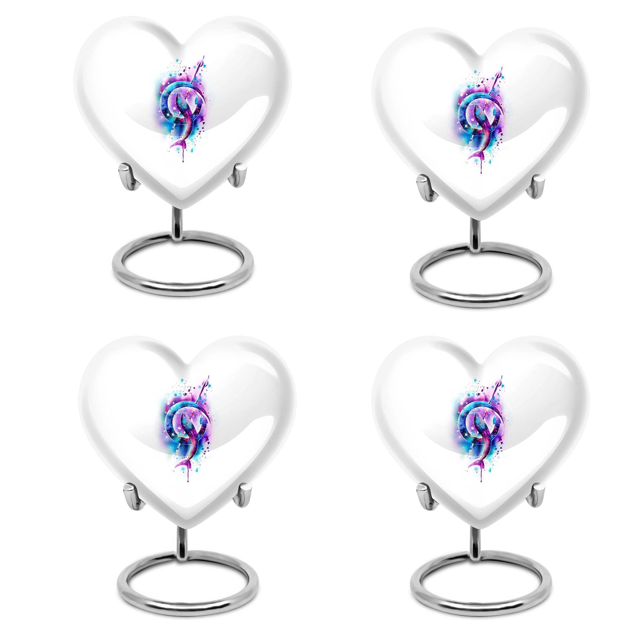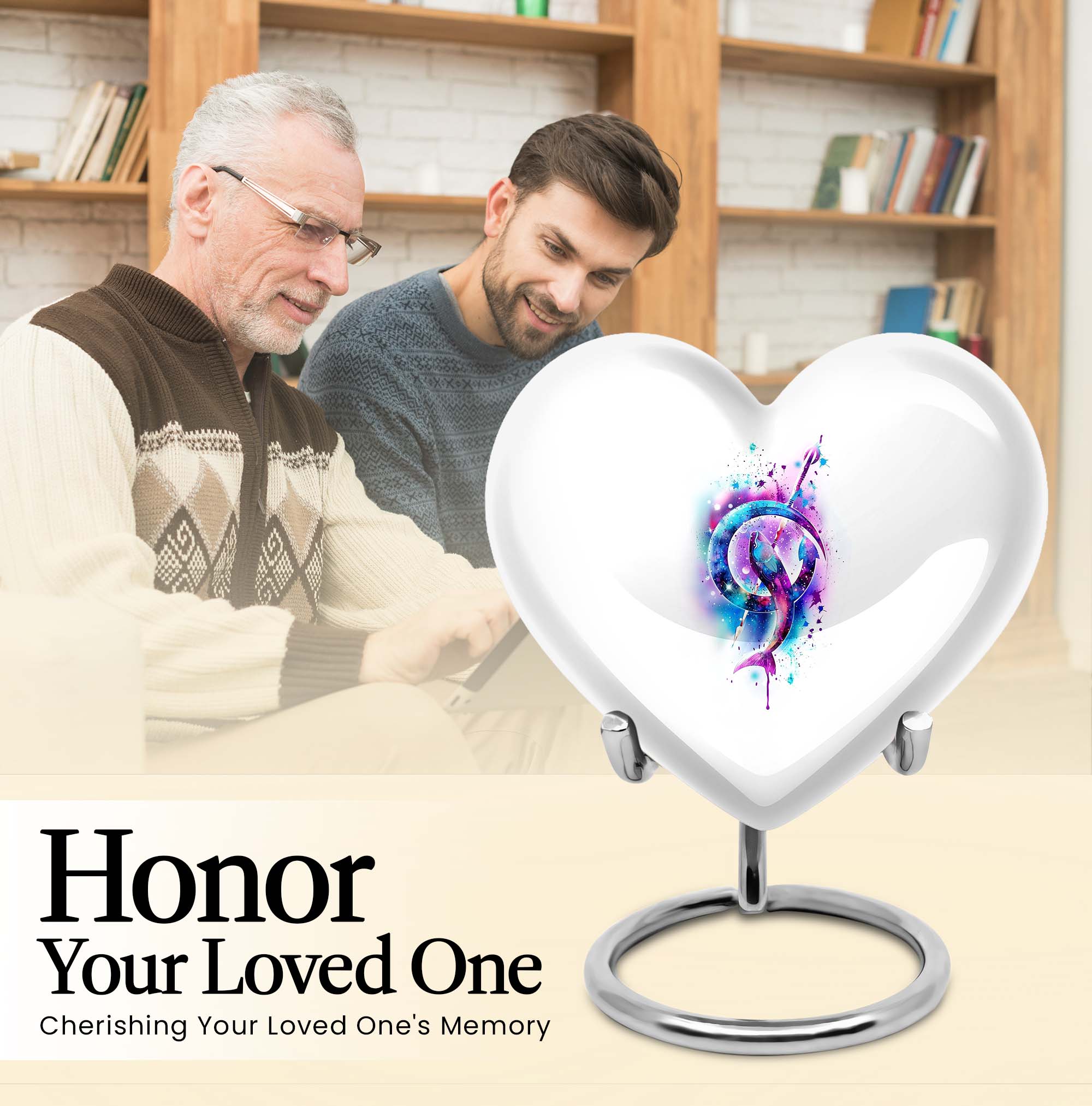 Pay tribute to a loved one or celebrate a cherished life with our Abstract Heart Urn, an attractive commemorative solution embodying love and everlasting memories. This 10-inch, fish-themedn urn is crafted from sturdy aluminium, notably weighing just 3.3 pounds, that balances durability with ease of handling. Easily accommodating up to 200 cubic inches of remnants, this urn is ideal for an adult male but can also serve as a companion cremation urn for two adults. This large urn also extends customization options to further personalize your tribute, with the ability to engrave names. Packaged with a velvet pouch, the urn not only protects the sacred remnants but also lends an additional layer of respect to the departed. Appease your search for 'memorial urn for adult male', 'funeral medium size urns for human ashes', or 'urns for human ashes adult'. With this captivating heart urn, rest assured your loved ones will be honored in a manner they deserve.