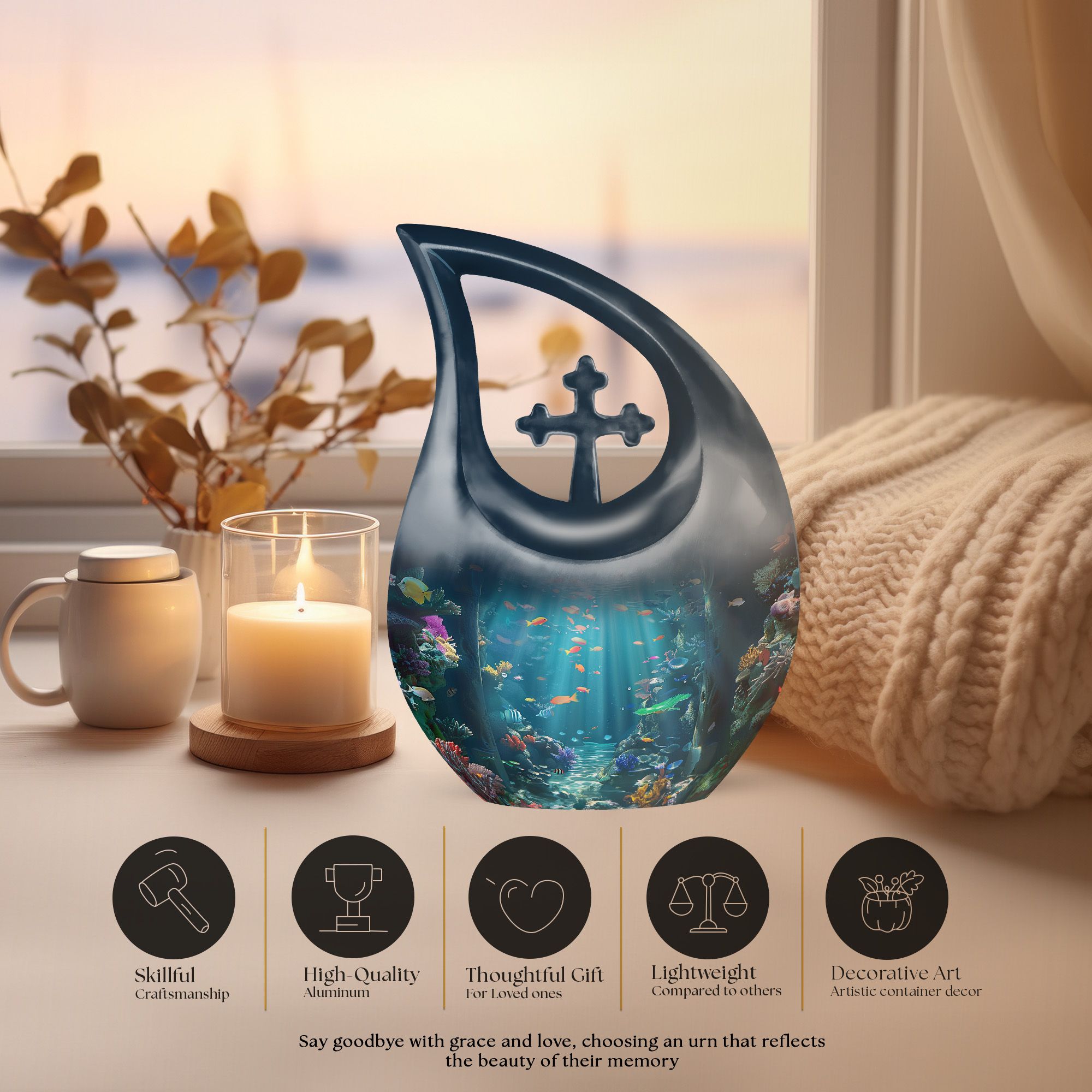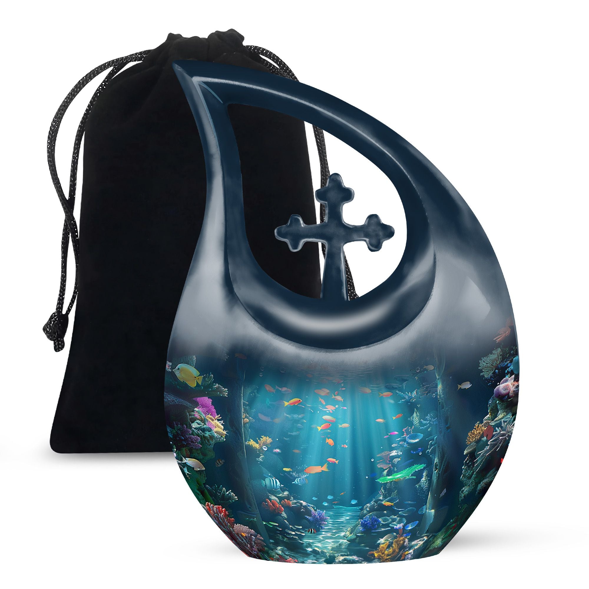 Expertly handcrafted from durable aluminum, this cremation urn adult large features a rich deep blue finish accented by an elegant fish design, symbolizing serenity and spiritual continuity. Its sleek, polished surface and secure screw-top lid ensure long-lasting preservation, making it one of the finest large cremation urns for human ashes available. Perfect for both men and women, this urn radiates grace and strength.