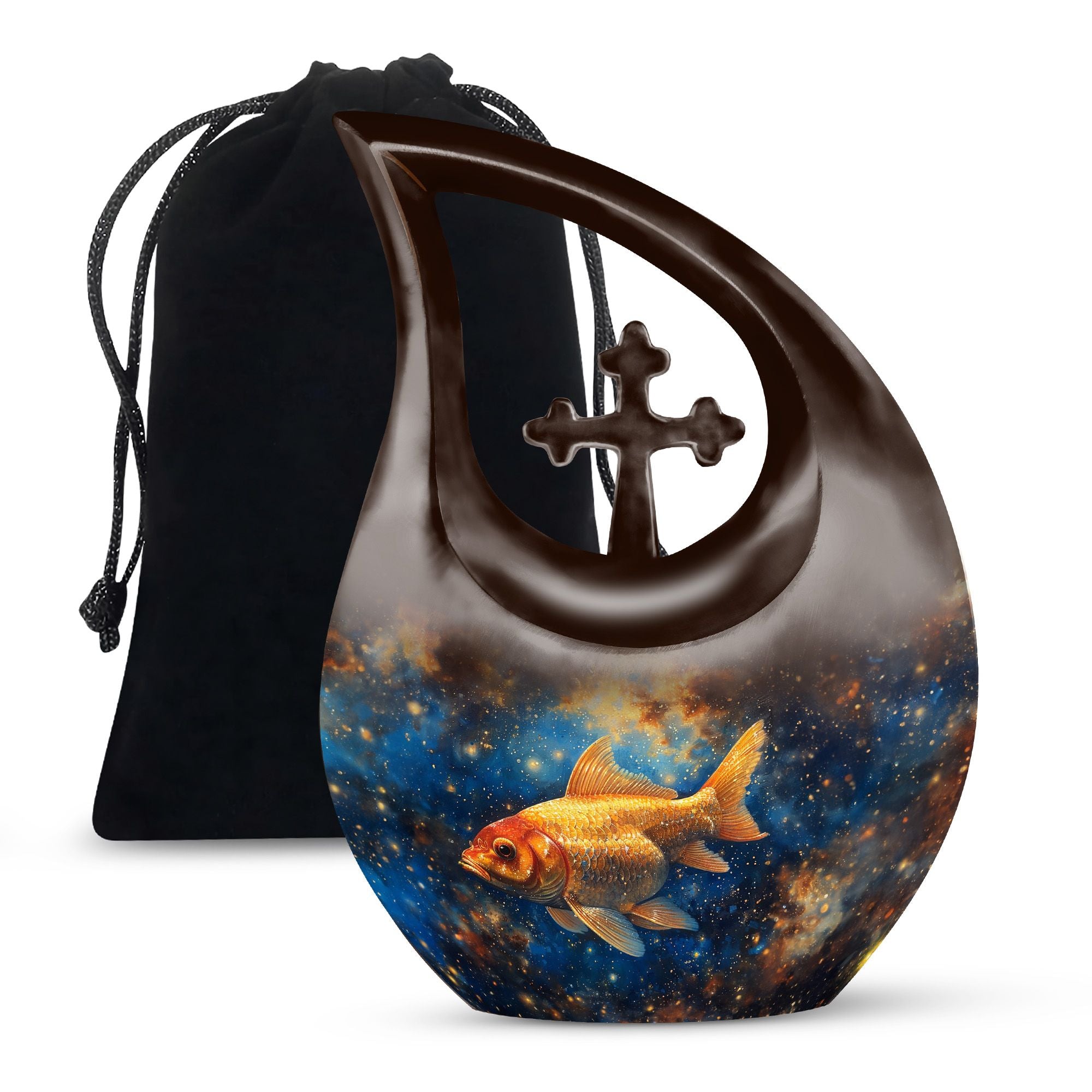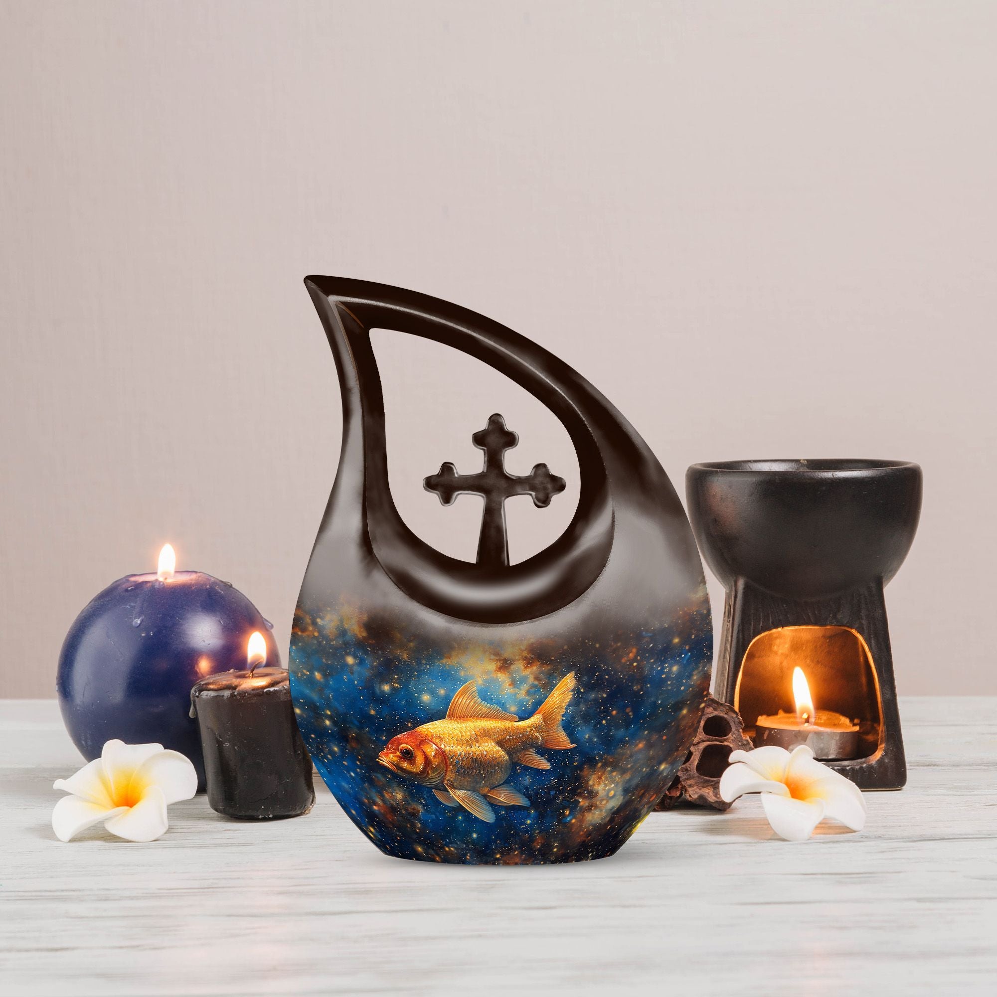 The Golden Fish Cremation Urn offers a tender and symbolic way to honor the memory of a beloved parent. Crafted as a small keepsake urn for human ashes, it represents serenity, hope, and the enduring bond between family members. Its gentle design makes it a comforting choice for those seeking a meaningful remembrance piece for Mom or Dad.