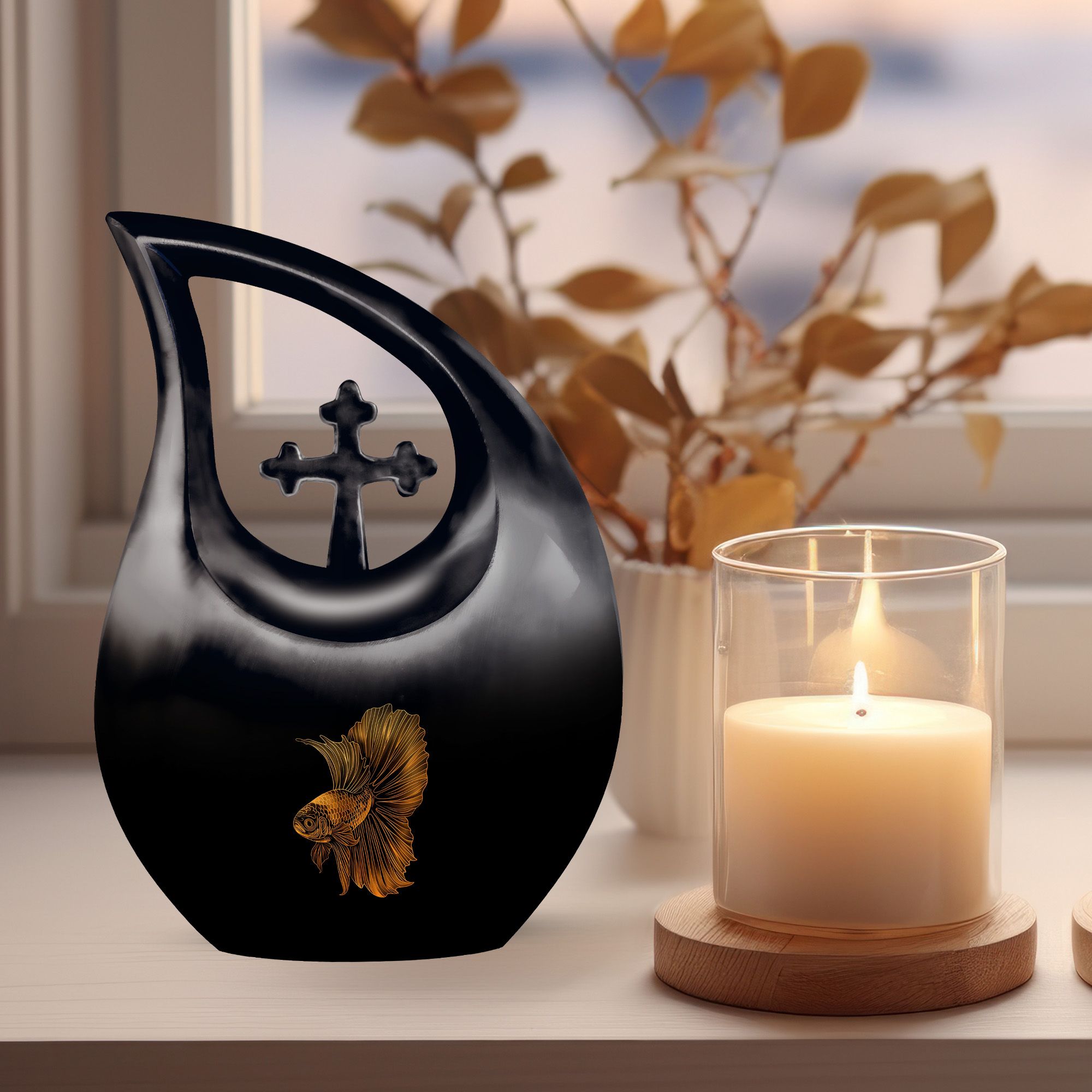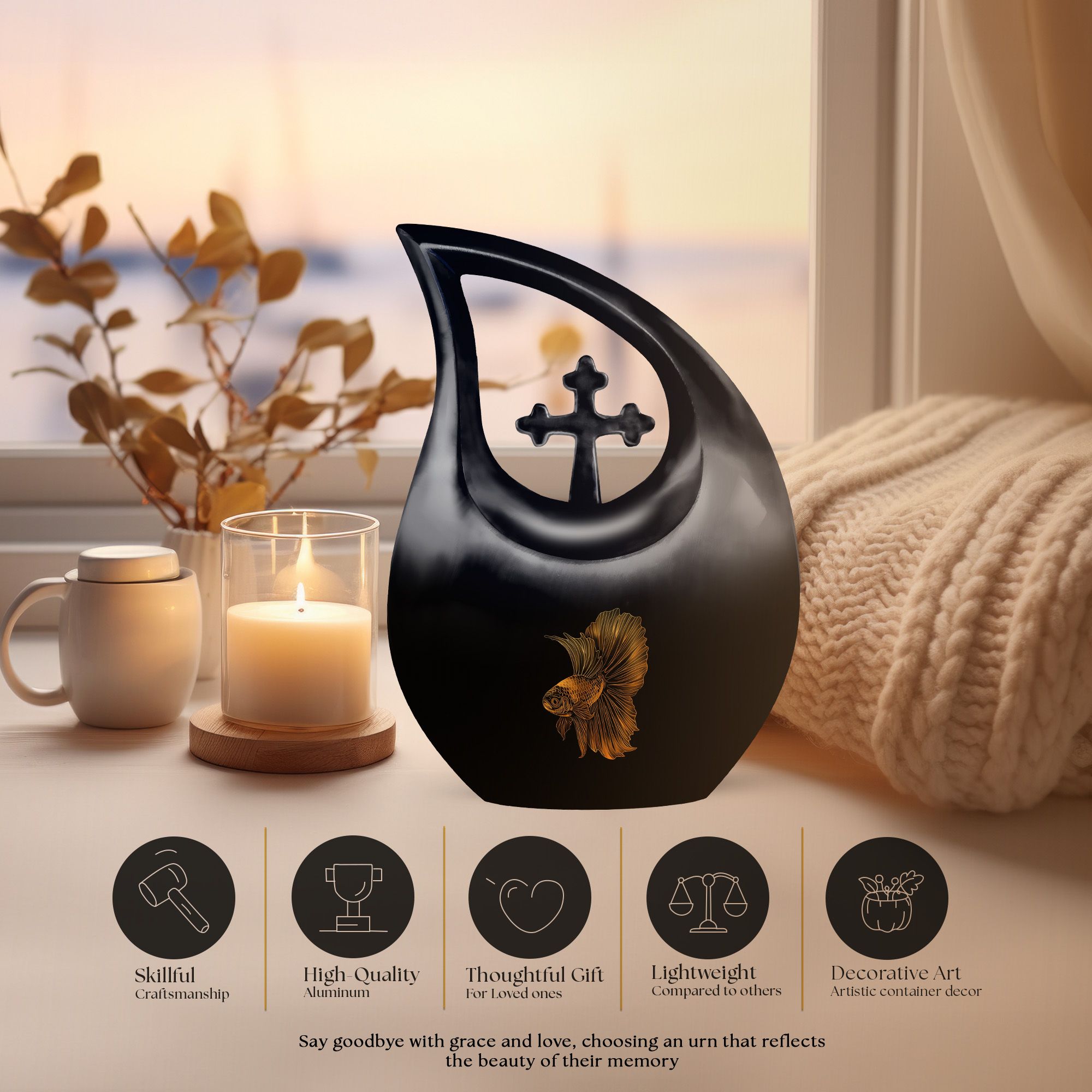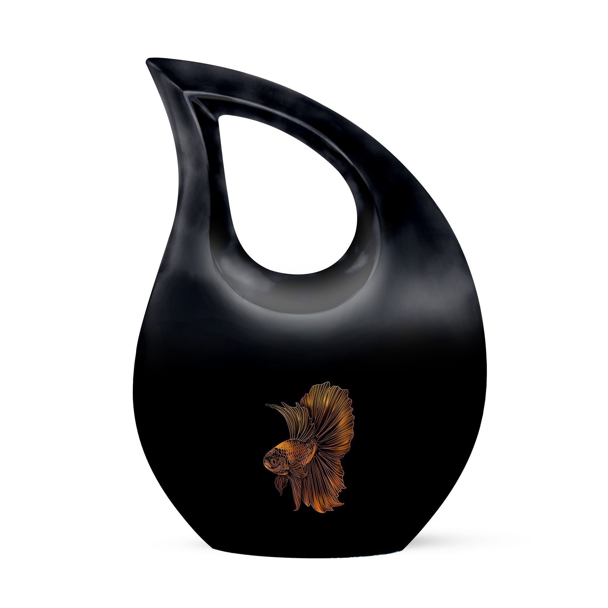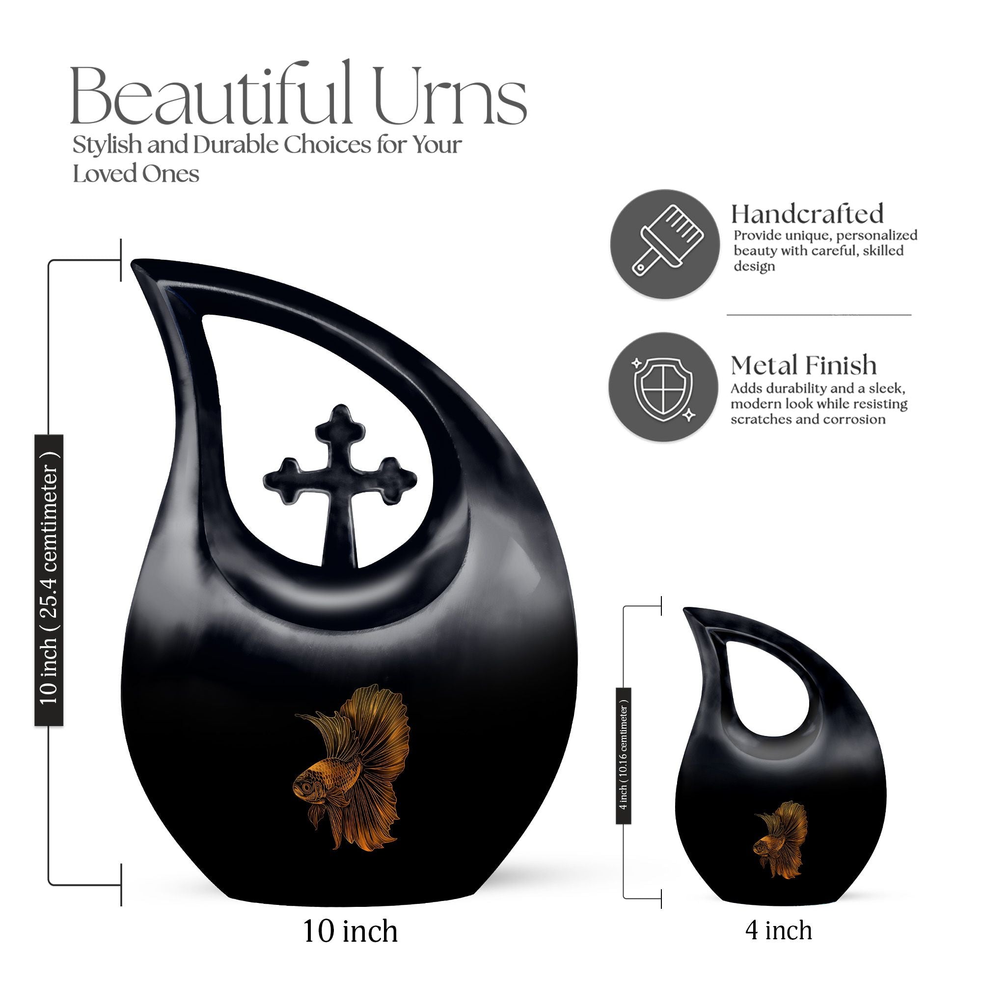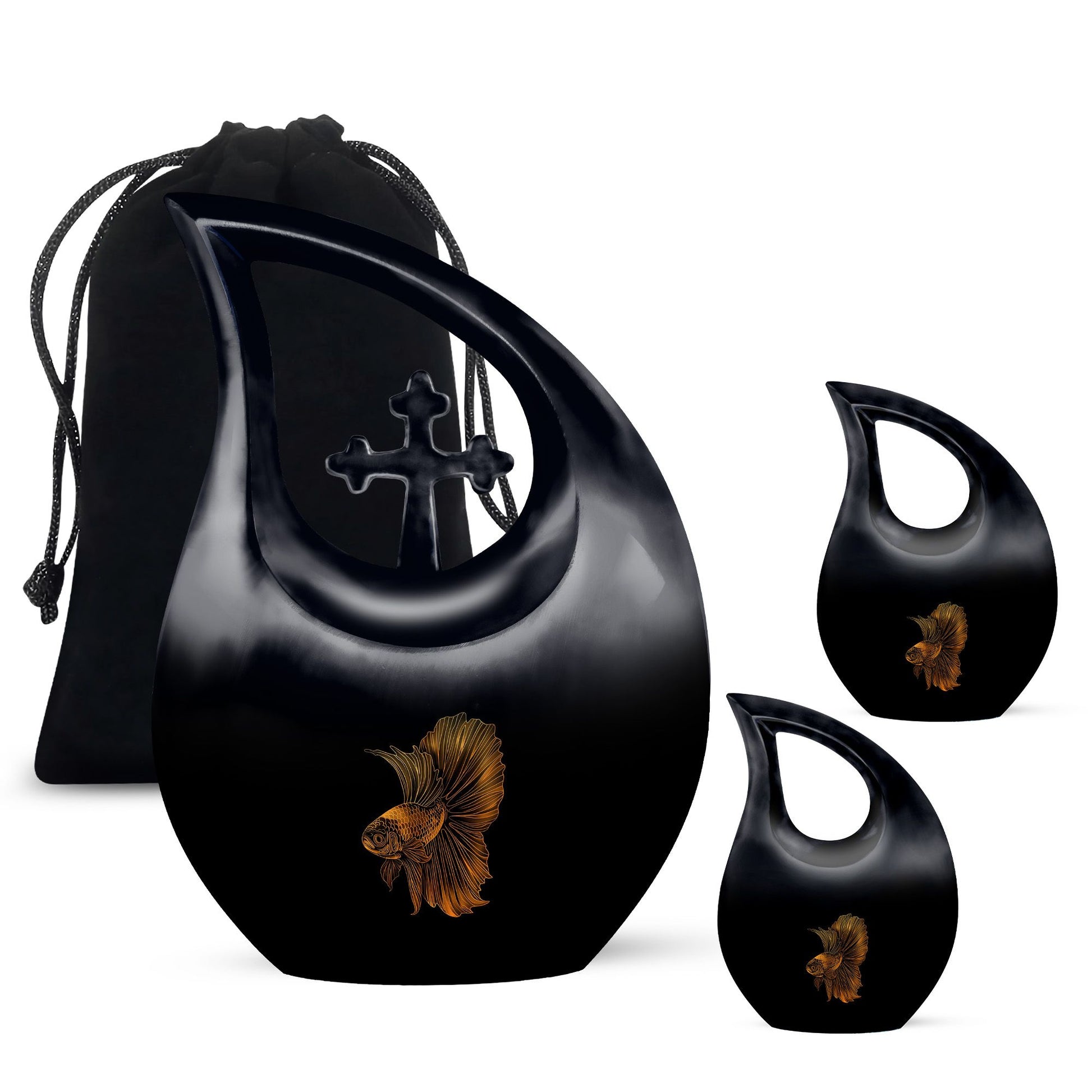 Experience a unique way to immortalise your loved ones with our Fish Urn, a standout in our range of memorial urns. This large size, 10-inch Cremation Box allows you to safeguard their ashes in an area of 200 cubic inches, providing a spacious containment for your precious remembrance. Crafted meticulously from robust aluminium, this urn ensures long-lasting durability, while its Cross Drop theme adds a significant touch of solemn elegance. Its weight of 3.3 pounds signifies robust construction and quality, promising an enduring tribute to your beloved. With your purchase, you'll receive a velvet pouch to securely keep the ashes. To add a deeper level of intimacy, personalize this urn with engraved names, turning it into a special memorial unique to your loved one. This product does not only serve the purpose of an urn, but it also serves as a testament to the legacy left behind by your loved one. Note: Keywords for searches that could be relevant—Purple Urns, Small Urns For Ashes, Urns For Ashes, Mini Urns For Ashes.