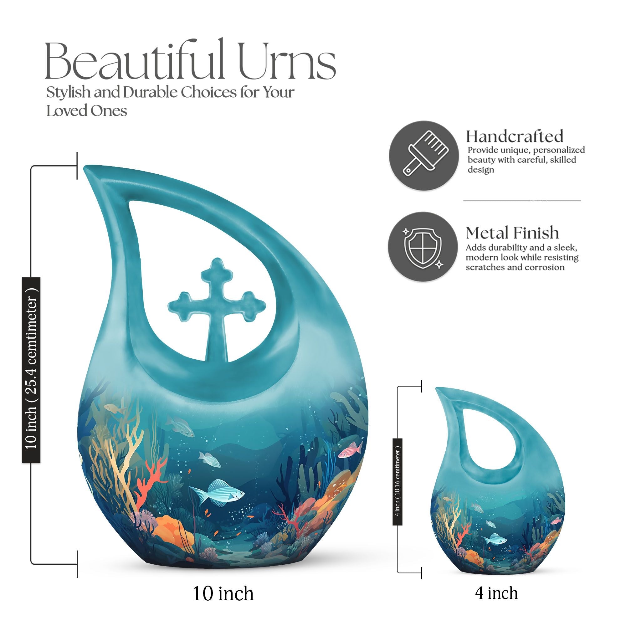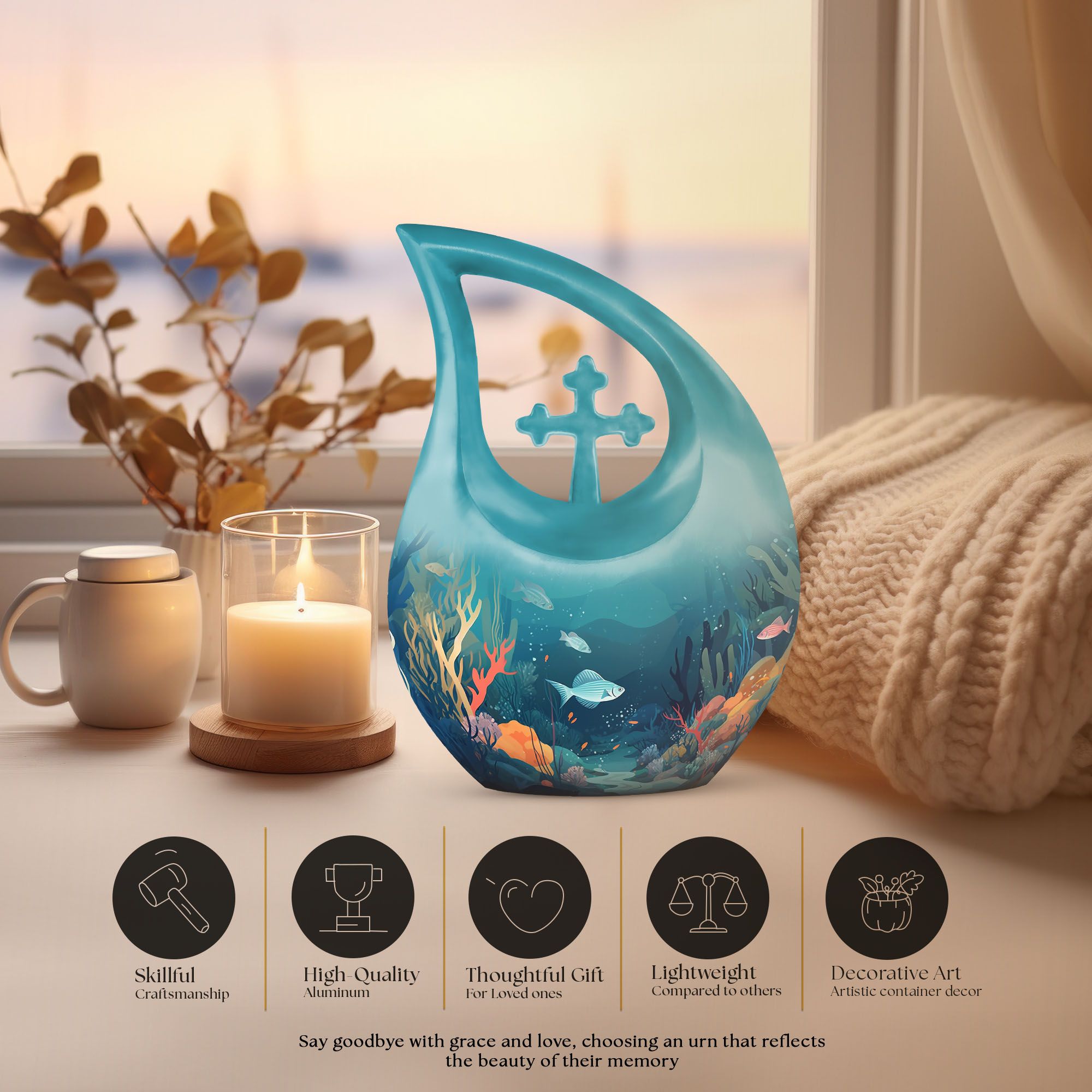Expertly handcrafted from durable aluminum, this urn features a stunning ocean-blue finish accented with subtle coral reef details, evoking feelings of peace and renewal. Designed as an urn for adult male & female, it is suitable for both home display and burial. Families searching for burial urn men or urn ashes for women will appreciate its balance of strength, beauty, and symbolism.