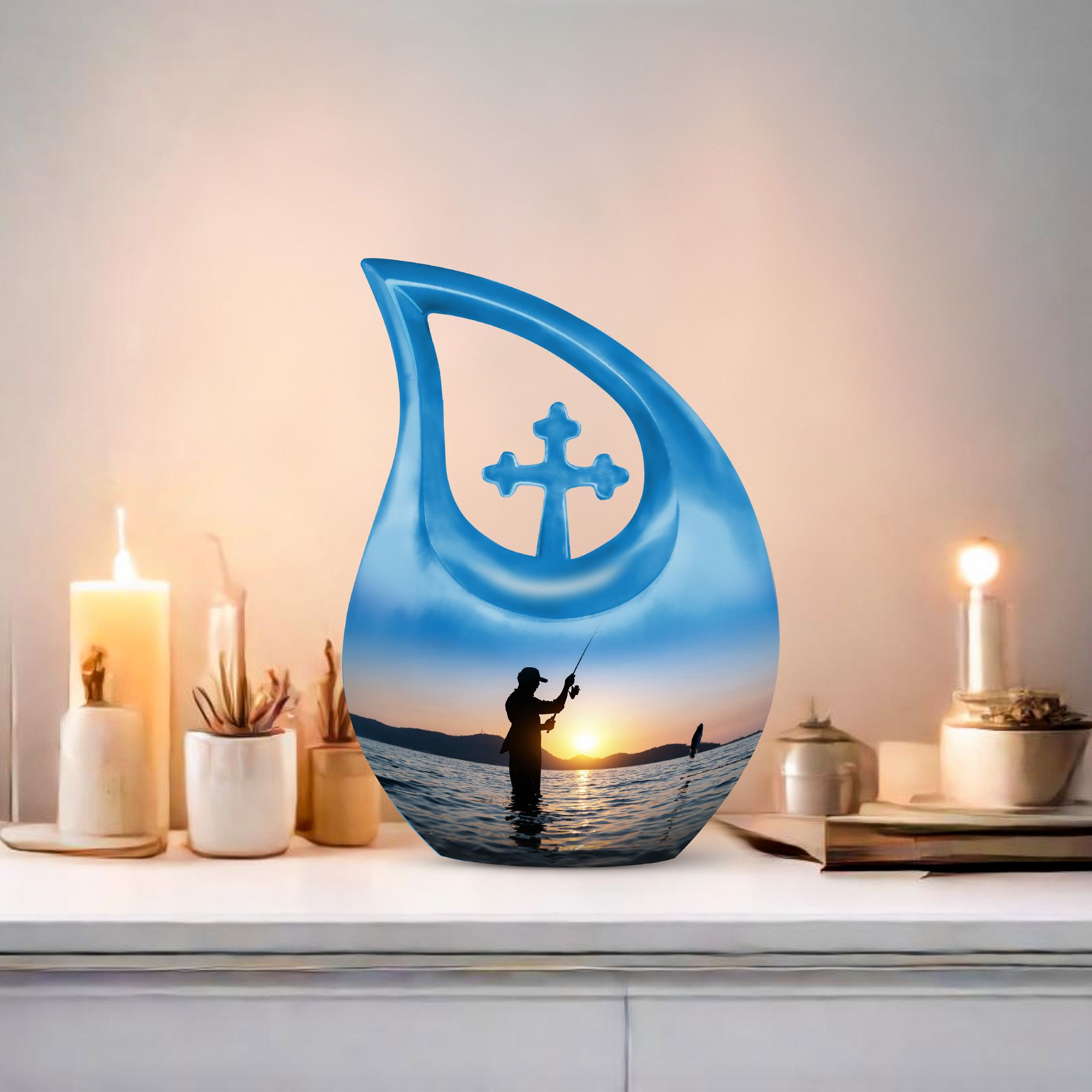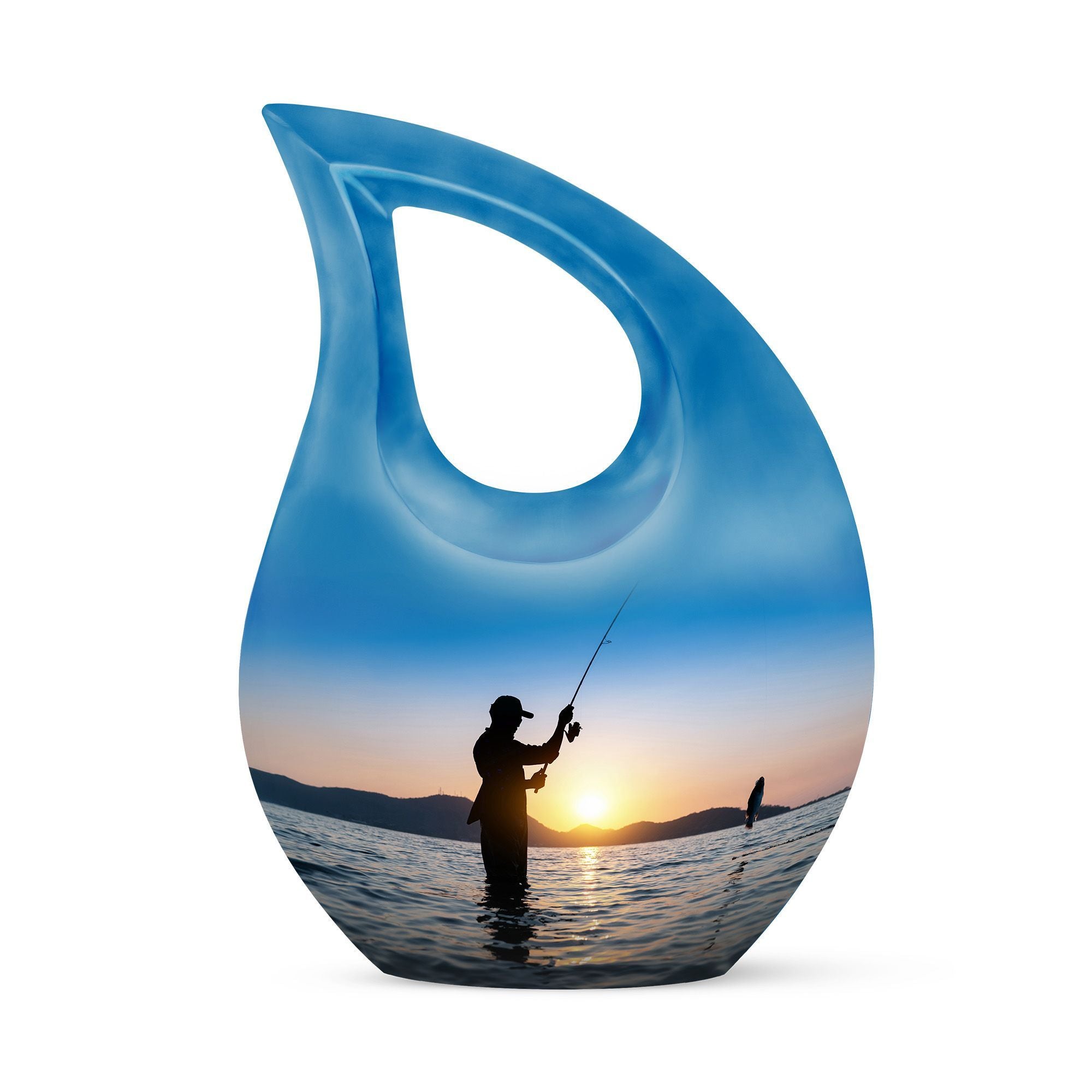 Designed with meticulous craftsmanship, this large decorative urn blends artistic detail with durable strength. Created from premium materials, it stands among the finest cremation urns large, shaped to hold ashes securely while offering visual beauty. The sunrise-inspired artwork paired with the fisherman theme creates a powerful symbol of peace and transition. This large funeral urn ensures long-lasting preservation with a secure closure, making it ideal for home display or memorial placement. Its generous size also makes it suitable as a cremation urn adult large, giving families confidence in its usability and style.
