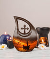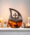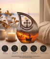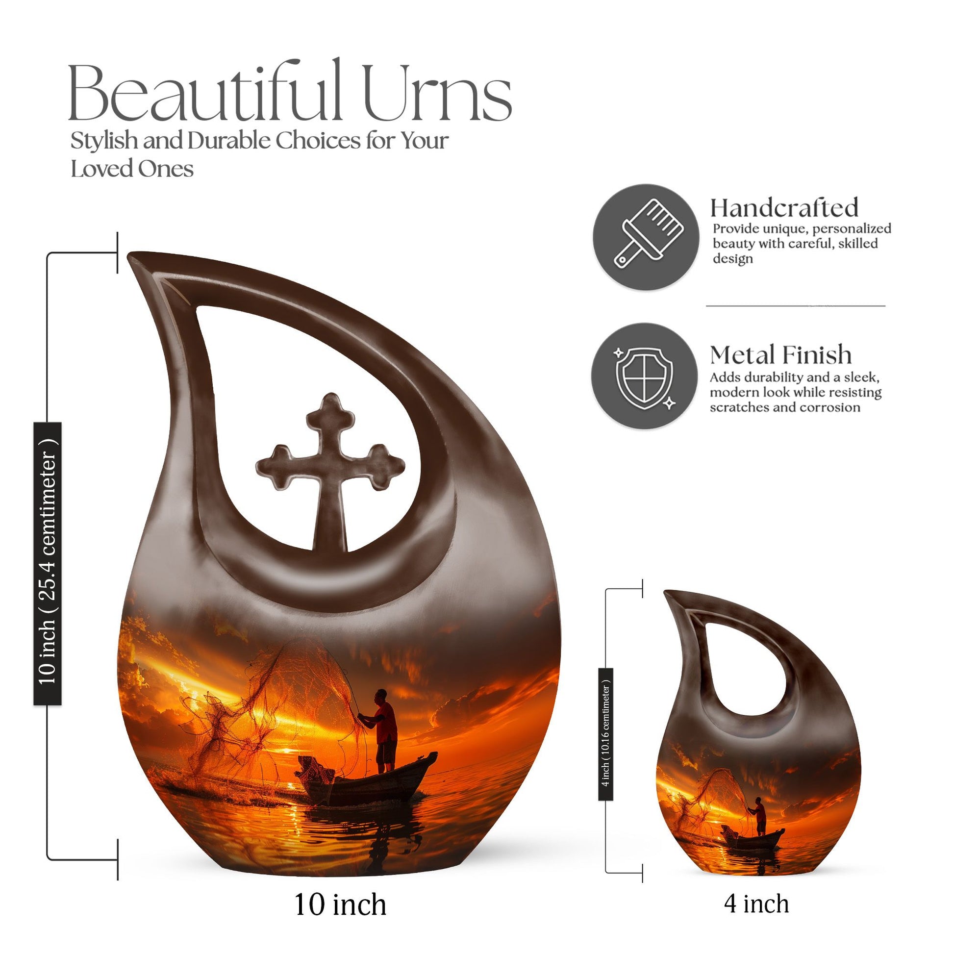 Crafted from durable aluminium, this urn showcases a vivid sunset fishing scene that symbolizes tranquility, reflection, and a life well lived. Its secure construction and polished finish make it a dependable choice for cremation burial urns or cremation urns for burial in ground, offering both beauty and long-lasting protection. The generous size and elegant artwork make it suitable for home display or formal burial ceremonies.