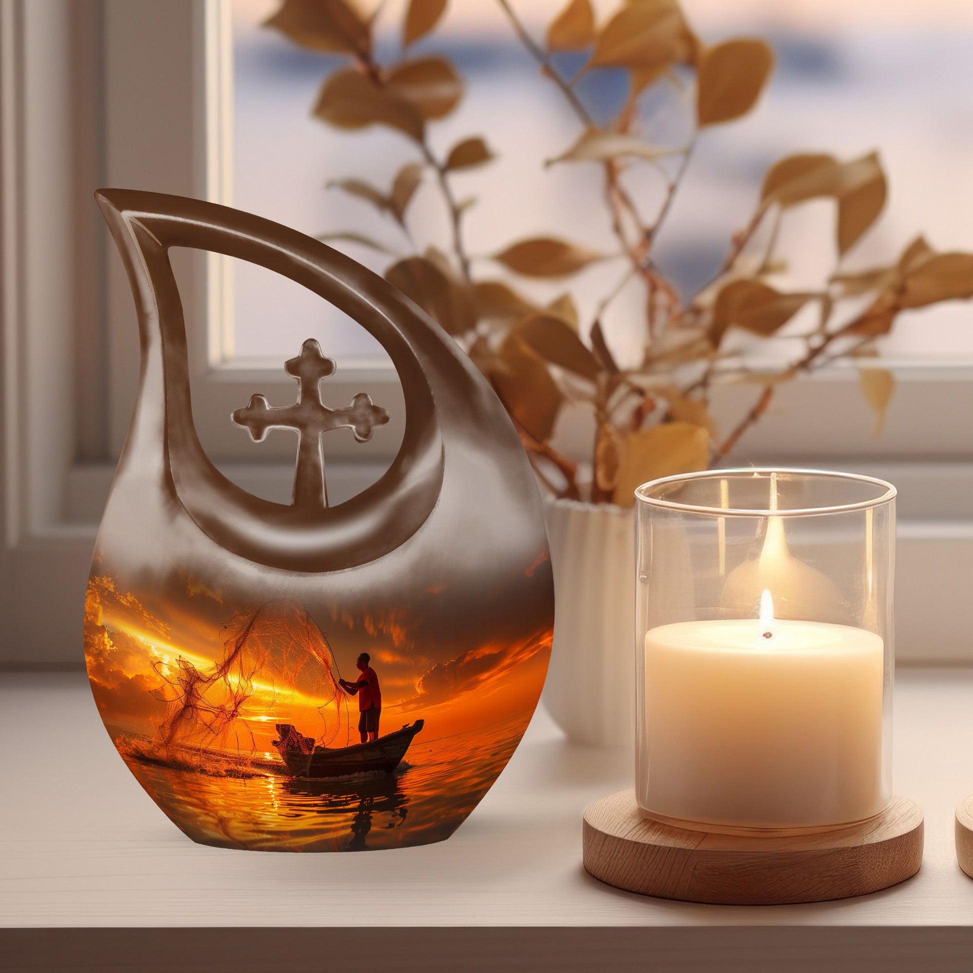 Honor cherished memories with this Fishing Cremation Urn, a beautifully crafted sunset memorial urn created to bring comfort and serenity. Designed for families seeking burial urns for human ashes or cremation urns for human ashes adult burial, it provides a peaceful and meaningful tribute for Mom, Dad, or any loved one who found solace in nature.