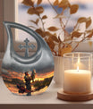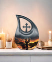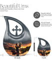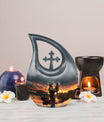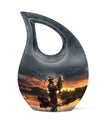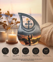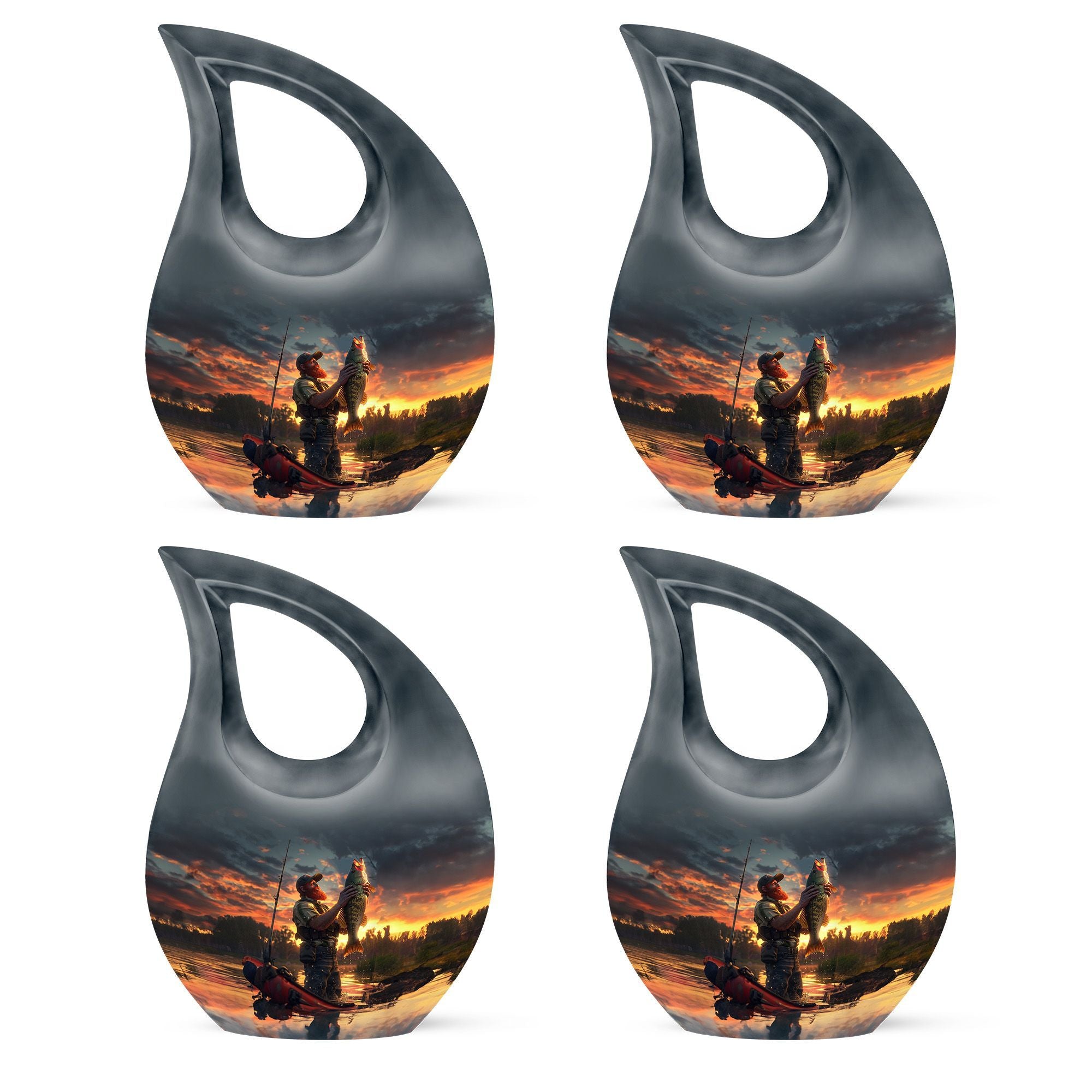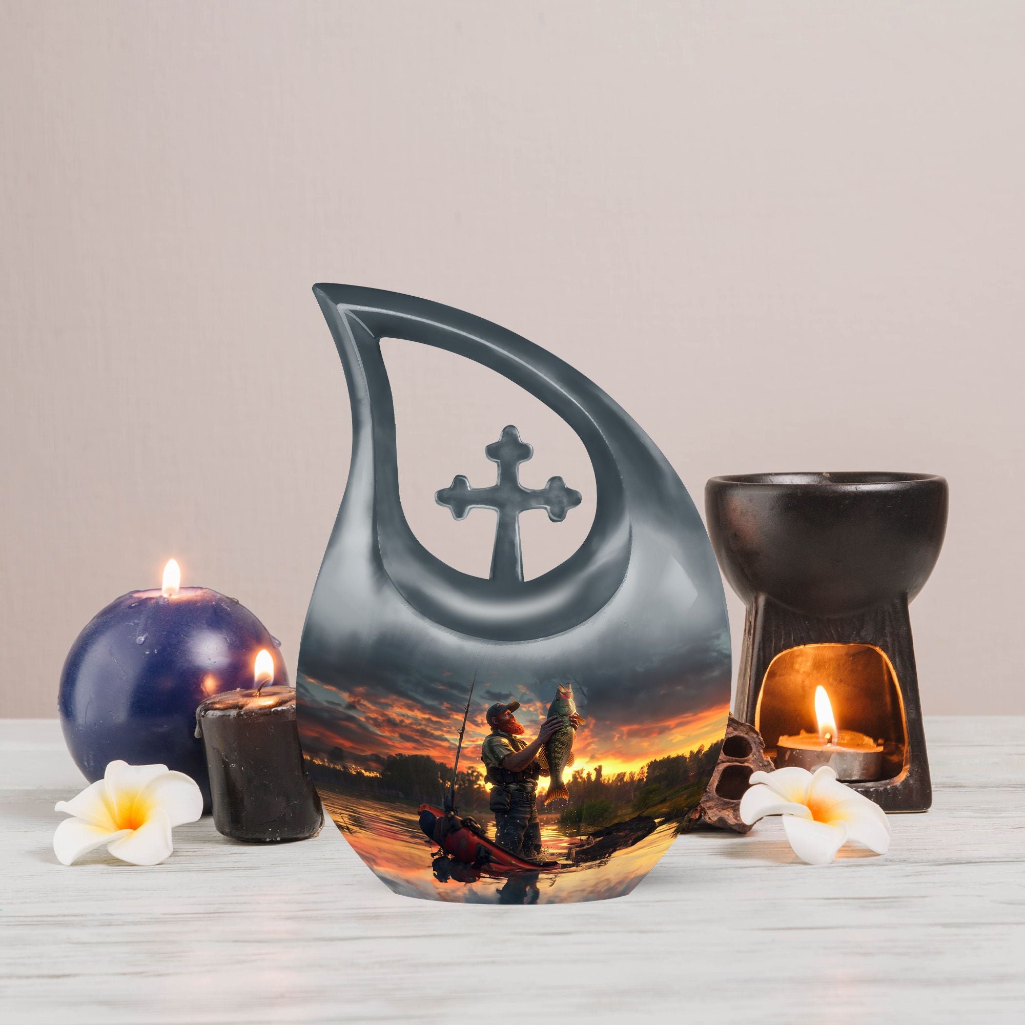 Expertly crafted from durable aluminum, this urn features a warm sunset backdrop with a fisherman proudly holding his catch—symbolizing accomplishment, serenity, and the beauty of a life well-lived. Ideal for those needing urns for human ashes large, a cremation urn adult large, or large cremation urns for human ashes, its secure screw-top lid keeps ashes protected while offering a visually striking tribute. With a full 200-cu-in capacity, it suits families seeking a large urn for adult ashes, human urns for ashes adult large, or an urn large adult male for Dad.