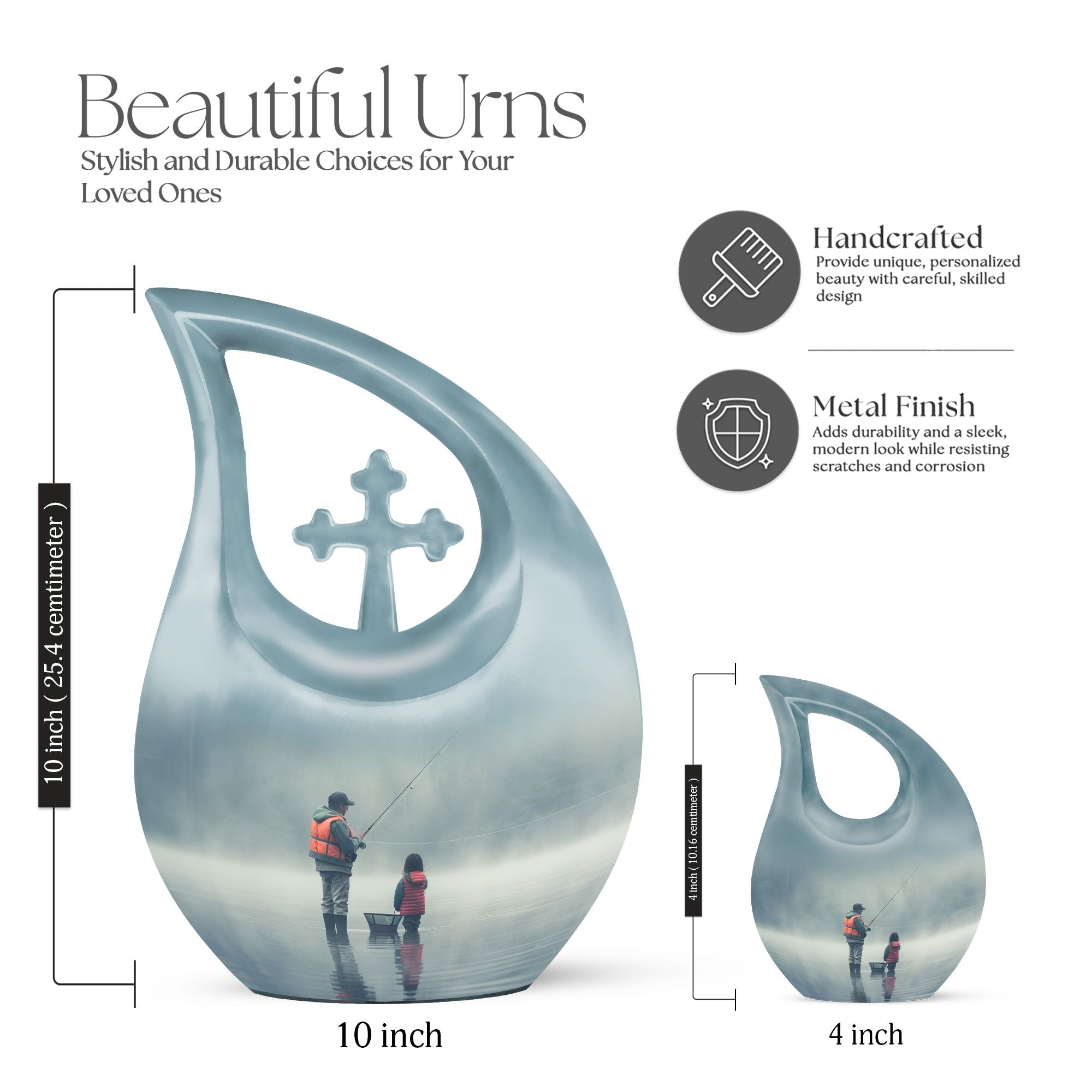 Crafted from durable aluminum, this urn features a serene fishing-themed design symbolizing freedom, calm waters, and cherished outdoor memories. Its sturdy construction and elegant artistic details make it an ideal choice for those needing Cremation Urn Adult Large, Large Cremation Urns for Human Ashes, or a secure Large Cremation Urn that complements any memorial setting. The 10-inch size provides ample capacity while maintaining a refined, respectful appearance.