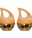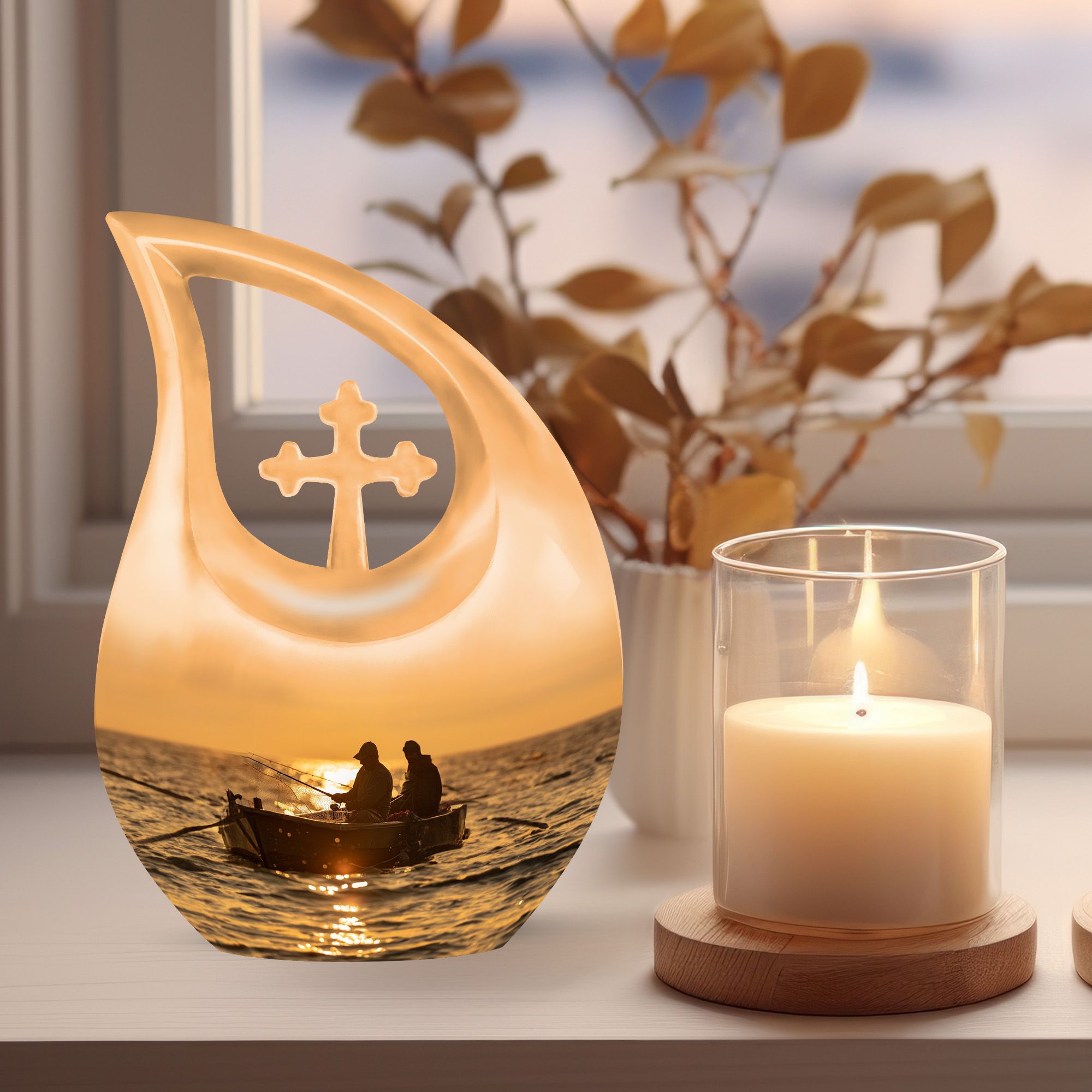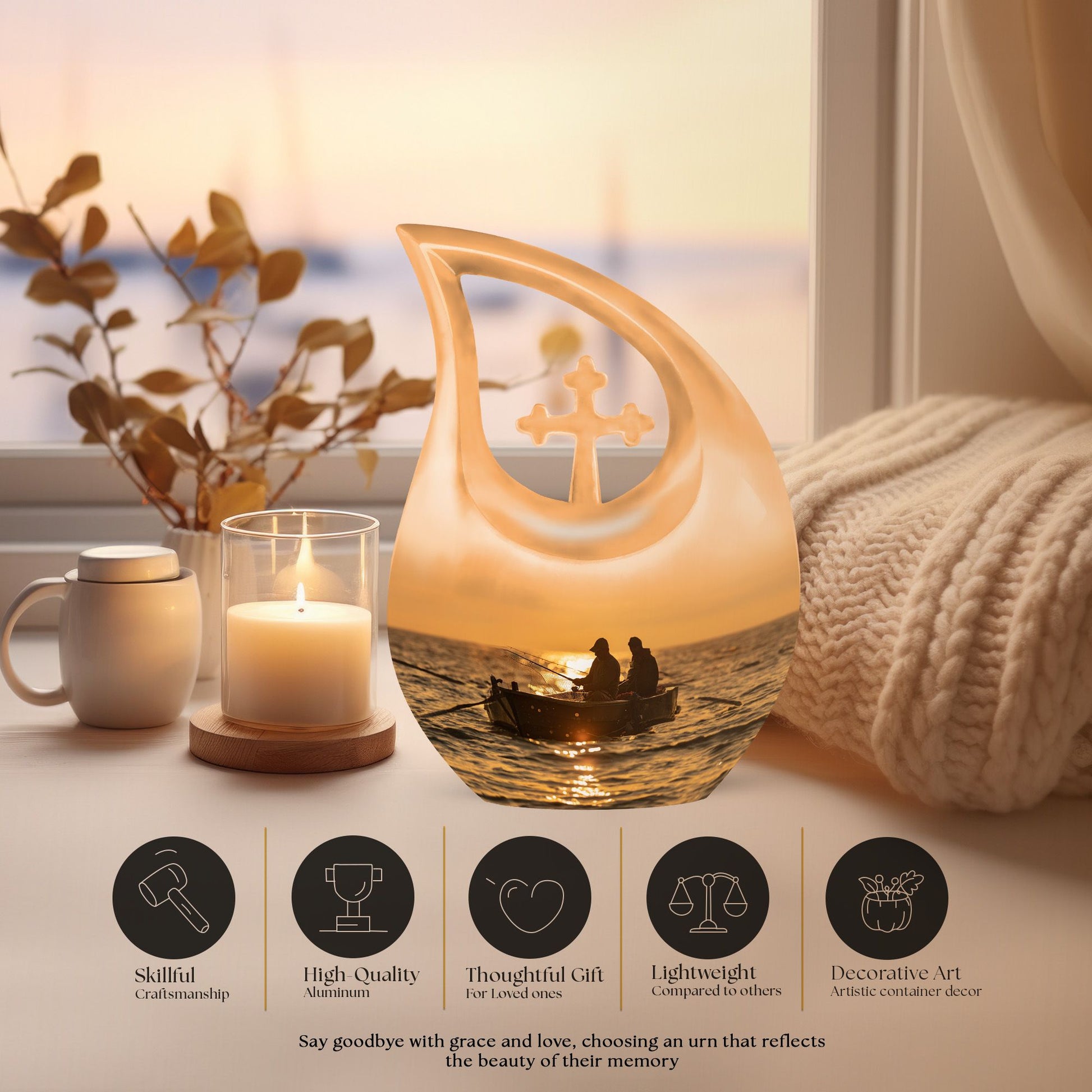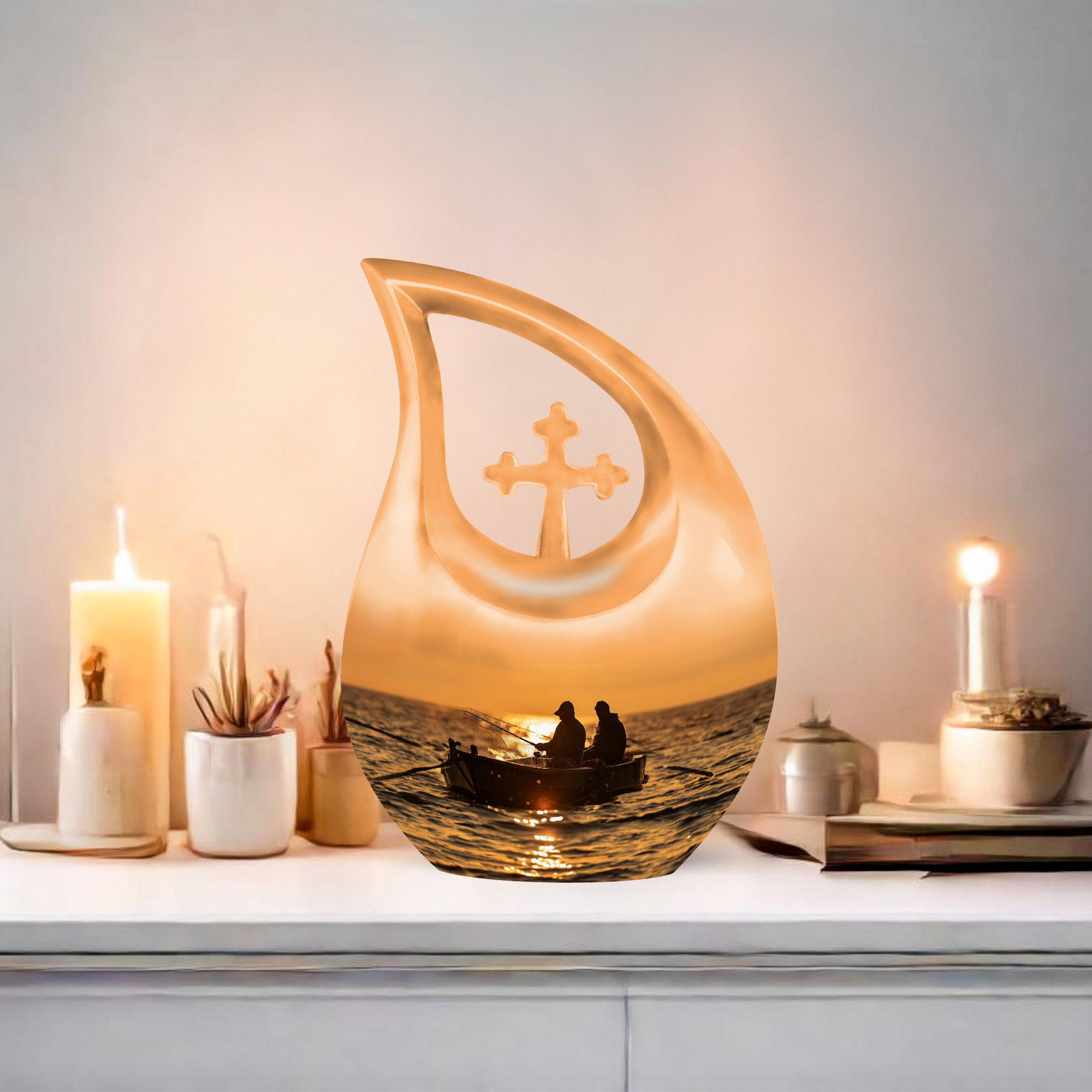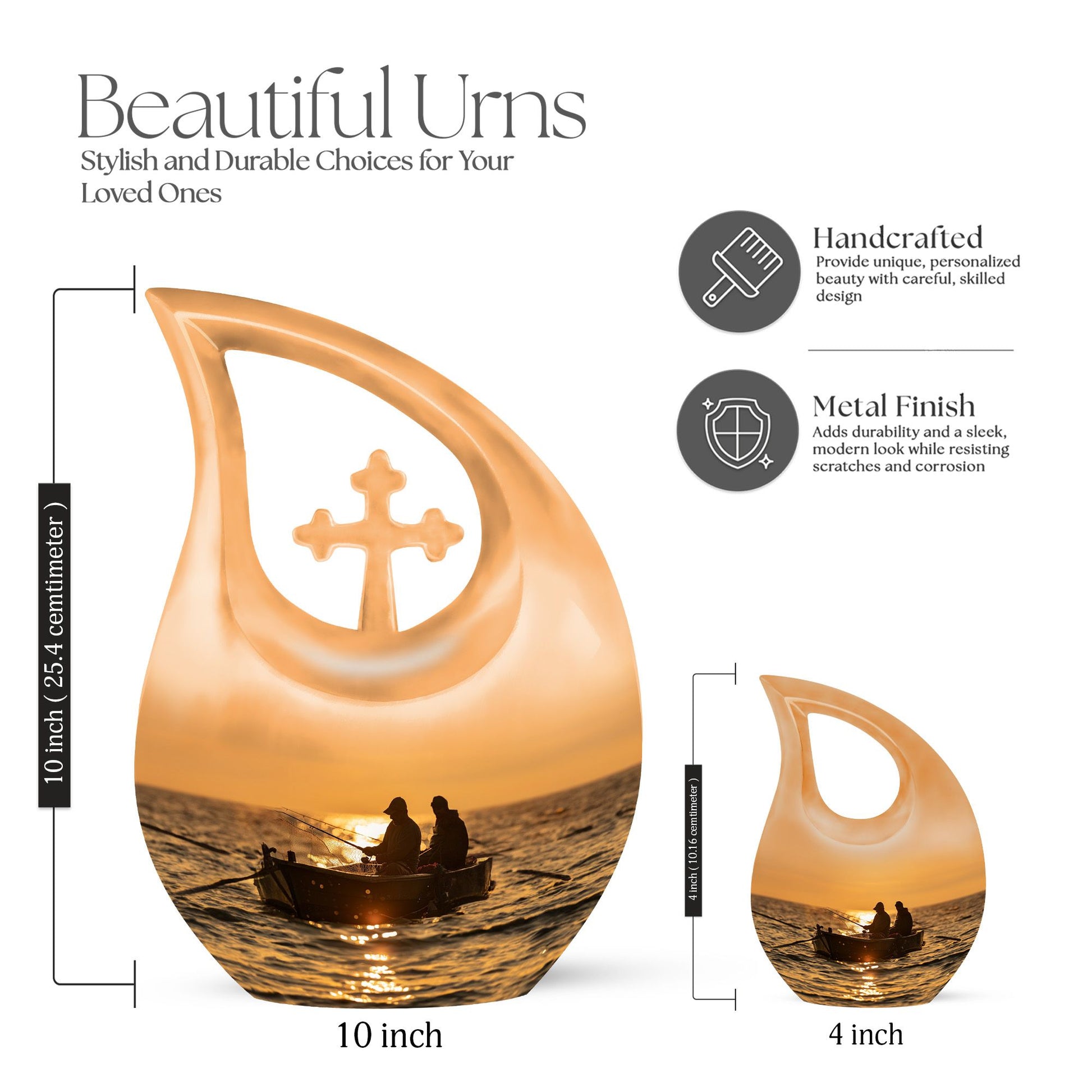 Honor the memory of your loved one with our 'Fishing Urn'. Designed with the fishing enthusiast in mind, this large urn for ashes is a heartfelt symbol of serene life by the water. Crafted from sturdy aluminum, the urn weighs 3.3 pounds and stands at a solemn 10 inches in height. It features a 'Cross Drop' motif, which beautifully merges traditional and modern aesthetics. The urn's capacity is 200 cubic inches, providing ample space for ashes. An added velvet pouch offers a secure containment for the urn. You further have the option to personalize this meaningful vessel with engraved names, making it a unique tribute to your departed. This affordable cremation urn, available for low cost, serves as a palpable reminder of the shared fishing trips and joyful memories. The 'Fishing Urn' is more than just a vessel; it's a tangible connection to your loved one. Ideal for those seeking memorial urns that truly resonate with the departed soul's passion.