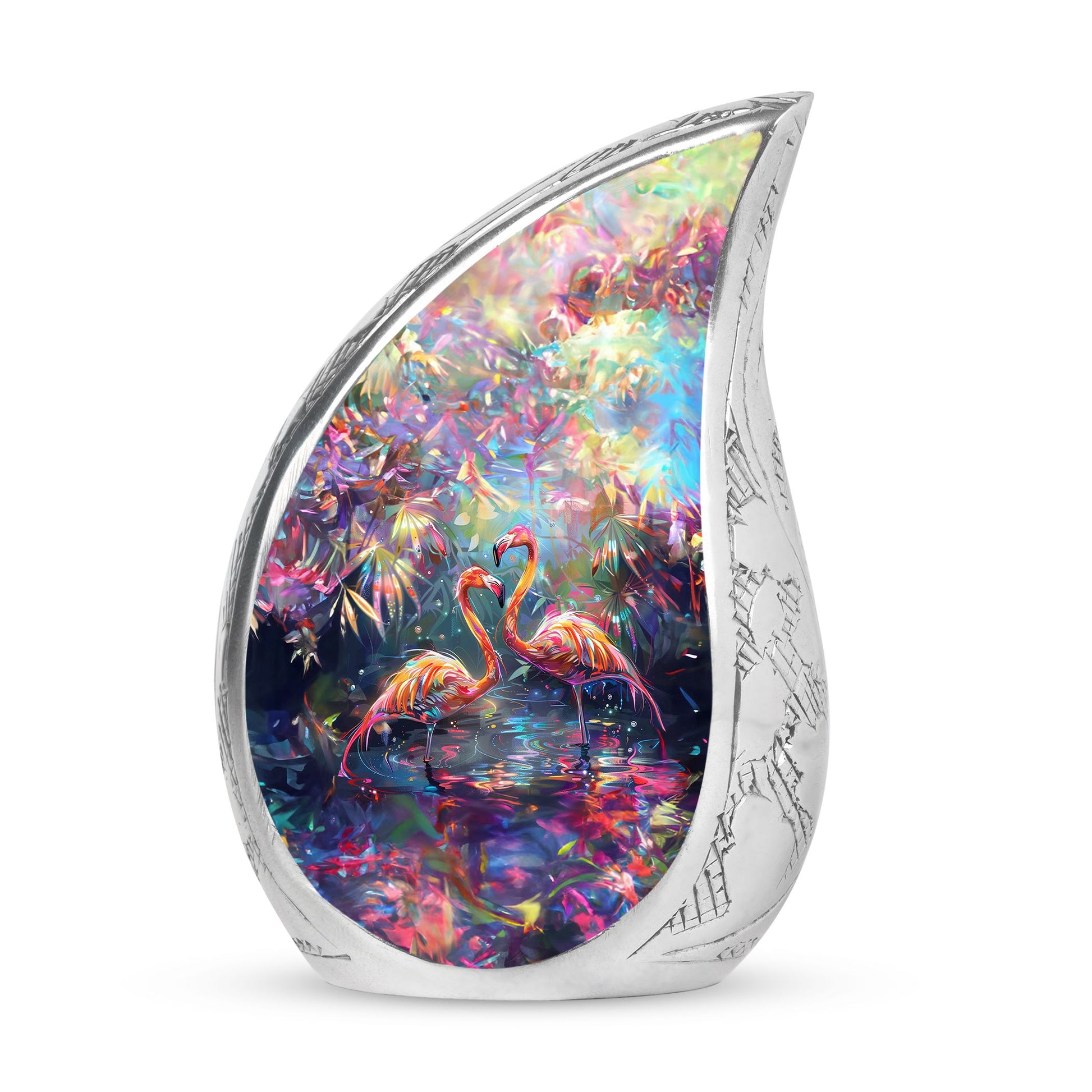 The Vibrant Flamingo Pair cremation urn for human ashes captures the beauty of togetherness and the joy of a colorful life. Featuring two elegant flamingos standing side by side, this urn represents love, loyalty, and peace — a touching tribute to the bond shared with a loved one. Its vivid design offers a meaningful way to honor memories with both warmth and dignity.
