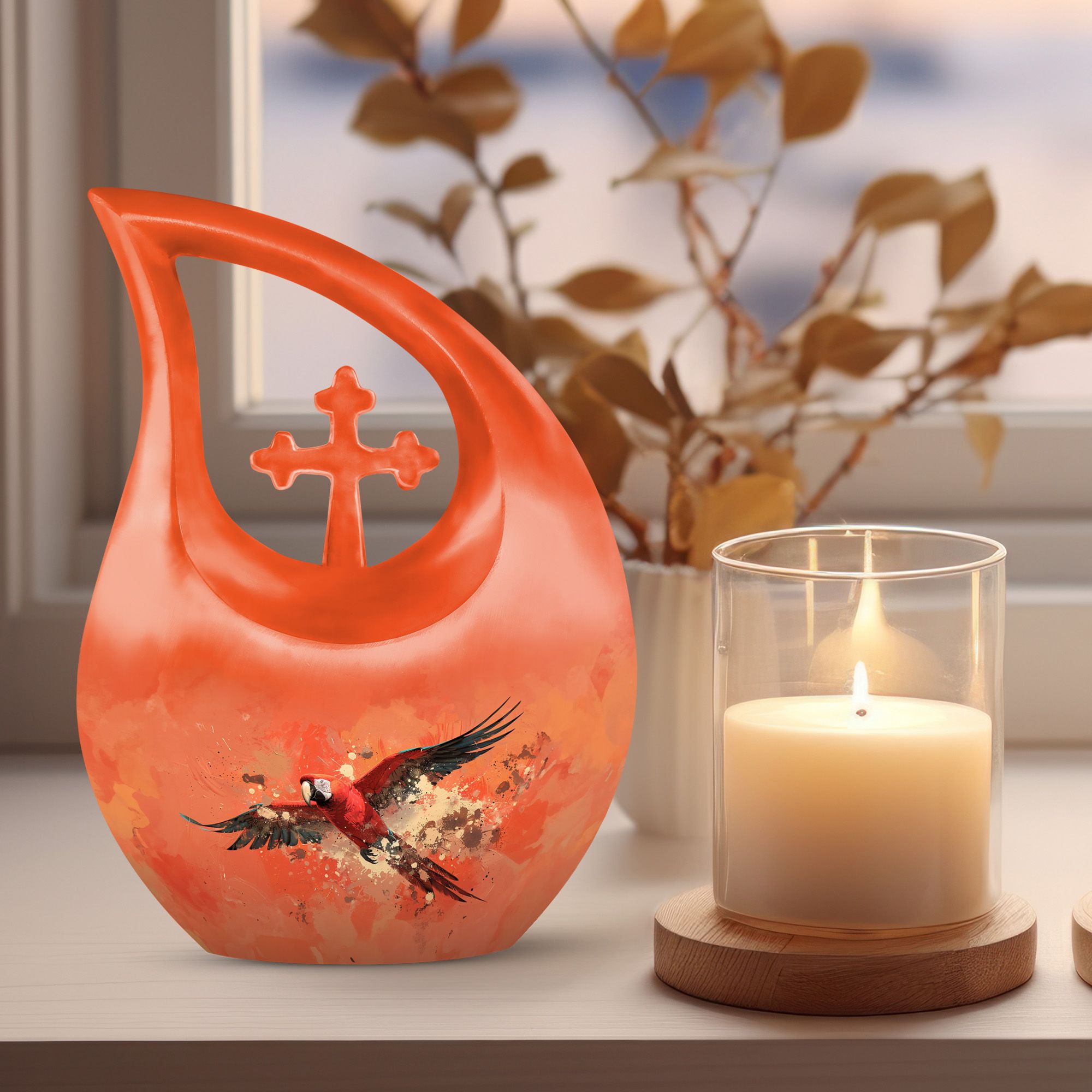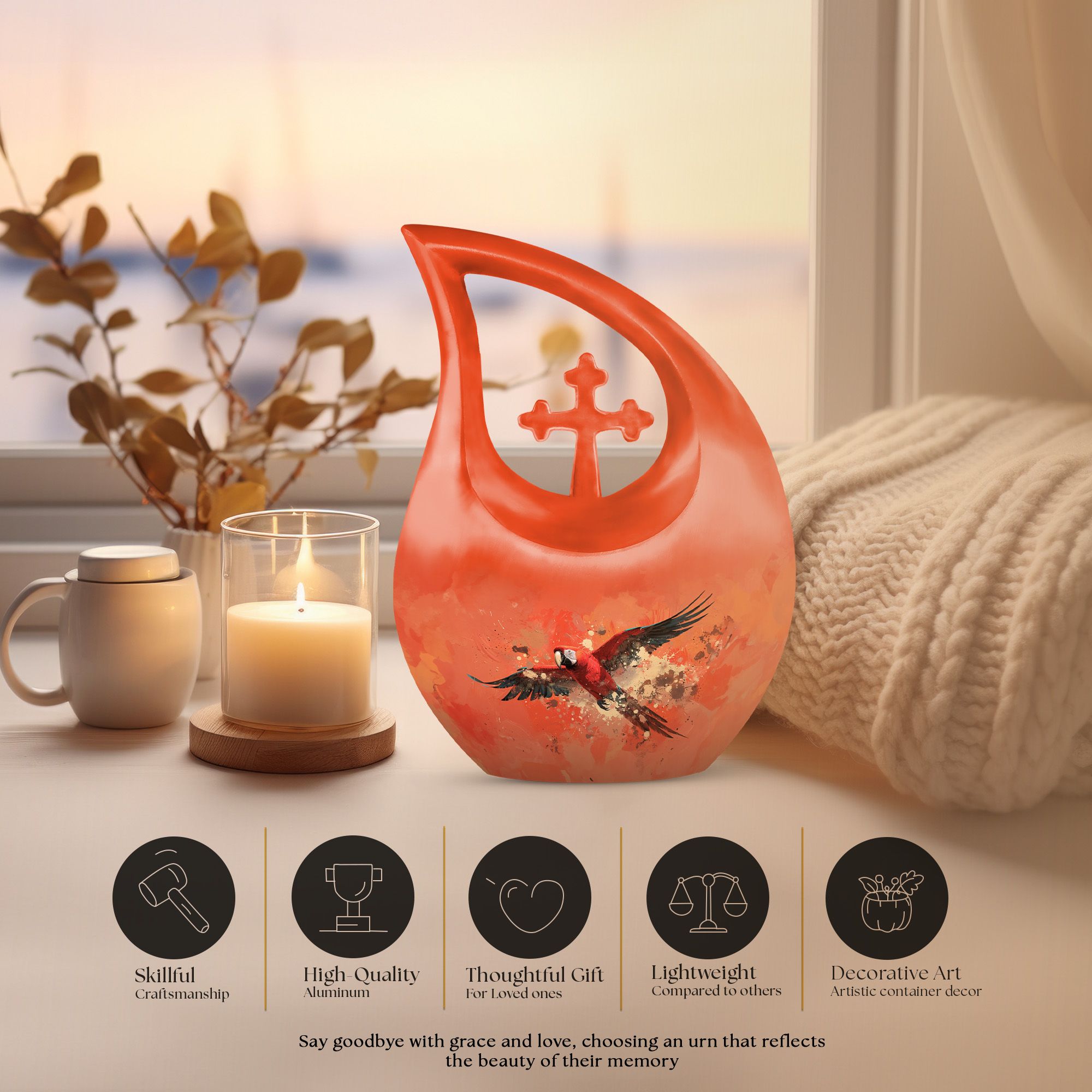 Pay homage to your loved ones and cherish their memories with the Crimson Flight Urn, a striking addition to our range of large size cremation urns. Constructed from resilient aluminium, the urn weighs 3.3 pounds and has a strong bearing capacity of 200 cubic inches. The urn stands a substantial 10 inches tall, providing ample space for the peaceful containment of ashes. The urn exhibits an exquisite Cross Drop theme, that often enters our list of 'unique urns for a husband'. With us, you also get a velvet pouch for the secure storage of cremated remains. Add a personal touch with our engraving services - personalize with names, dates, or a phrase that speaks to your heart. Consulting for 'small urns for human ashes near me'? We suggest the Crimson Flight Urn as your keepsake memorabilia. This superior-quality urn is an excellent tribute and serves as an honourable container for your loved one's remains.