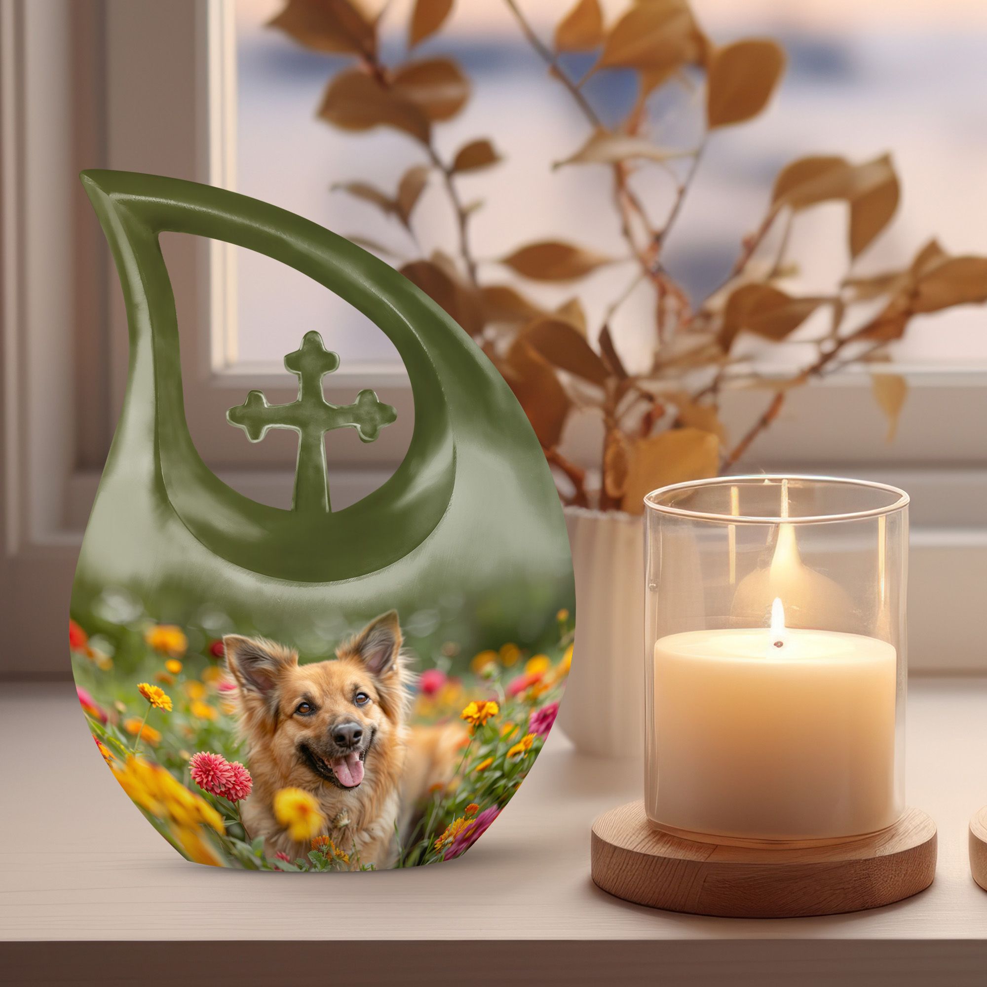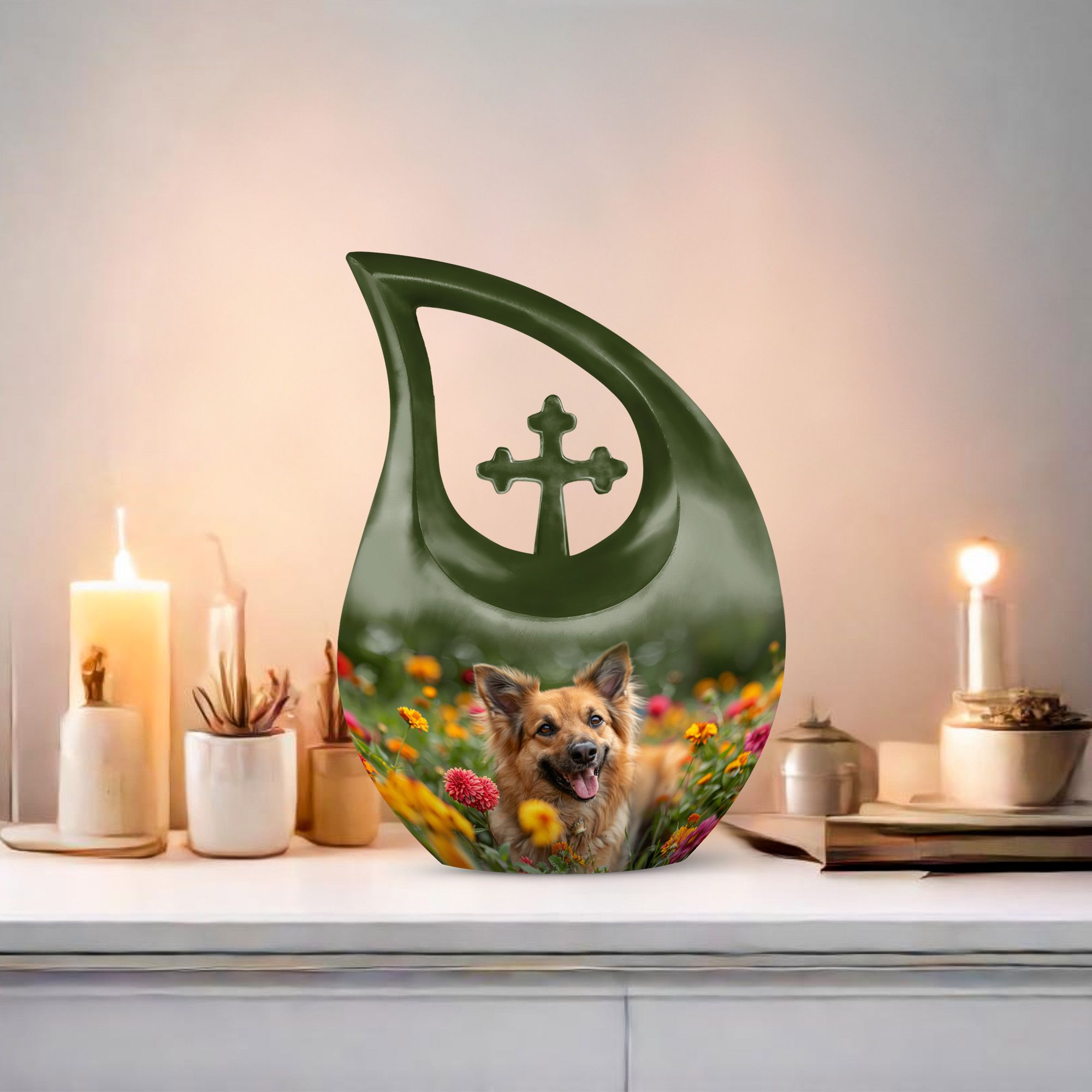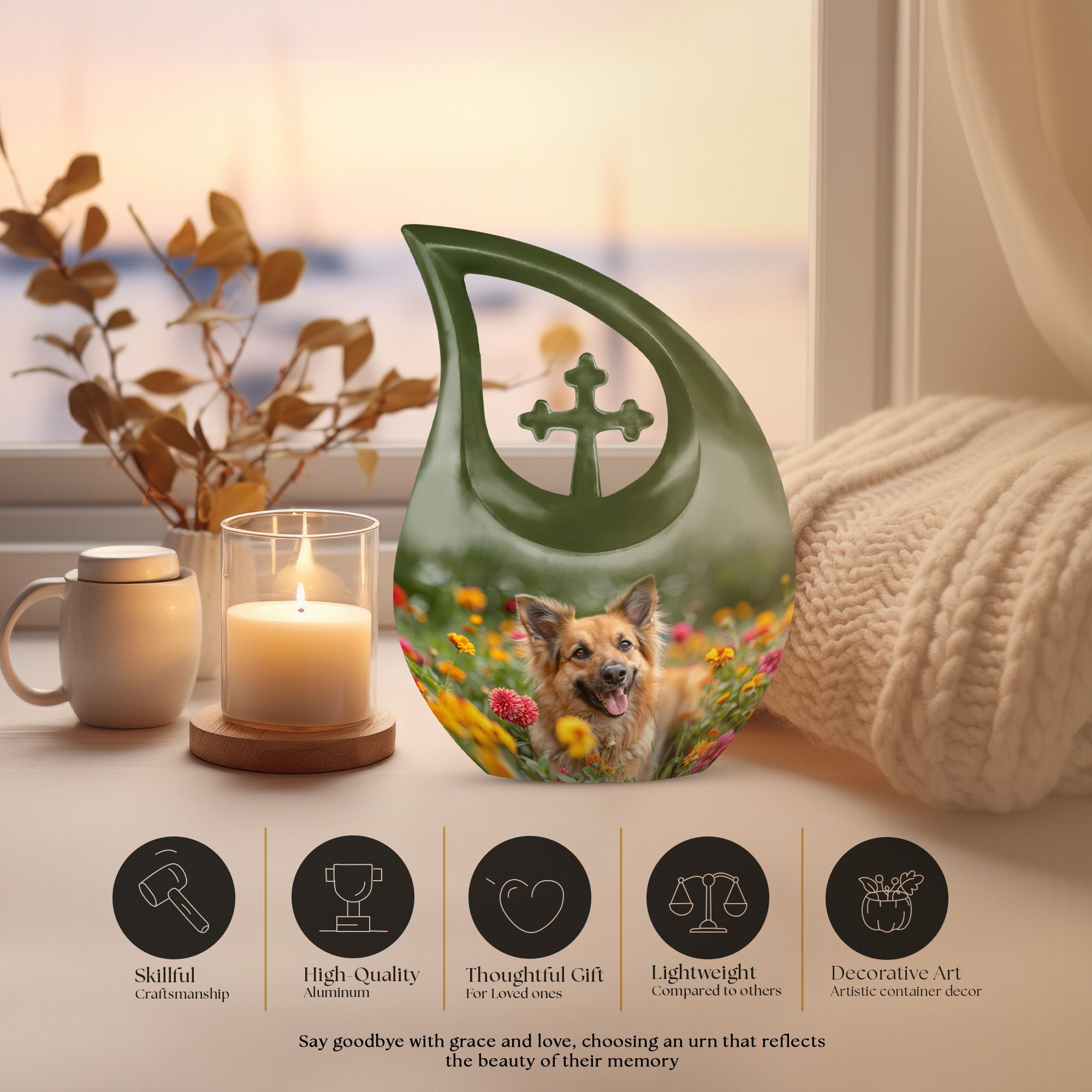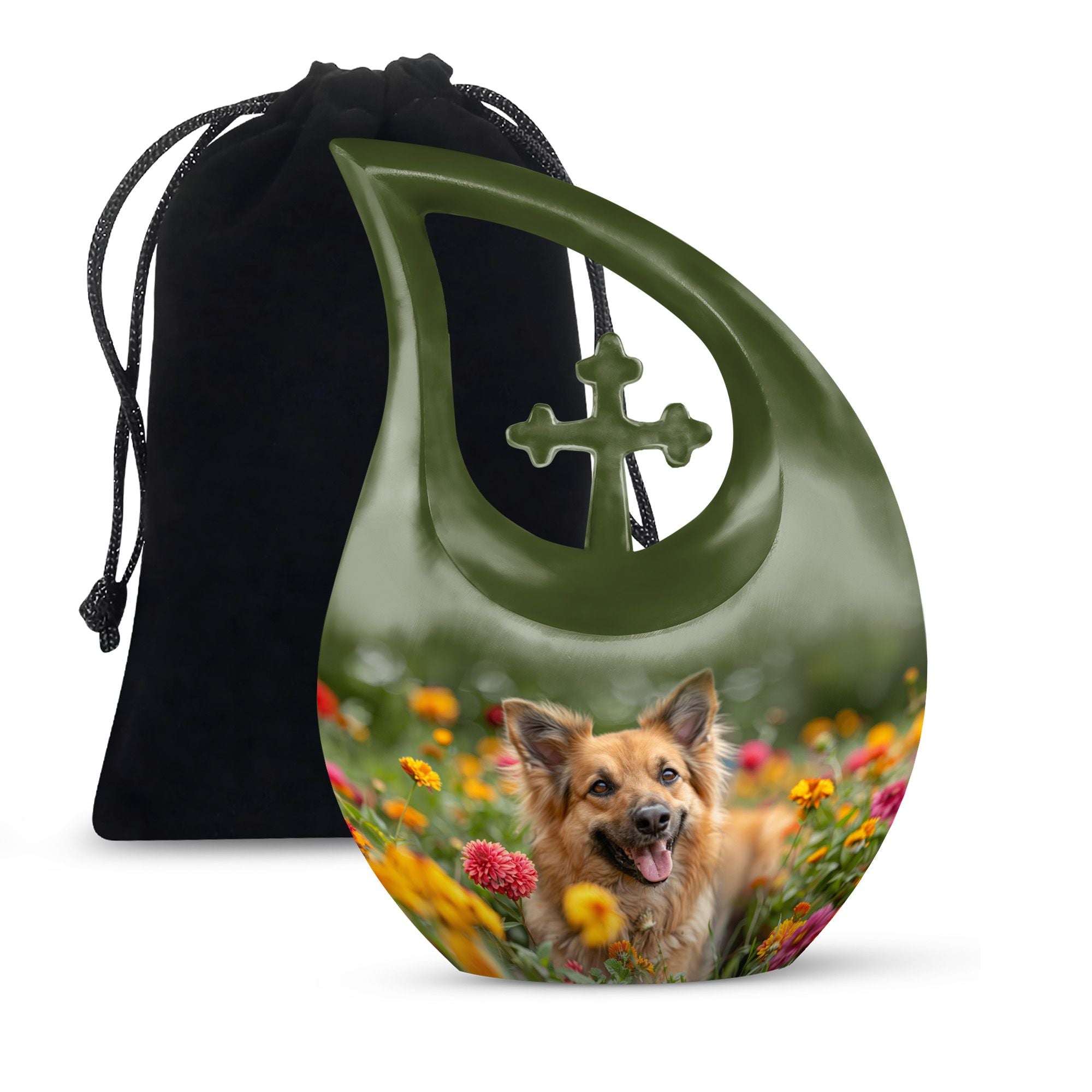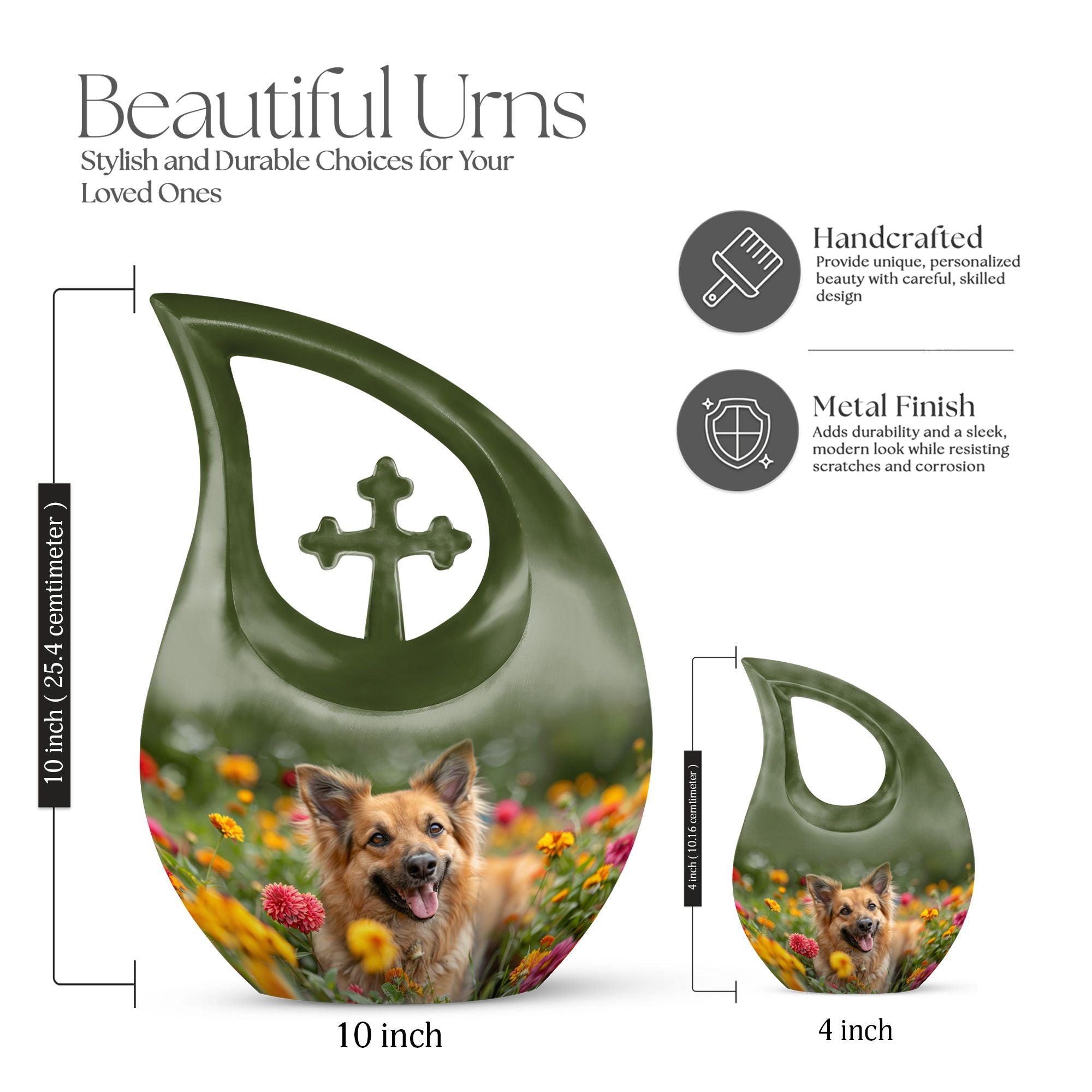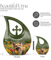 Comfortingly crafted from premium quality aluminum, our Floral Canine Happiness Urn is an ideal choice for large adults. Combining unique aesthetics and careful craftsmanship, this cremation urn meticulously balances bold dignity and heartfelt emotion. Standing at 10 inches in height and weighing 3.3 pounds, it professionally honors your cherished one owing to its generous capacity of 200 cubic inches. Our Floral Canine Happiness Urn is accompanied with a velvet pouch, ensuring dignified containment of ashes. What distinguishes it among common memorial urns is the 'Cross Drop' theme, fusing spiritual relevance with a touching tribute to the departed canine companions. Personalize your urn with engraved names for an even more intimate memory. This product seamlessly fits into our 'Memorial Ceremony Supplies' category, catering to adults and seniors who are seeking a poignant remembrance. Uncommonly referred as 'Double Urns For Ashes', 'Cheap Cremation Urns', or 'Unique Urns For Ashes', it attests to a discerning approach to selecting memorial urns.