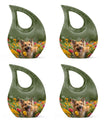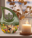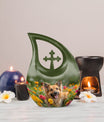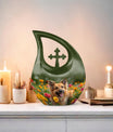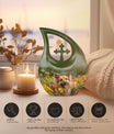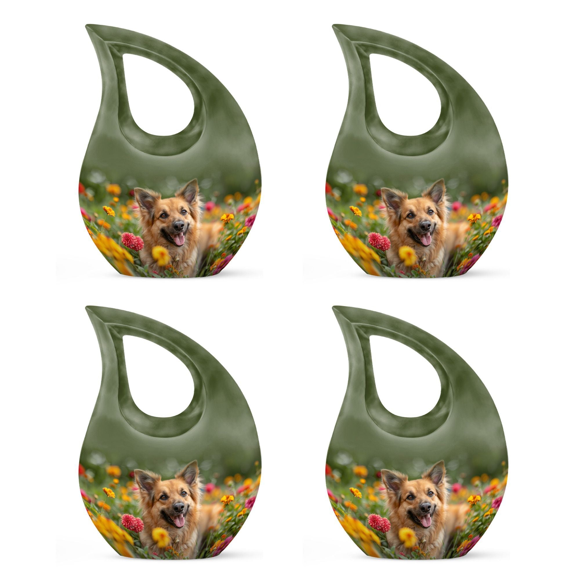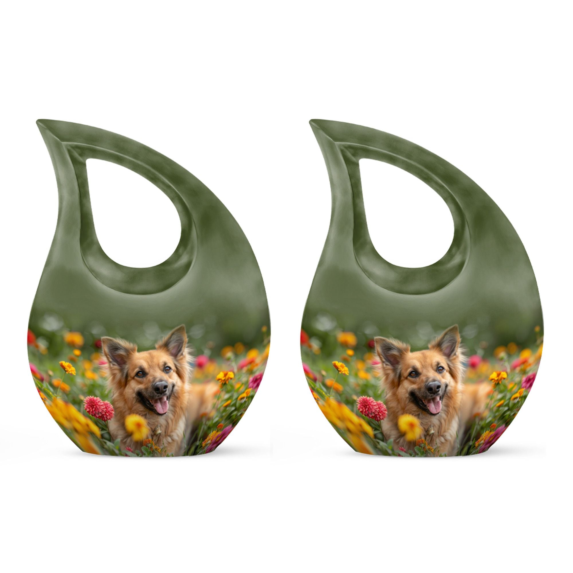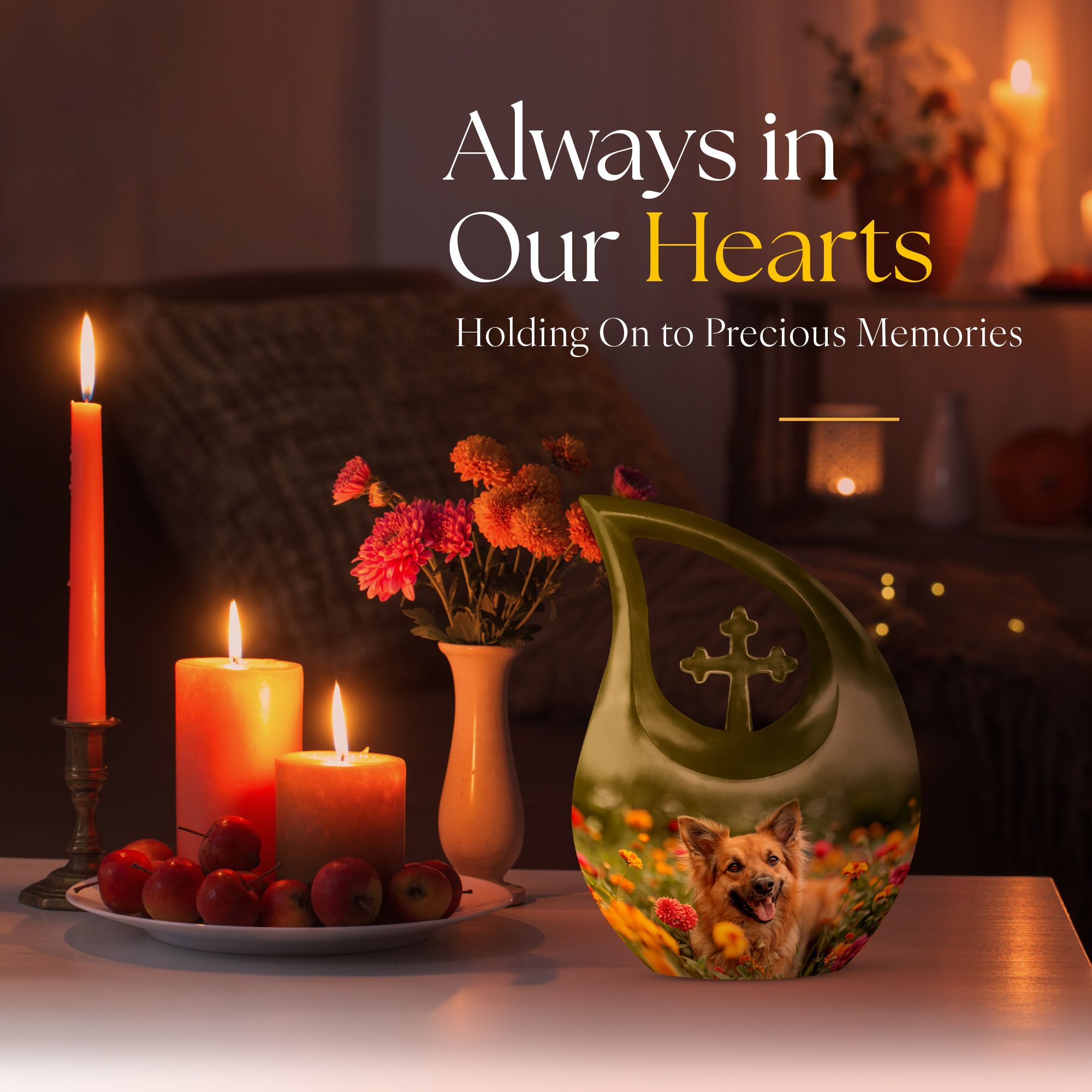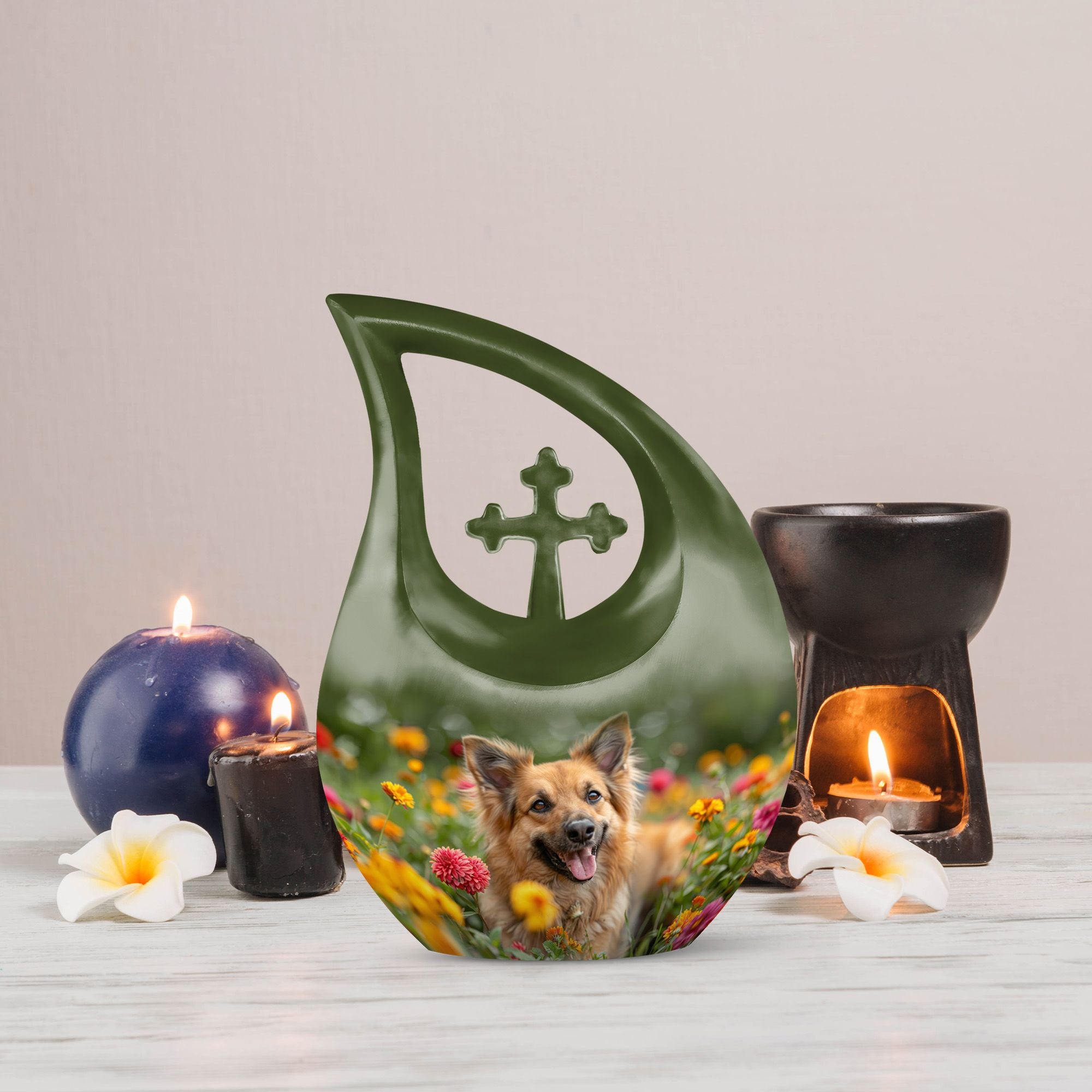 Comfortingly crafted from premium quality aluminum, our Floral Canine Happiness Urn is an ideal choice for large adults. Combining unique aesthetics and careful craftsmanship, this cremation urn meticulously balances bold dignity and heartfelt emotion. Standing at 10 inches in height and weighing 3.3 pounds, it professionally honors your cherished one owing to its generous capacity of 200 cubic inches. Our Floral Canine Happiness Urn is accompanied with a velvet pouch, ensuring dignified containment of ashes. What distinguishes it among common memorial urns is the 'Cross Drop' theme, fusing spiritual relevance with a touching tribute to the departed canine companions. Personalize your urn with engraved names for an even more intimate memory. This product seamlessly fits into our 'Memorial Ceremony Supplies' category, catering to adults and seniors who are seeking a poignant remembrance. Uncommonly referred as 'Double Urns For Ashes', 'Cheap Cremation Urns', or 'Unique Urns For Ashes', it attests to a discerning approach to selecting memorial urns.