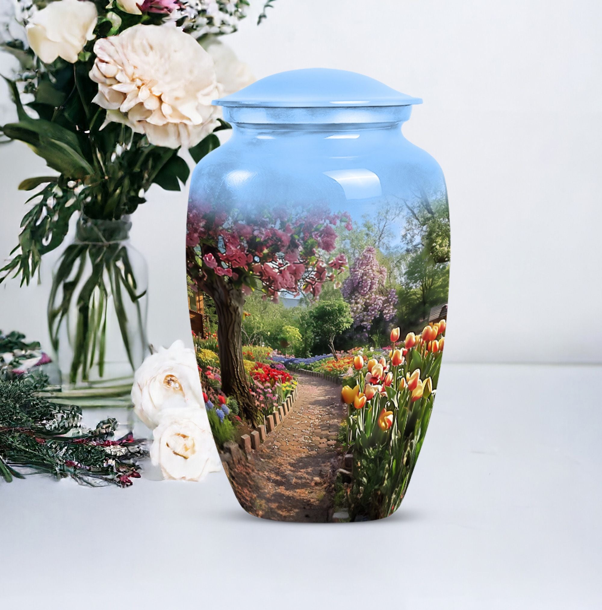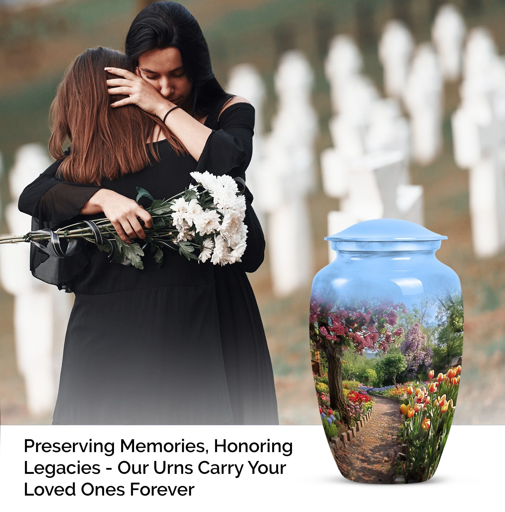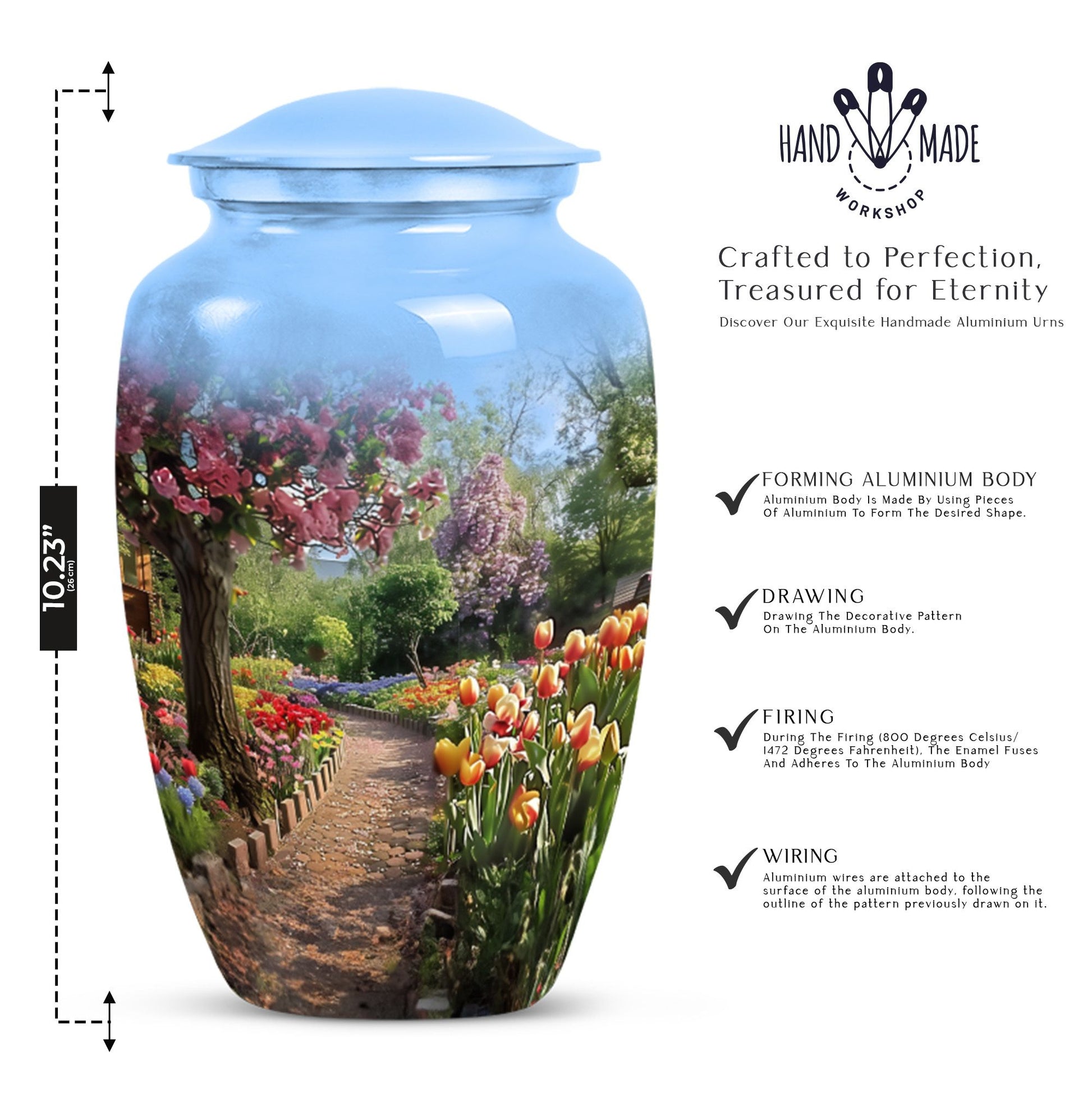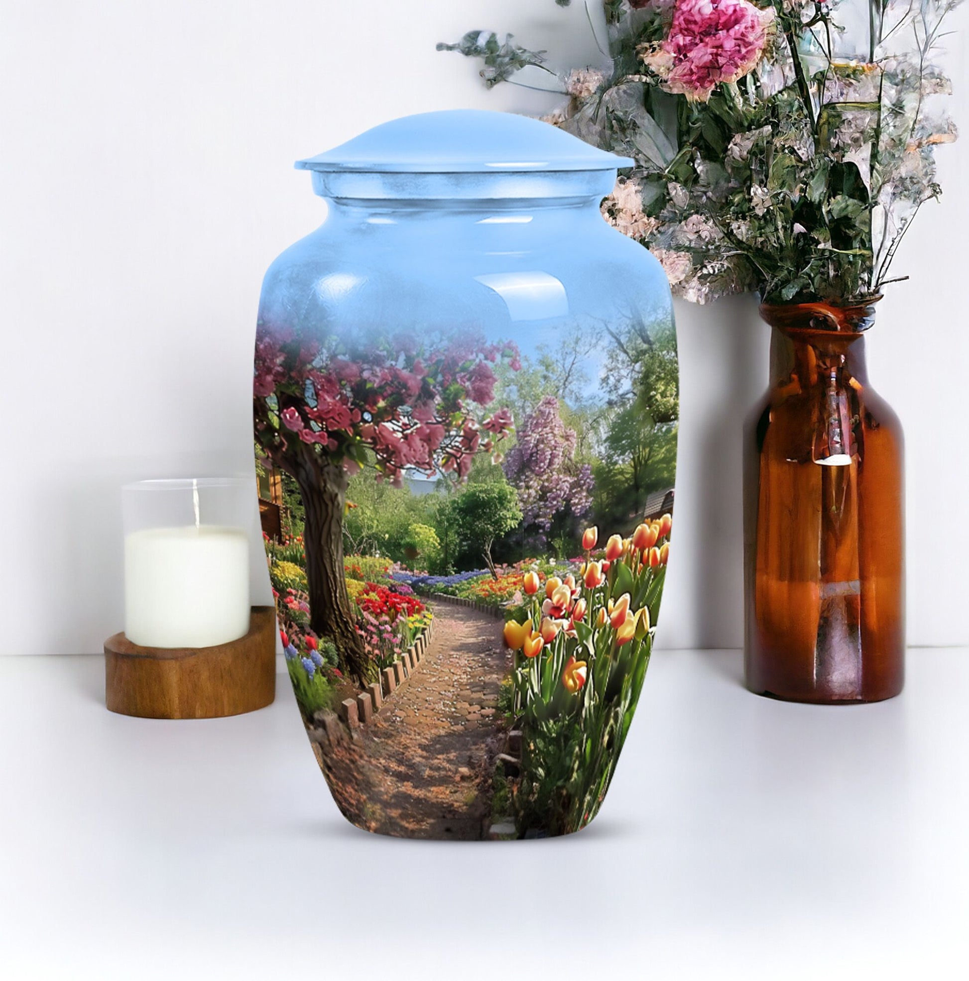 Immerse in the beauty of our Flower themed 10-inch Classic Urn, an exquisite epitome of majesty, delicate for a beloved soul. This elegantly crafted large funeral urn for female is an ultimate tribute to remembrance. Constructed with the durable aluminium, it weighs just 3.3 pounds, making it as enduring as your memories. Its capacity of 200 cubic inches keeps the essence of your loved ones close to your heart. The urn comes with a complimentary velvet pouch for containment of ashes, treating delicateness with love and care. You can personalize the cremation urn with engraved names, adding an essence of personal touch. Uncommon in community, these large urns outstand with their floral themes and impeccable designs. The FLOWERS Urn has a stand too, beautifully shaped, adding to the overall elegance. Remember, cherish, and preserve with our range of memorial urns, and express your enduring love and respect.