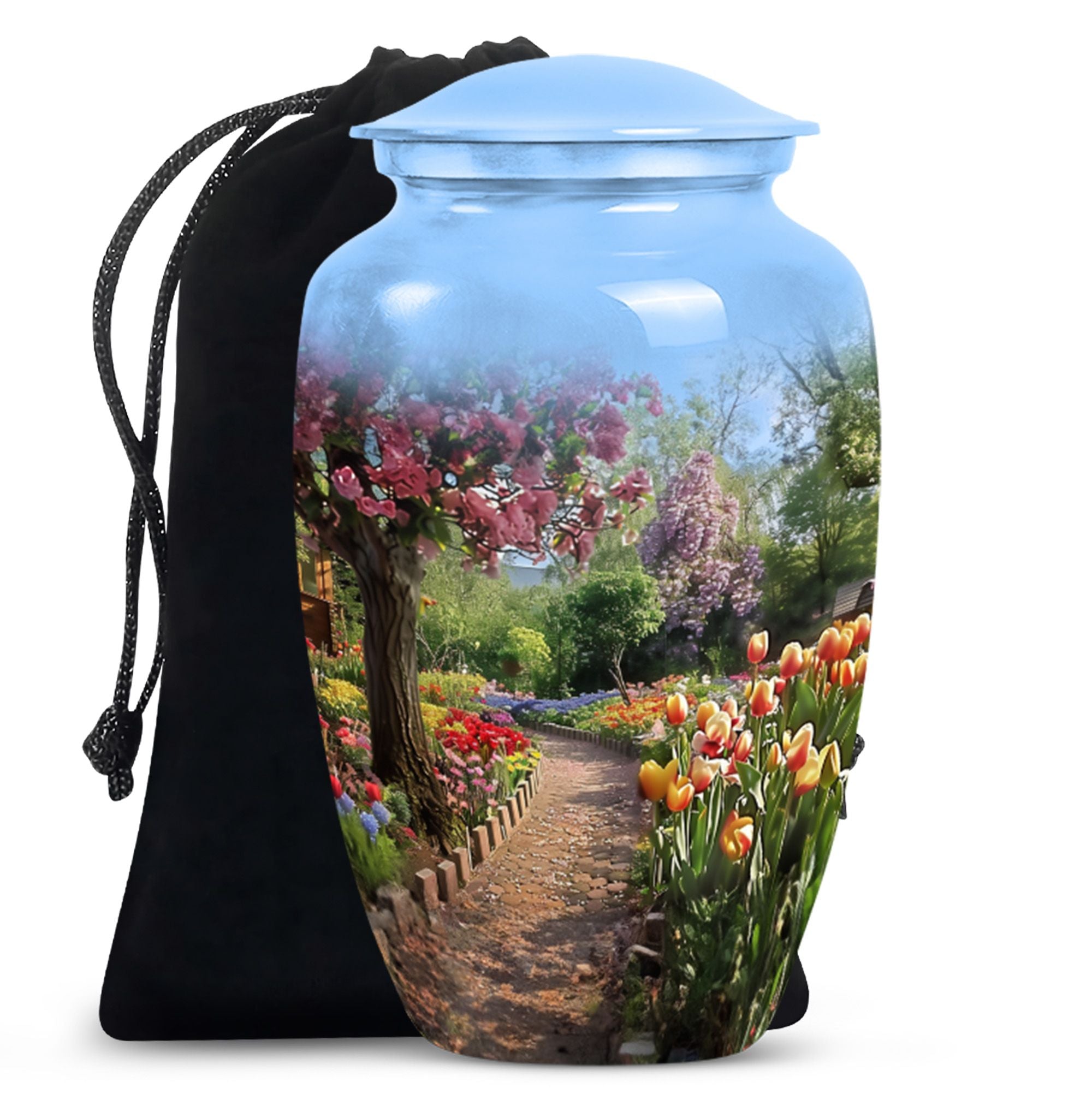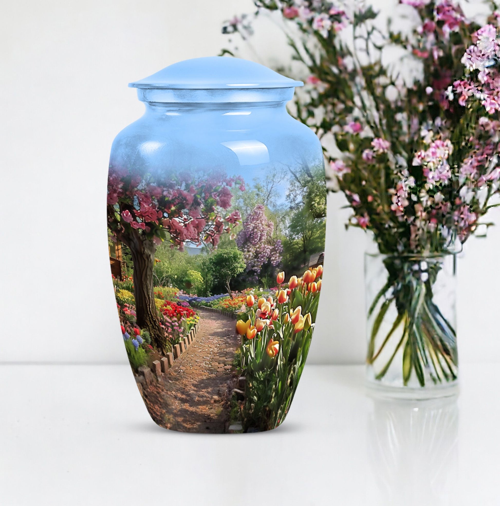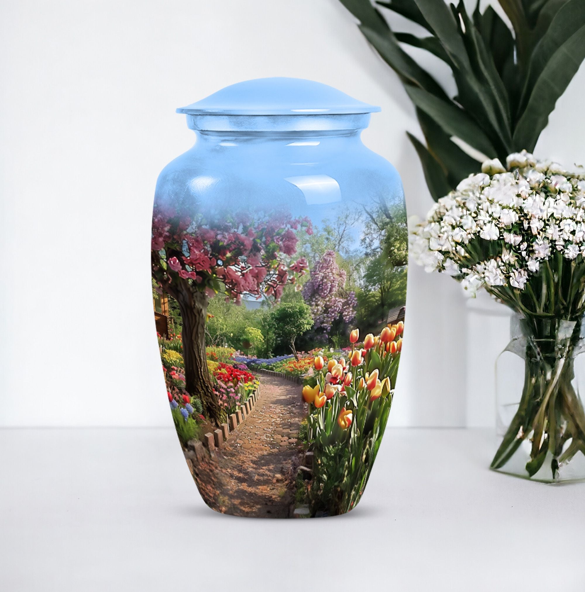 Immerse in the beauty of our Flower themed 10-inch Classic Urn, an exquisite epitome of majesty, delicate for a beloved soul. This elegantly crafted large funeral urn for female is an ultimate tribute to remembrance. Constructed with the durable aluminium, it weighs just 3.3 pounds, making it as enduring as your memories. Its capacity of 200 cubic inches keeps the essence of your loved ones close to your heart. The urn comes with a complimentary velvet pouch for containment of ashes, treating delicateness with love and care. You can personalize the cremation urn with engraved names, adding an essence of personal touch. Uncommon in community, these large urns outstand with their floral themes and impeccable designs. The FLOWERS Urn has a stand too, beautifully shaped, adding to the overall elegance. Remember, cherish, and preserve with our range of memorial urns, and express your enduring love and respect.