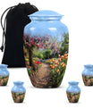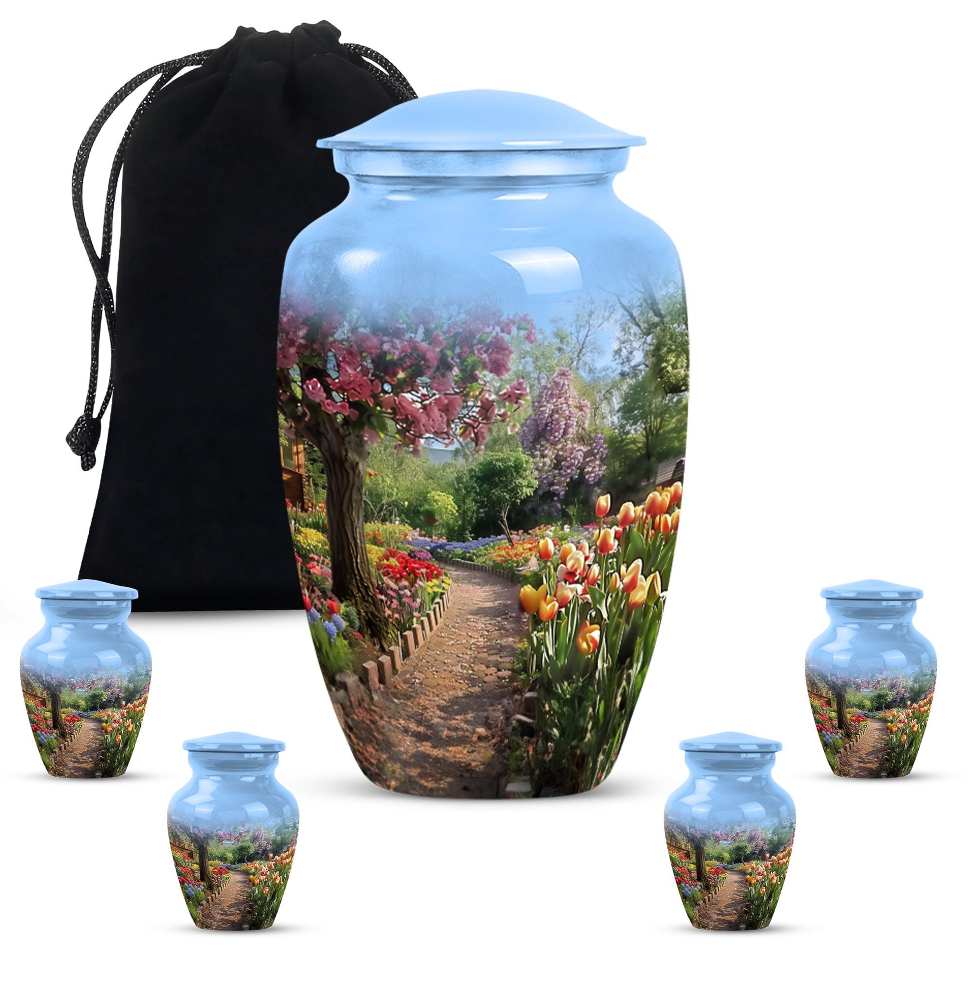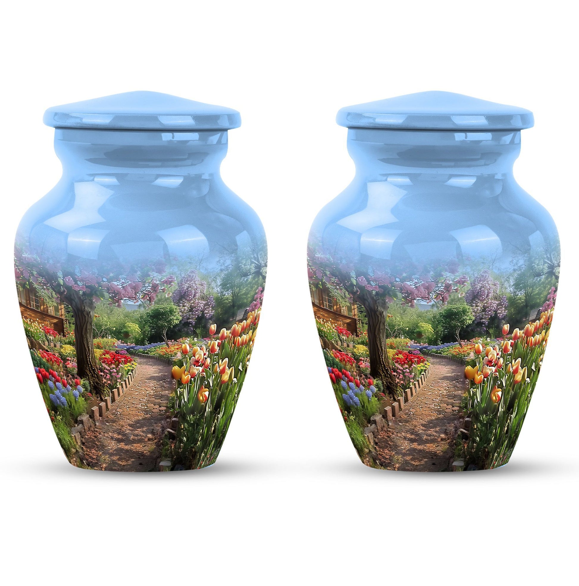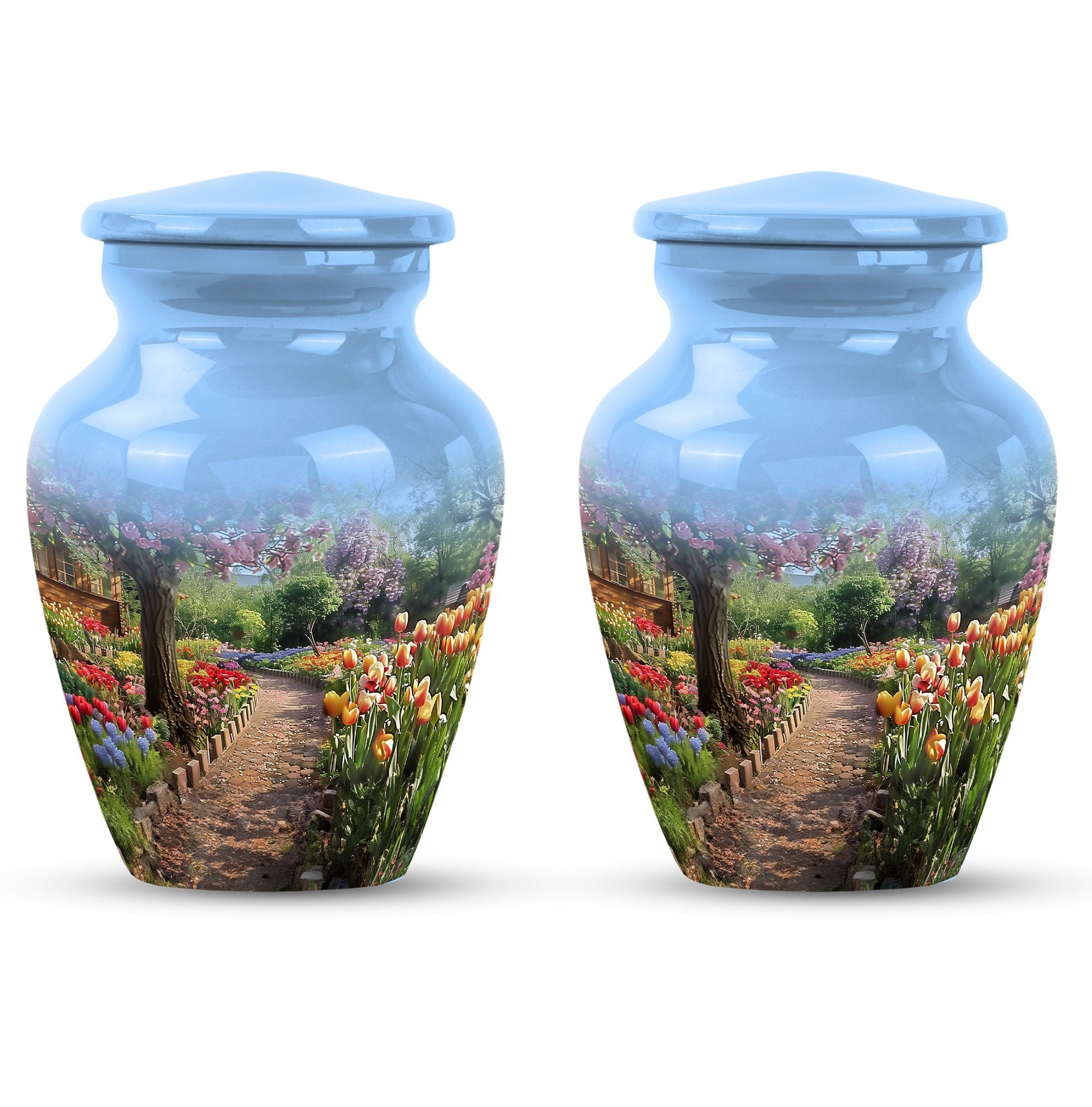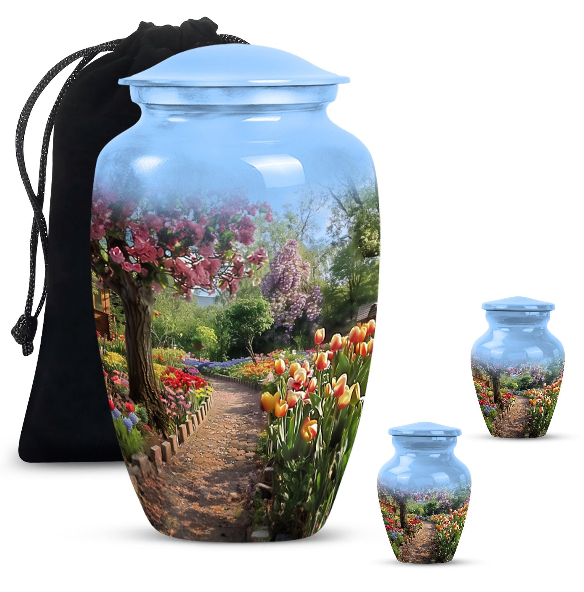 Immerse in the beauty of our Flower themed 10-inch Classic Urn, an exquisite epitome of majesty, delicate for a beloved soul. This elegantly crafted large funeral urn for female is an ultimate tribute to remembrance. Constructed with the durable aluminium, it weighs just 3.3 pounds, making it as enduring as your memories. Its capacity of 200 cubic inches keeps the essence of your loved ones close to your heart. The urn comes with a complimentary velvet pouch for containment of ashes, treating delicateness with love and care. You can personalize the cremation urn with engraved names, adding an essence of personal touch. Uncommon in community, these large urns outstand with their floral themes and impeccable designs. The FLOWERS Urn has a stand too, beautifully shaped, adding to the overall elegance. Remember, cherish, and preserve with our range of memorial urns, and express your enduring love and respect.