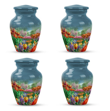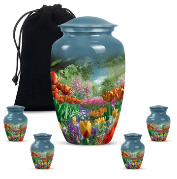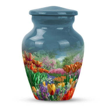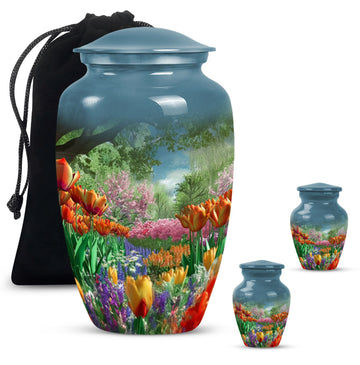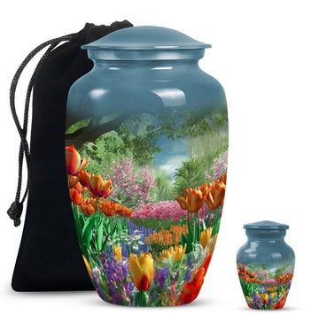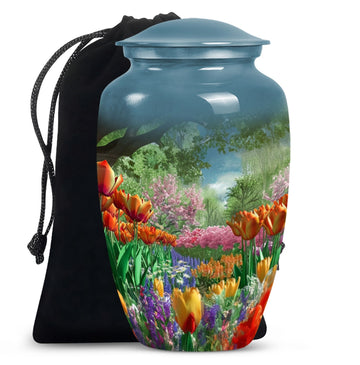 Encapsulate your loved one's memory in a tangible tribute with our FLOWERS Urn, a perfect memorial piece for male adults. This large aluminium urn, stands at a commanding 10 inches and boasts a sturdy weight of 3.3 pounds. Immaculately crafted, it holds a generous capacity of 200 cubic inches, making it suitable even for companion usage as it can respectfully hold the remains of two adults. The urn's flowers theme adds a serene touch, denoting peace and eternal rest. The package includes a plush velvet pouch for the secure containment of ashes. Express your personal touch by personalizing the urn with engraved names. Our sturdy and tasteful FLOWERS urn concretizes cherished memories, making the task of choosing memorial urns less daunting. Remember, this is more than just a large metal urn for ashes - it's a heartfelt touch to a delicate process.