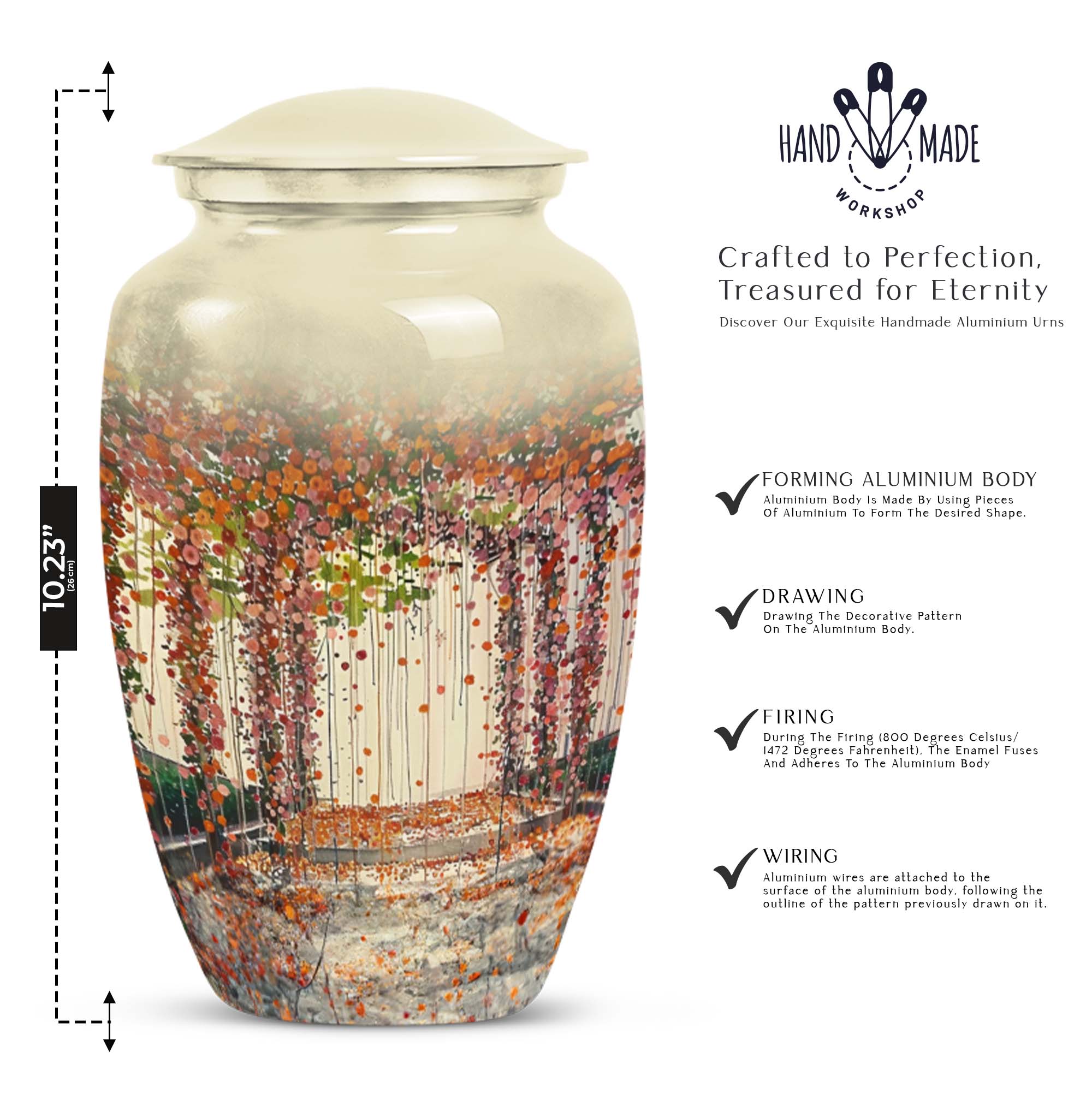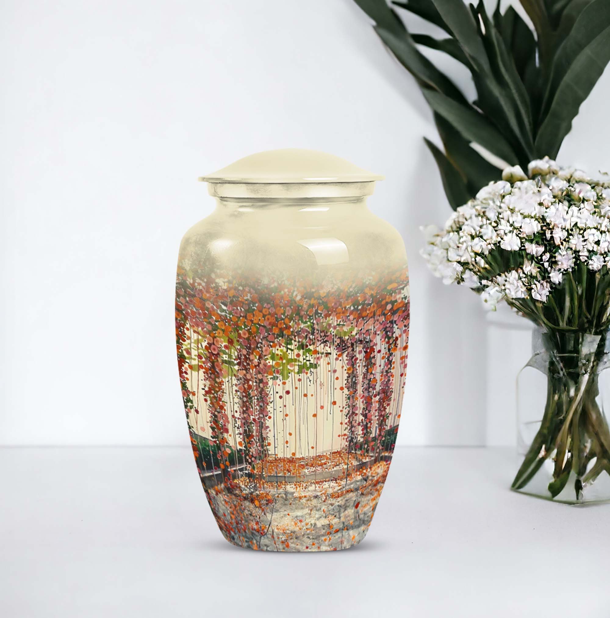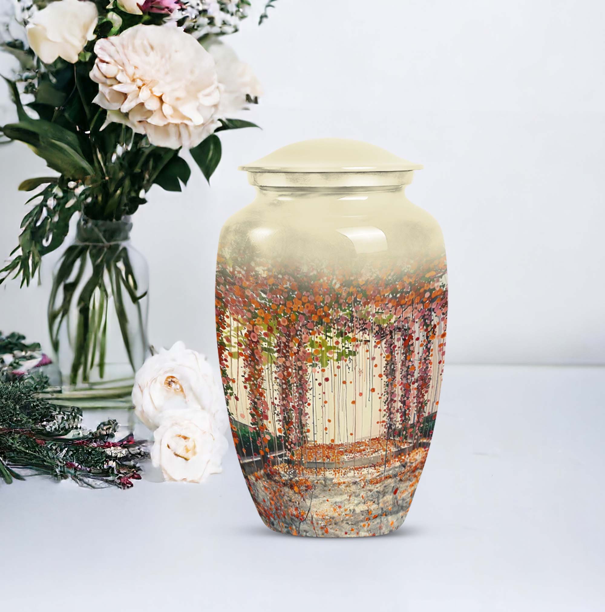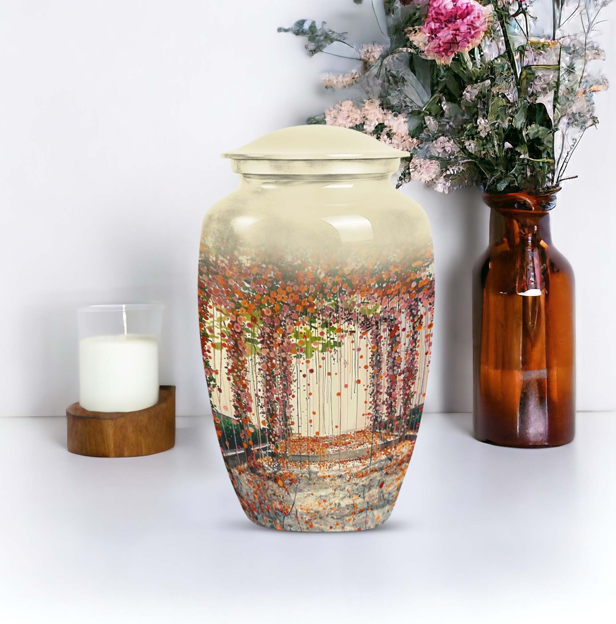 The FLOWERS Urn is an elegant solution for a dignified farewell, making it one of the most sought-after cremation urns for human ashes of adult males. In a classic 10-inch size, its traditional urn design commemorates your loved one with beauty and grace. Constructed of robust aluminium, this large urn boasts a flower theme that offers a serene tribute. Weighing a steady 3.3 pounds and standing tall at 10 inches, this urn can safely contain up to 200 cubic inches of precious ashes. It comes with a lustrous velvet pouch for careful containment of the remaining ashes. As we believe in making each memorial unique, it offers the option to personalize with engraved names. This urn provides a fitting home for your loved one's remains, adding to the range of adult-sized, funeral and burial urns for ashes. Commemorate their presence in our lives with these tastefully crafted memorial urns.