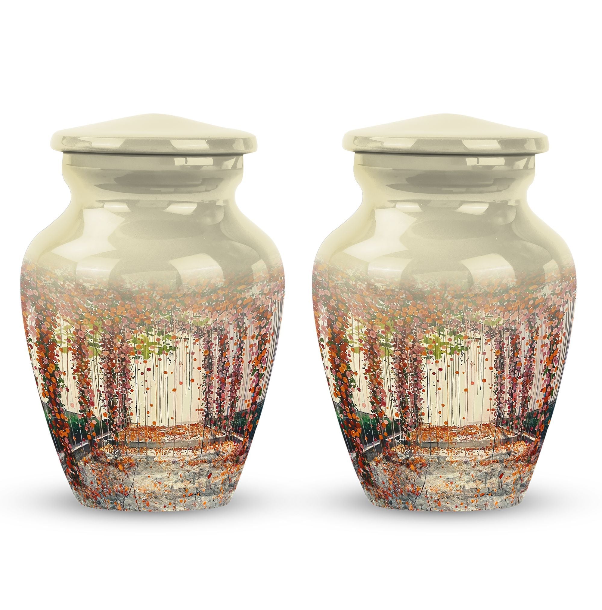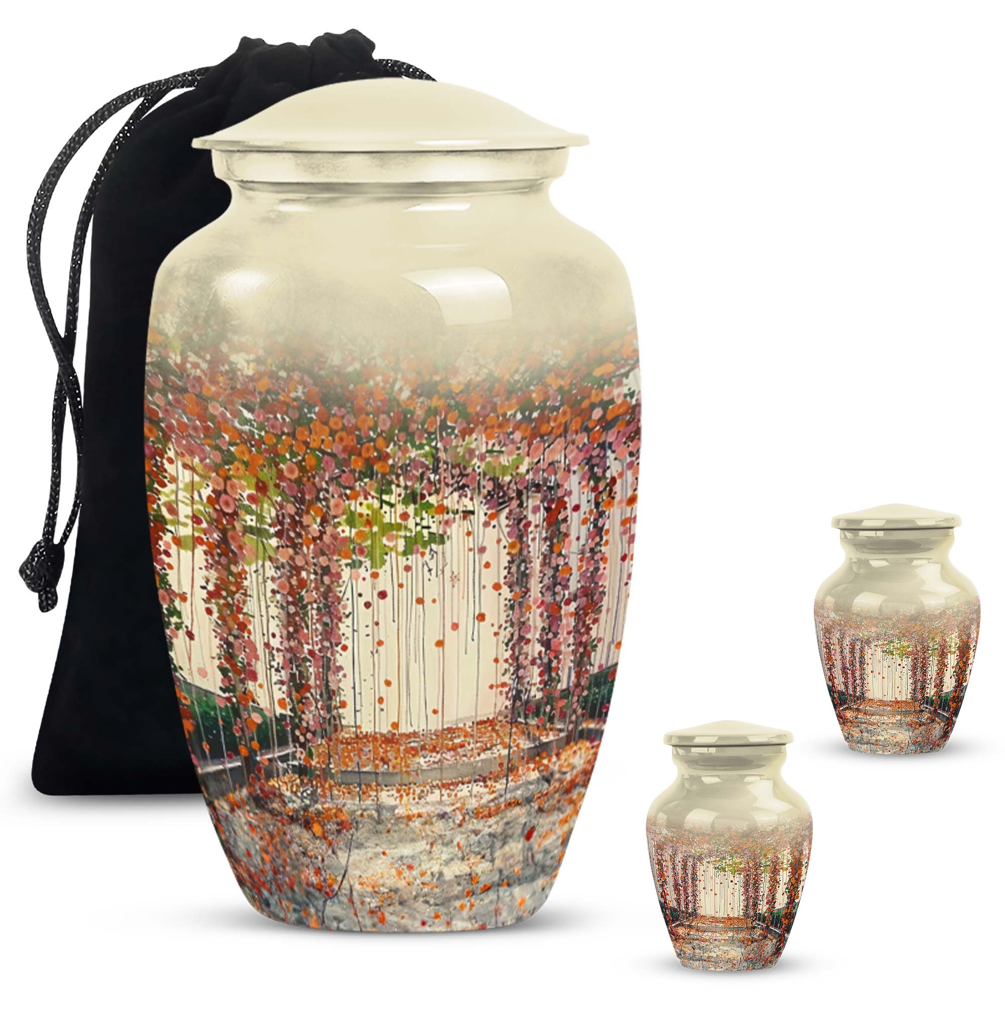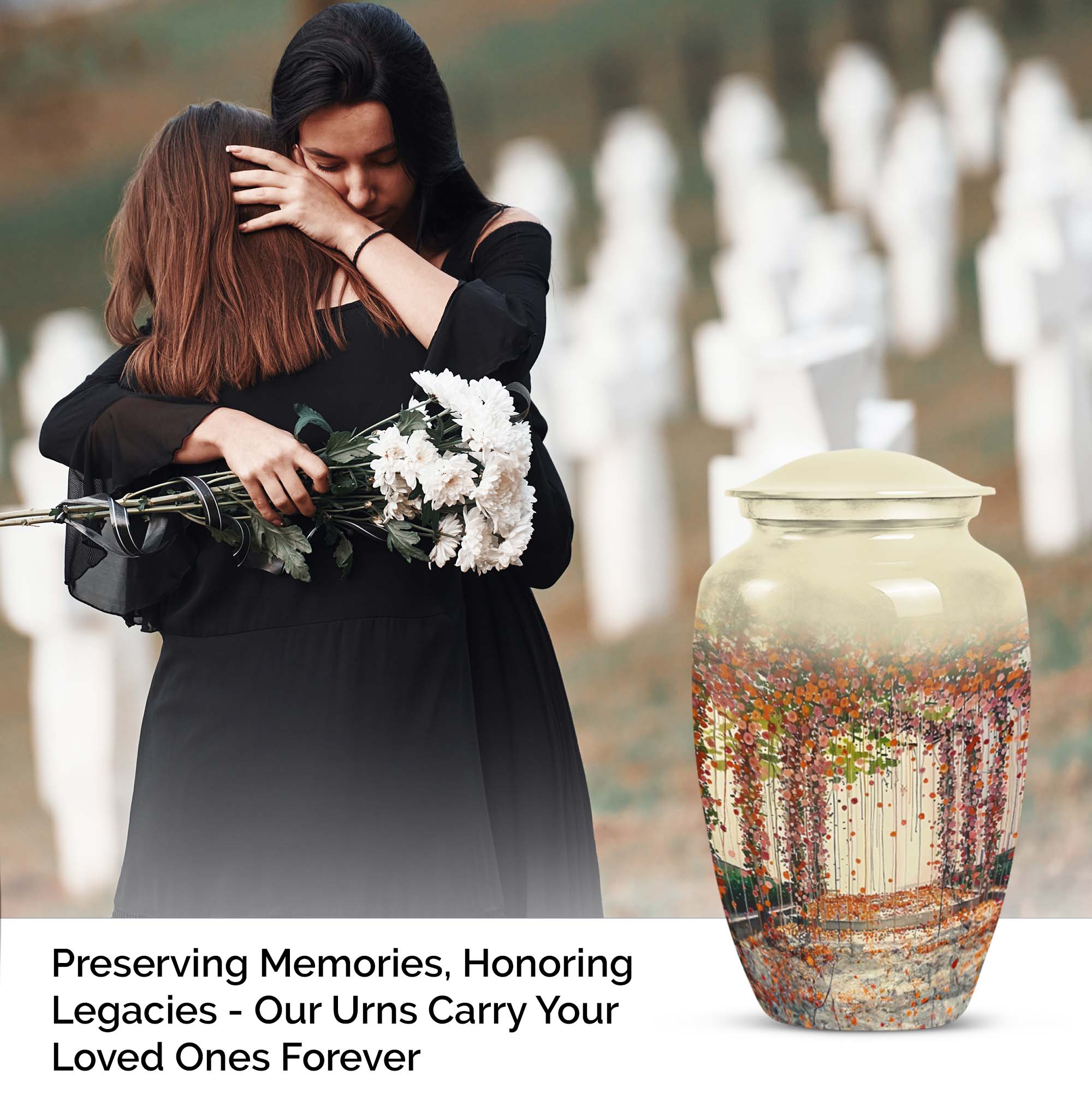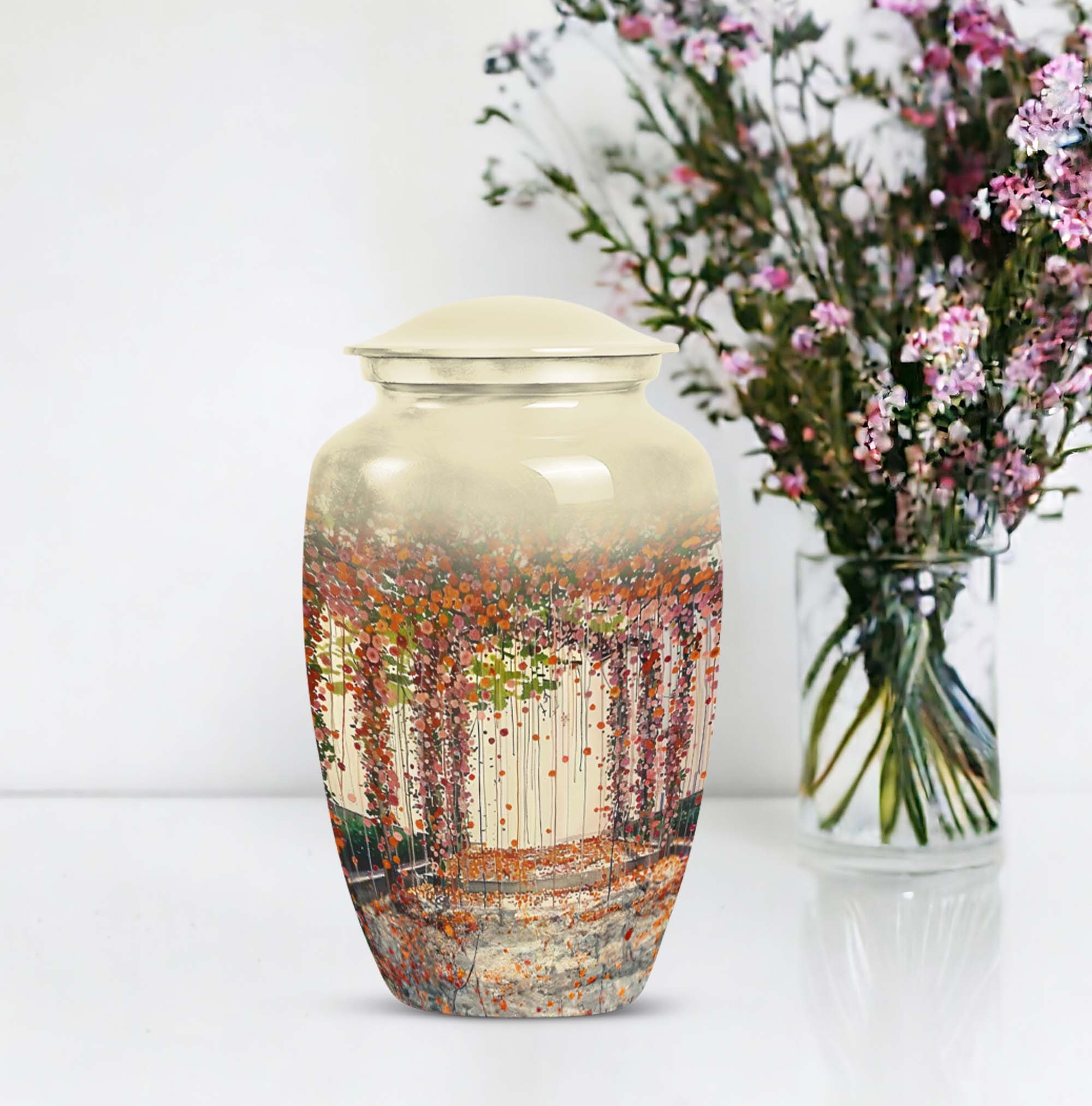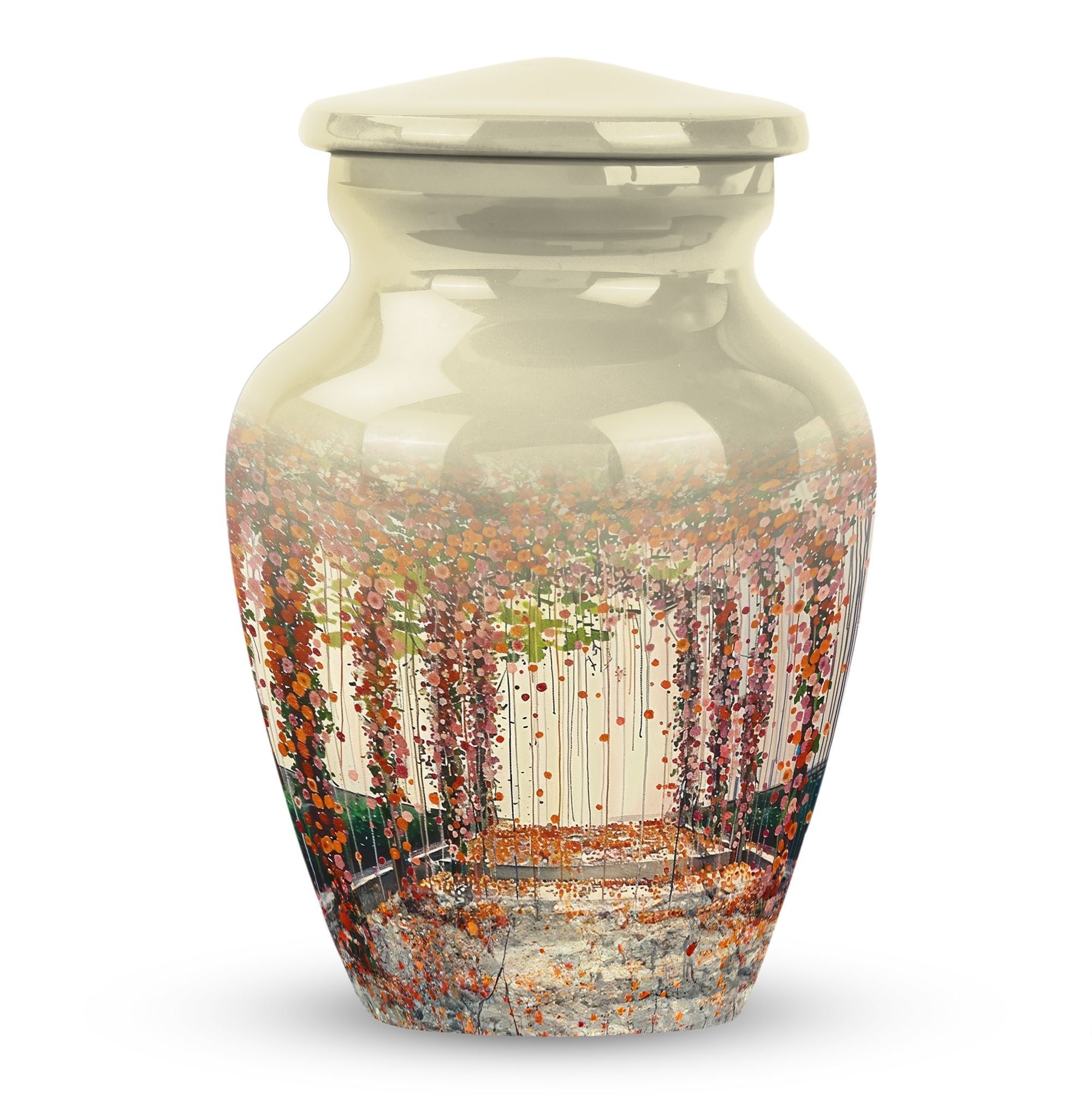 The FLOWERS Urn is an elegant solution for a dignified farewell, making it one of the most sought-after cremation urns for human ashes of adult males. In a classic 10-inch size, its traditional urn design commemorates your loved one with beauty and grace. Constructed of robust aluminium, this large urn boasts a flower theme that offers a serene tribute. Weighing a steady 3.3 pounds and standing tall at 10 inches, this urn can safely contain up to 200 cubic inches of precious ashes. It comes with a lustrous velvet pouch for careful containment of the remaining ashes. As we believe in making each memorial unique, it offers the option to personalize with engraved names. This urn provides a fitting home for your loved one's remains, adding to the range of adult-sized, funeral and burial urns for ashes. Commemorate their presence in our lives with these tastefully crafted memorial urns.
