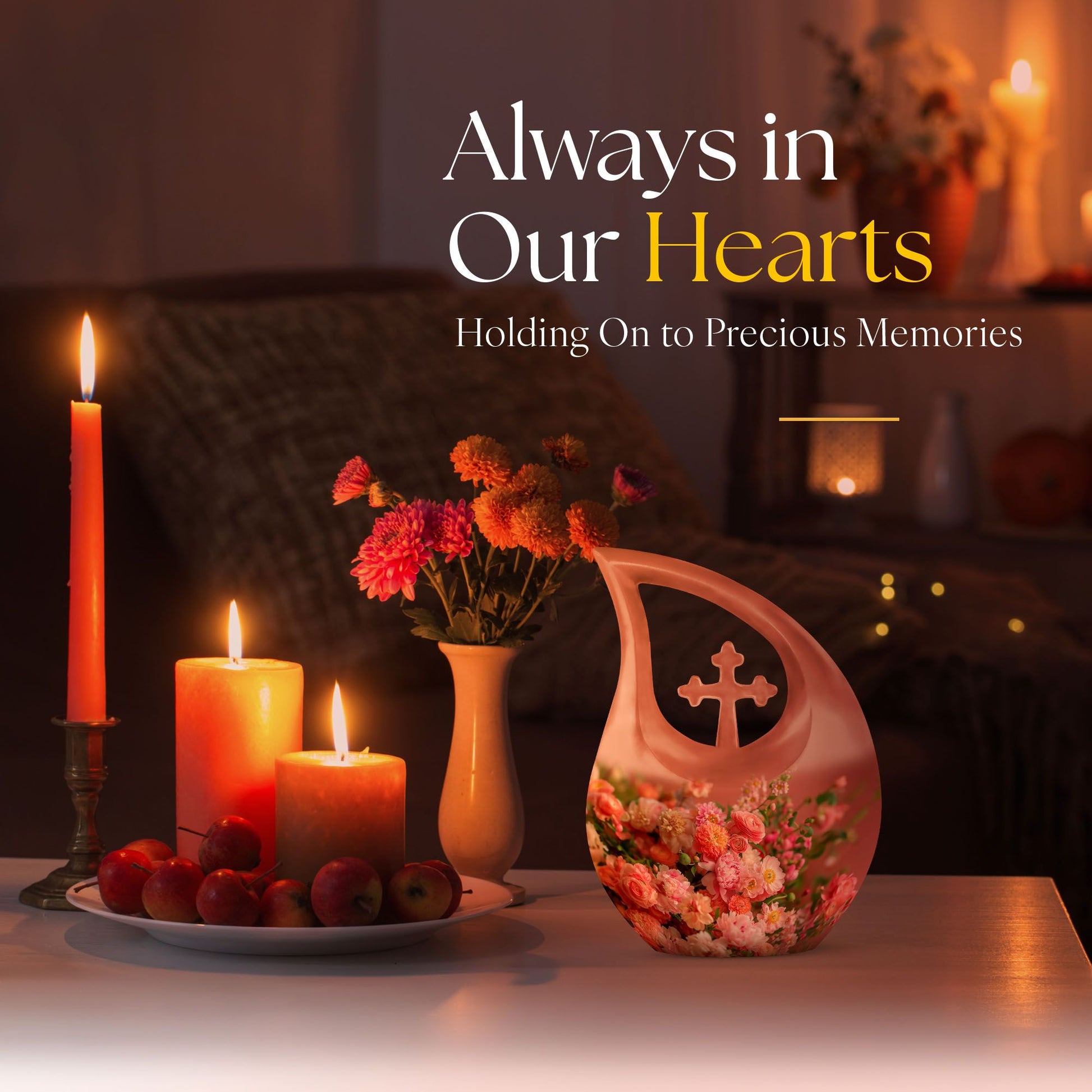 Crafted with meticulous attention to detail, this urn features a delicately hand-painted floral pattern over a polished finish, symbolizing serenity and peace. Made from high-quality aluminum, this large decorative burial urn is designed to last, ensuring safe preservation of ashes for generations. Ideal for ashes keepsake women, urn ashes men, or urns women human ashes, it brings comfort and calm to any setting.