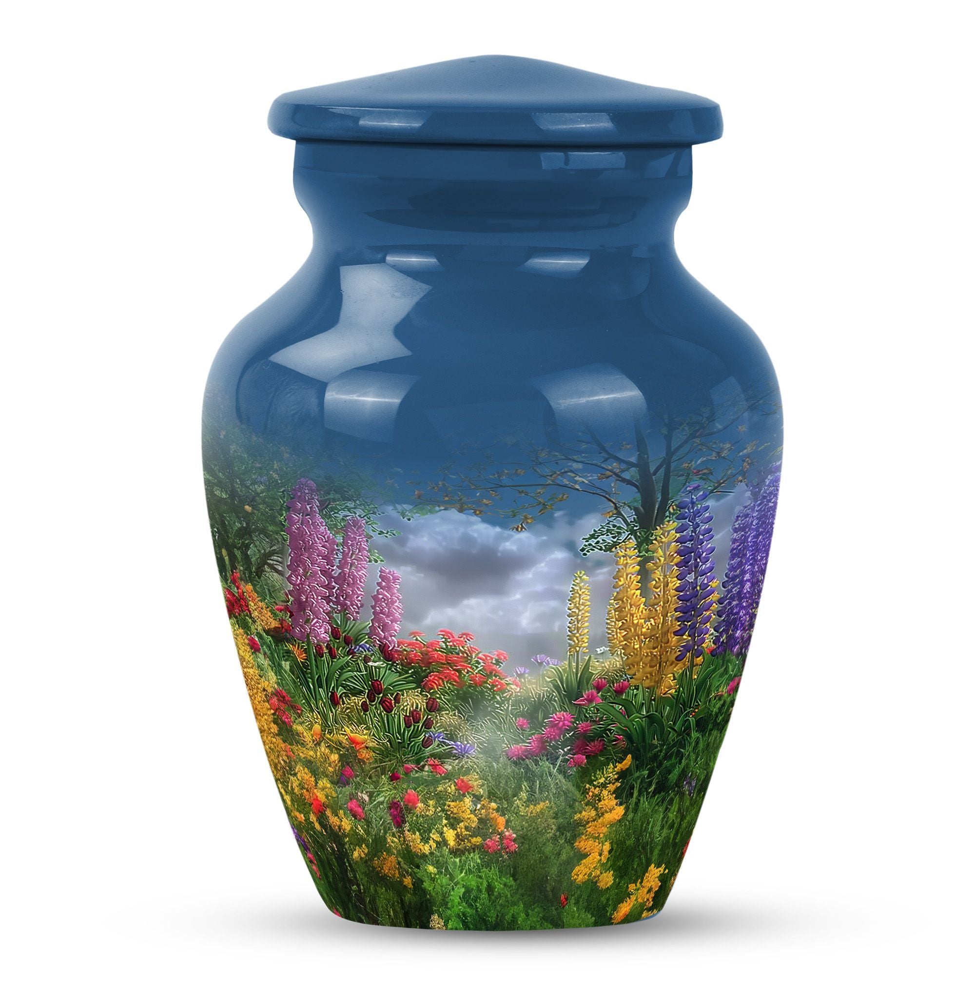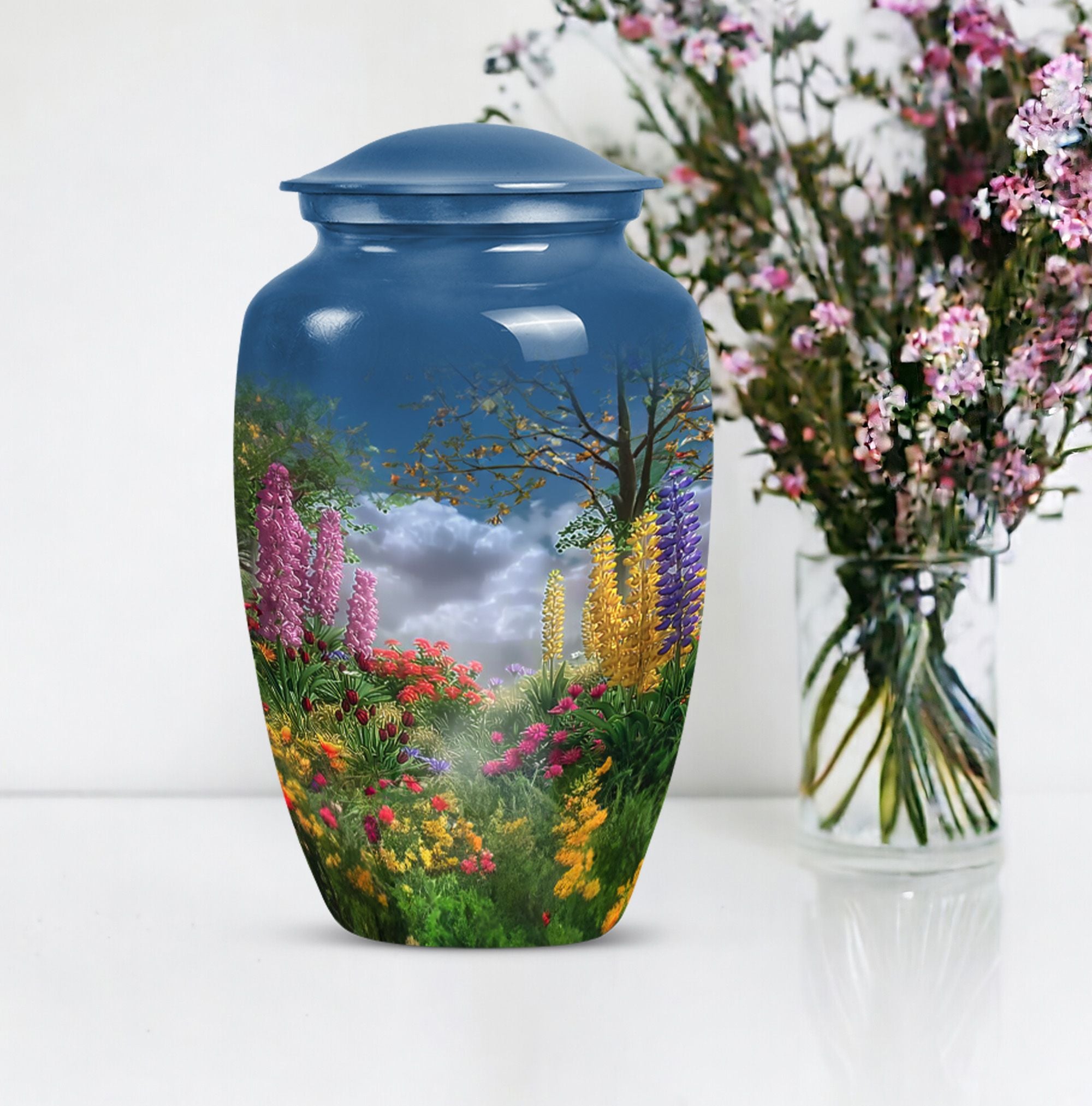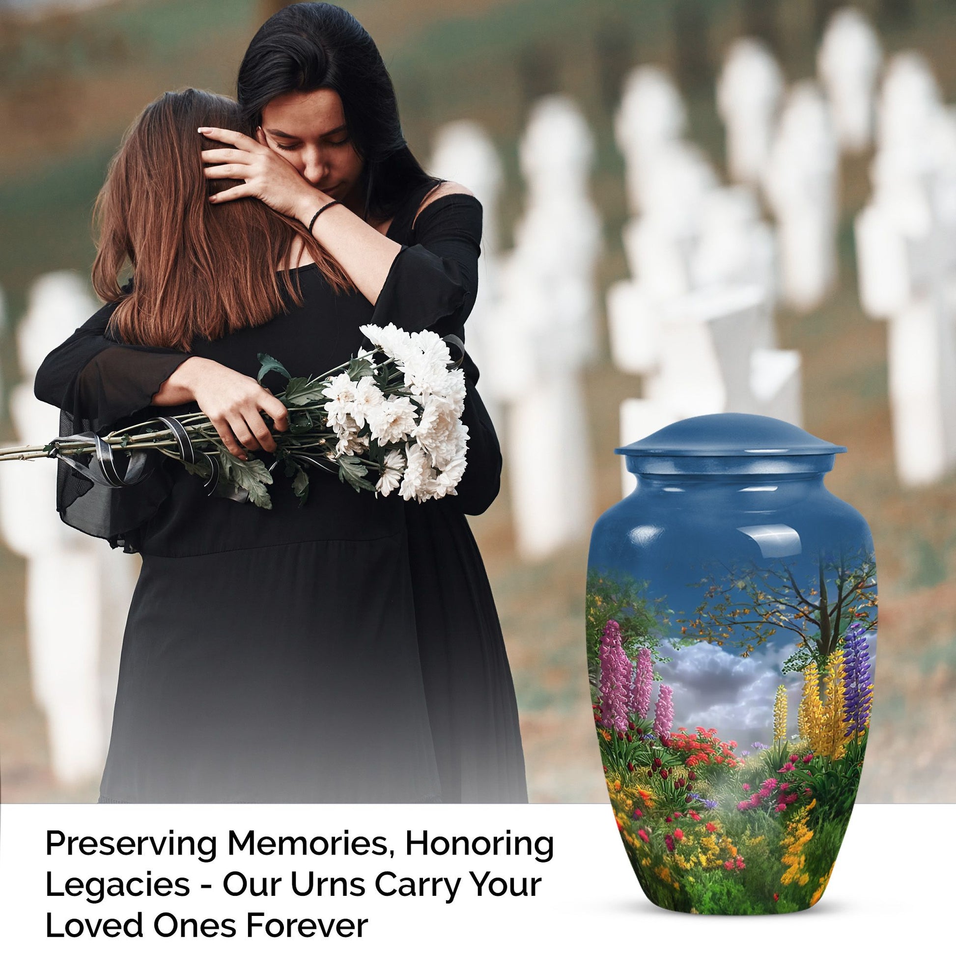 Find solace in the memorial appreciation of your beloved with our FLOWERS Urn, a prestigious and time-honored memorial urn for women ashes. Tailored from high-quality aluminium, this large urn guarantees top-tier durability and an impressive longevity. With a 200 cubic inches capacity, it comfortably houses the ashes of an adult female. Its impressive size - 10 inches high - and weight of 3.3 pounds reflect its sturdy construction and grandeur. Apart from the attractive floral theme that adorns the urn, it also offers personalization via engraved names, adding an intimate, personalized, and lasting touch to the memory of the departed. The urn is sufficiently sized for ground burial and can also serve as a lasting keepsake. On purchase, each urn comes with a velvet pouch for containment of ashes, ensuring your cherished memories are preserved with utmost respect and dignity. Our cremation urn promotes a tranquil and gentle remembrance, making it a perfect and meaningful choice for your memorial ceremony supplies.