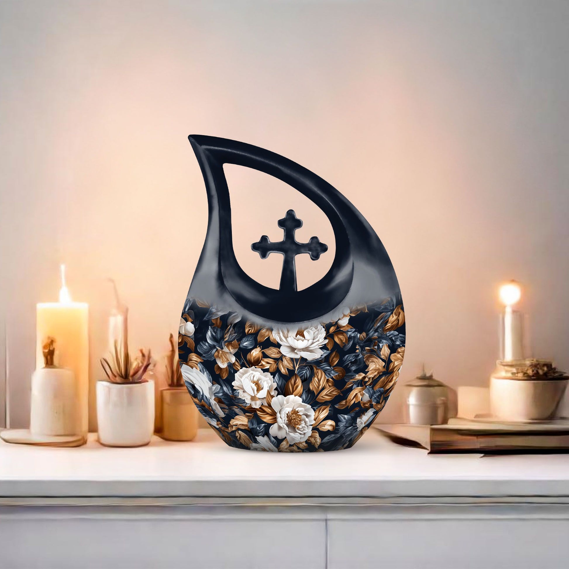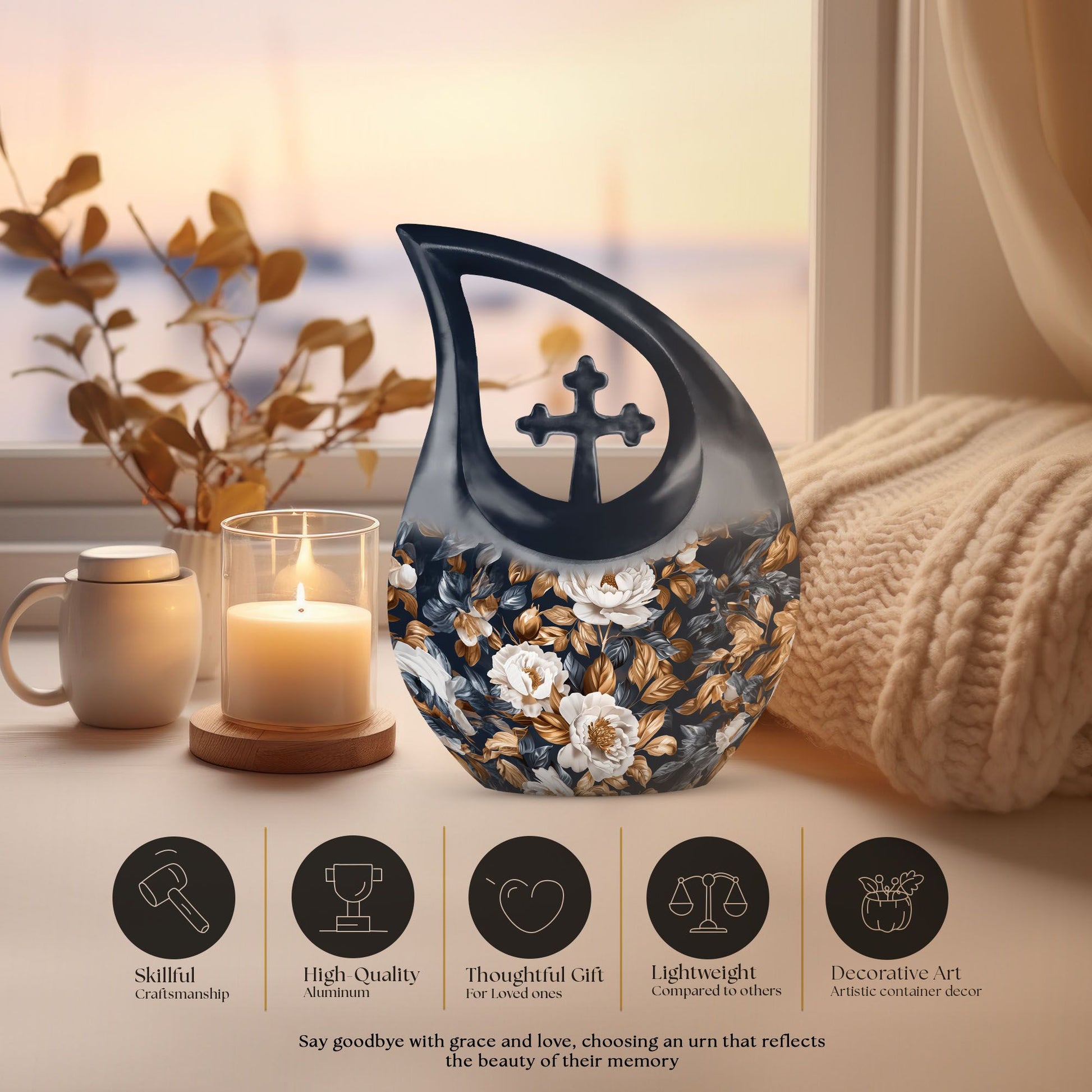 Honor the memory of a loved one with our 10-inch Flowers Urn, a thoughtfully designed large urn that subtly blends aesthetics and sentiment. Crafted from high-quality aluminum, it exhibits timelessness and longevity in the realm of 'memorial urns'. The ”Cross Drop” design resonates with serenity and sanctity that's synonymous with remembering the departed. The urn can hold up to 200 cubic inches, a substantial capacity suitable for adult and senior remains. It has a weight of 3.3 pounds and dimensions of 10 inches in height, which adds to its dignified presence. We offer the possibility of personalizing it with the engraved names, making it a unique memorial piece. The urn comes packaged in a velvet pouch, ensuring safe containment of ashes. Our product line also includes 'Miniature Urns For Ashes', 'Blue Urn For Ashes', and 'Garden Urns For Ashes' which are available for purchase. Make your selection from our 'Metal Cremation Urns' – a tangible embodiment of precious memories and love.