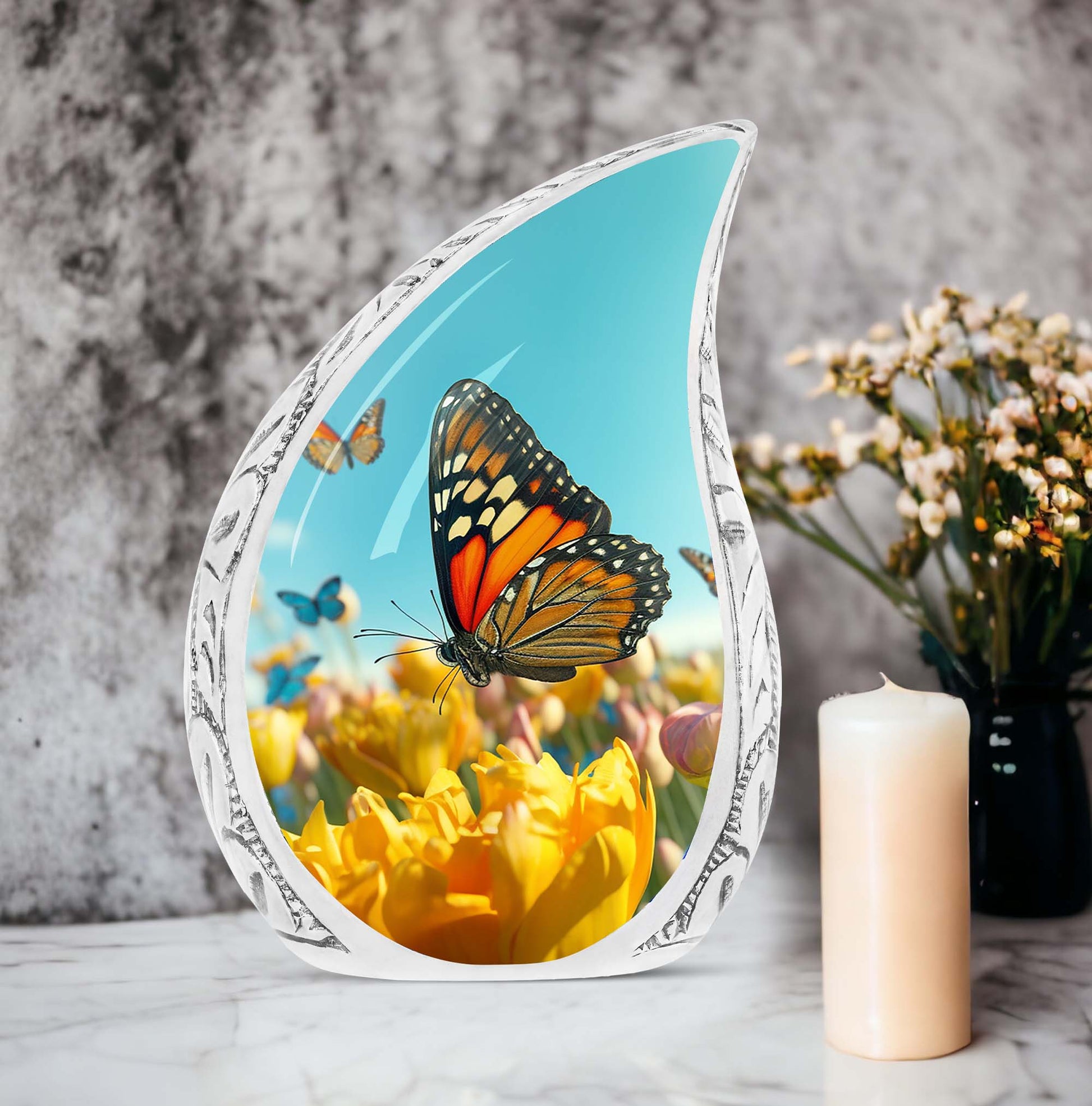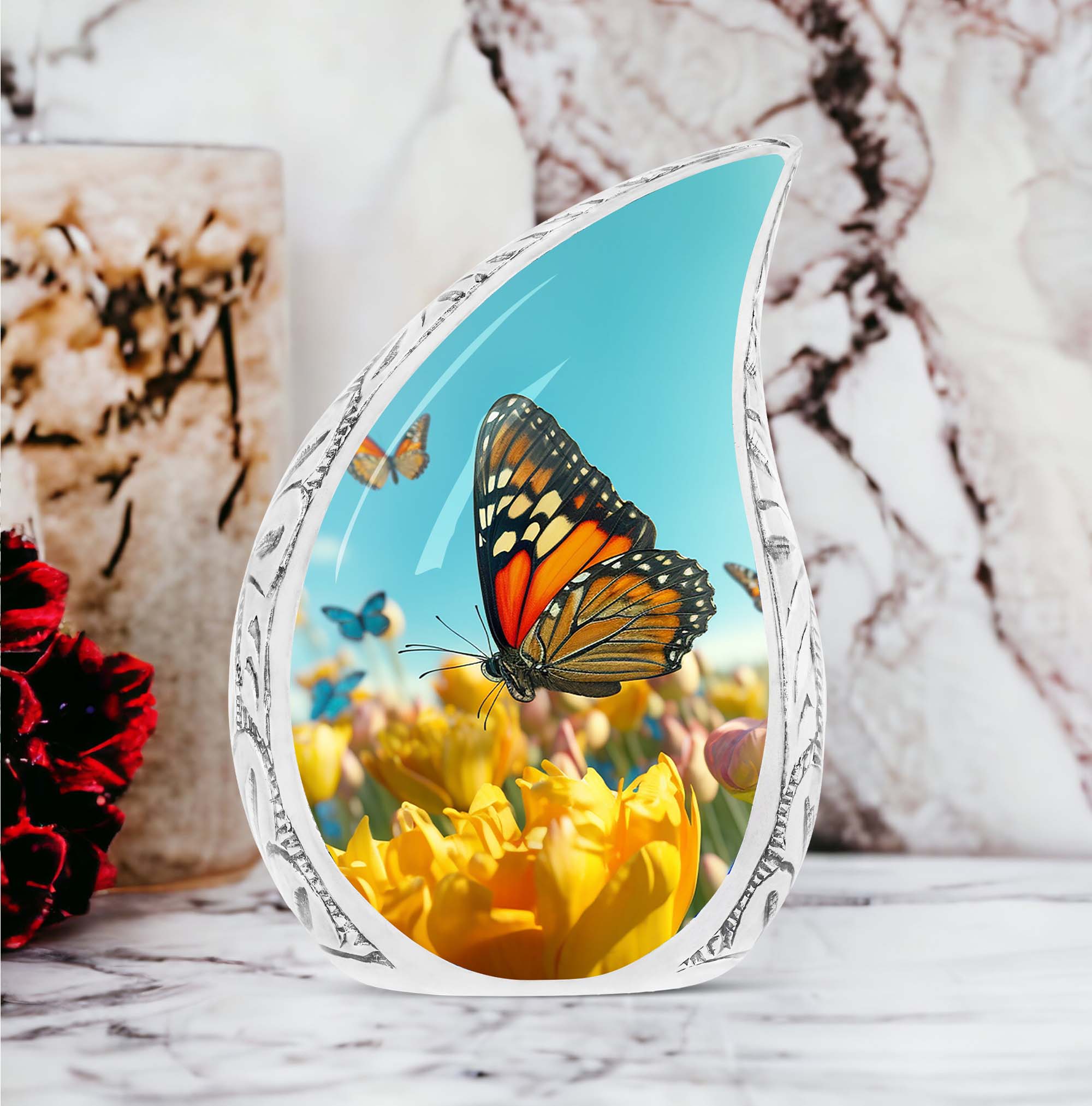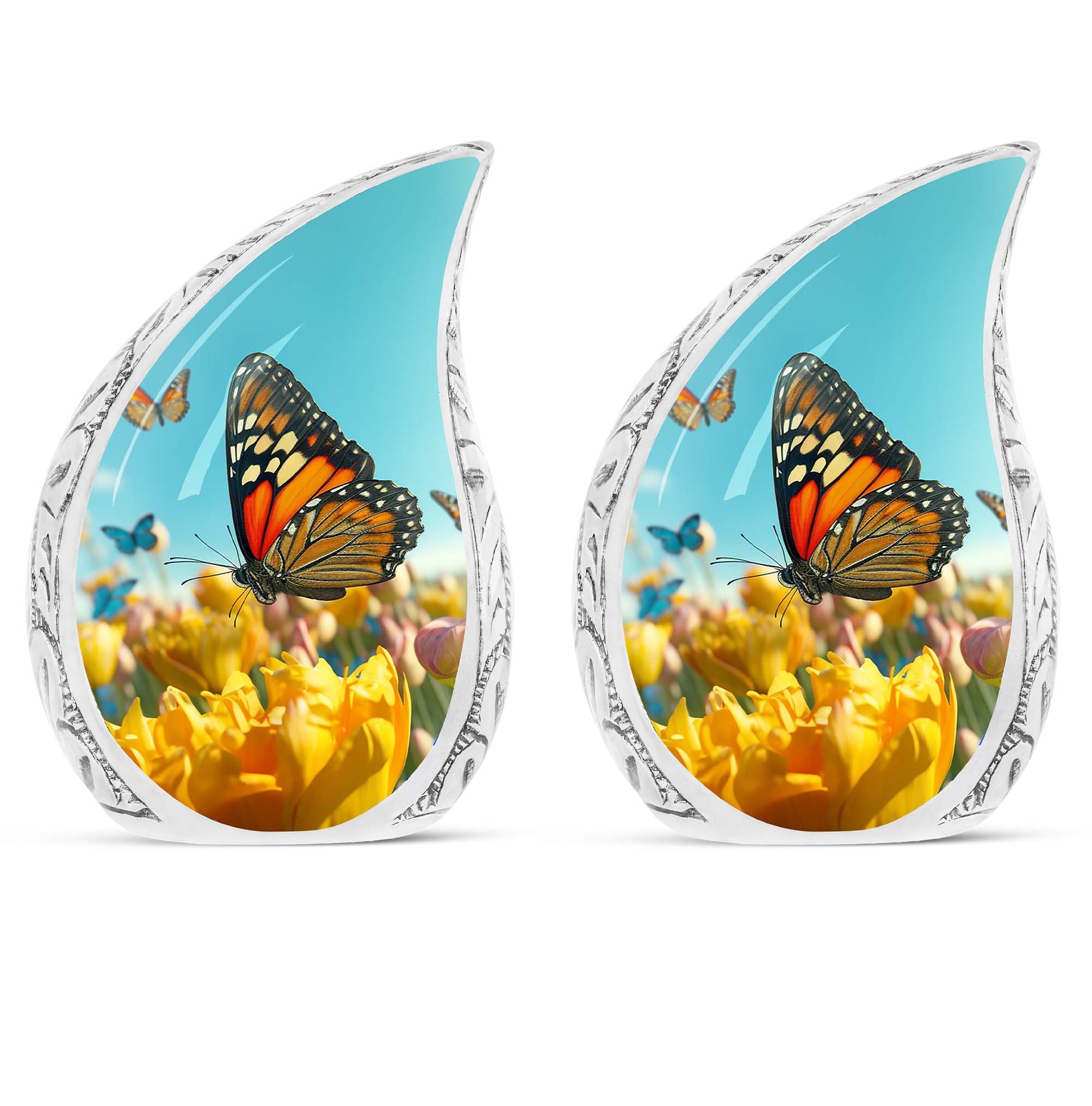 Cherish the memory of your departed loved ones with our elegant Butterflies Cremation Urn, a unique selection from our range of memorial urns. Sized at a compact 3 inches and weighting just 3.3 pounds, this exquisitely crafted large urn combines practicality with elegance. Its 10 inches height and 200 cubic inches capacity comfortably houses the ashes, safely stored within a complimentary velvet pouch, included in the package. The urn is crafted using sturdy aluminium, ensuring longevity and durability. Styled in a timeless Classic Urn design, you have the option to personalize it with engraved names, adding a special touch to remember your loved one. This keepsake urn merges tradition with a modern approach, making it a cherished addition to any household. Enhance the memories with our Butterflies Cremation Urn, a beautiful blend for your burial urns for ashes collection.