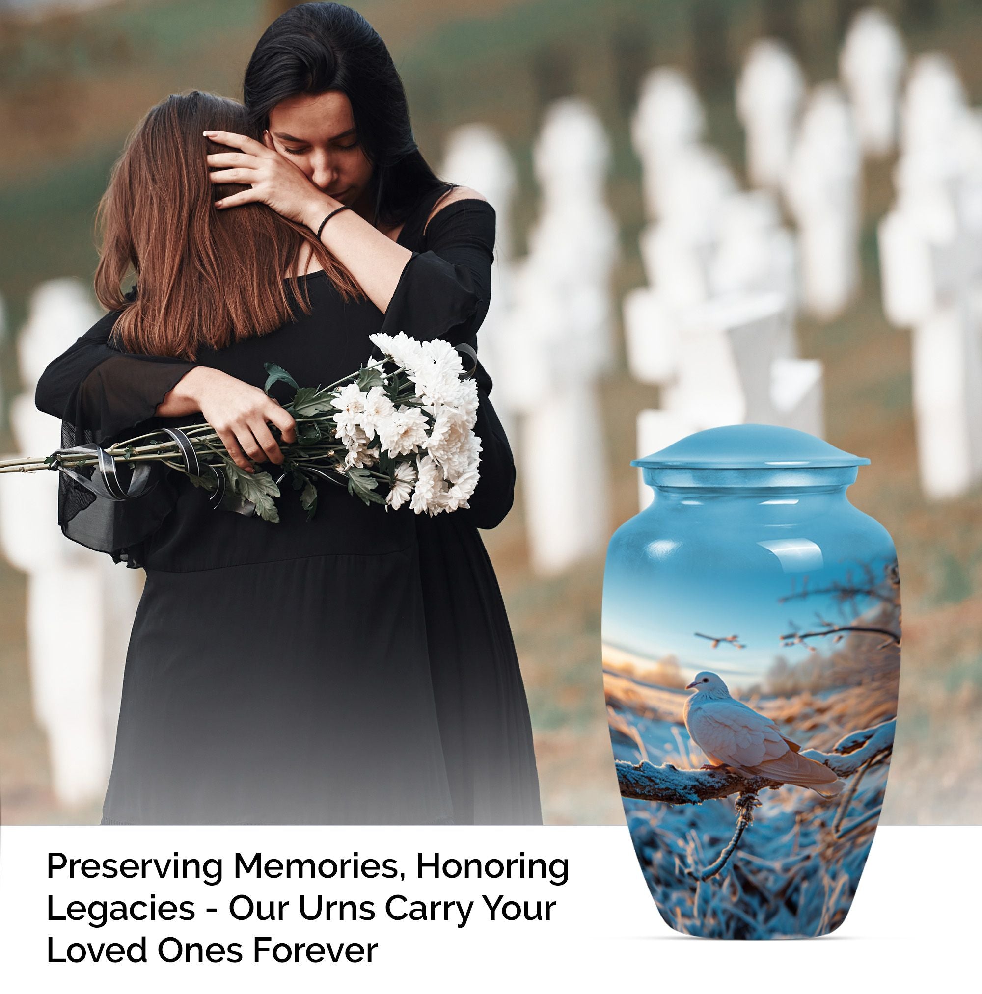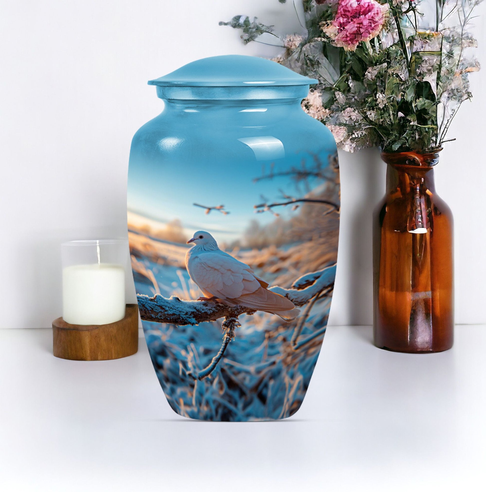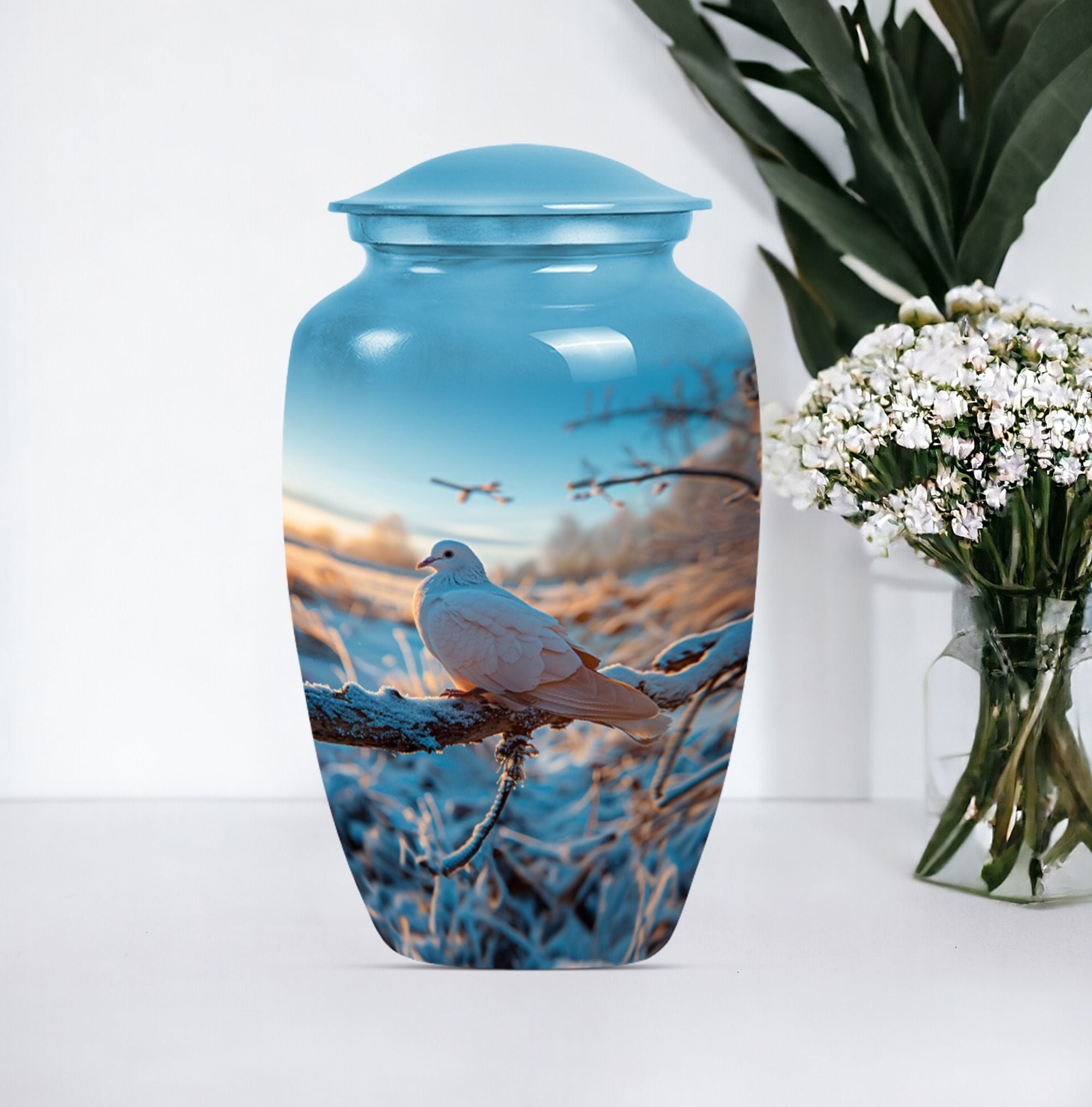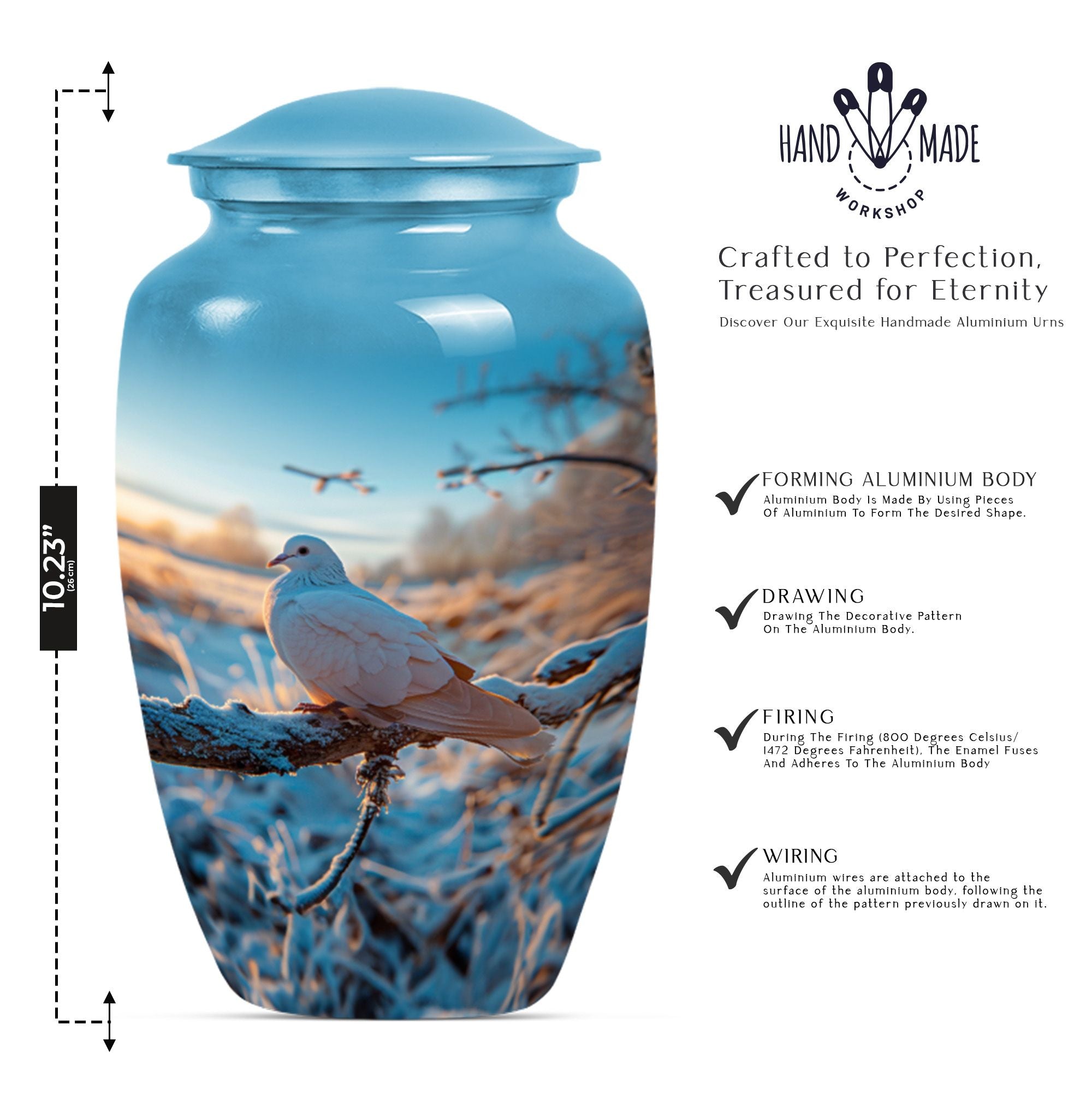 Comfort, remembrance, and respect take on a new level with our beautifully crafted dove Urn. Our 10-inch burial urn is an impeccable choice for storing cremation ashes, a touching tribute to your departed. Weighing a stable 3.3 pounds, the memorial urn's robust build reflects the strong bond shared with your loved one. Its sizeable capacity of 200 cubic inches ensures ample space. The urn, made from high-grade aluminium, exudes sturdiness and long-lasting quality. It also offers a personal touch with the option to engrave names, threading an intimate bond with the dearly departed. The urn comes with a velvet pouch for secure containment of ashes. The abstract theme represents the transcendental journey of life, offering a poignant symbol. Opt for this signature large urn, and honor the memory of your loved one with a worthy resting place. Ideal for adult human ashes, this cremation urn sets an eternal abode for your beloved.