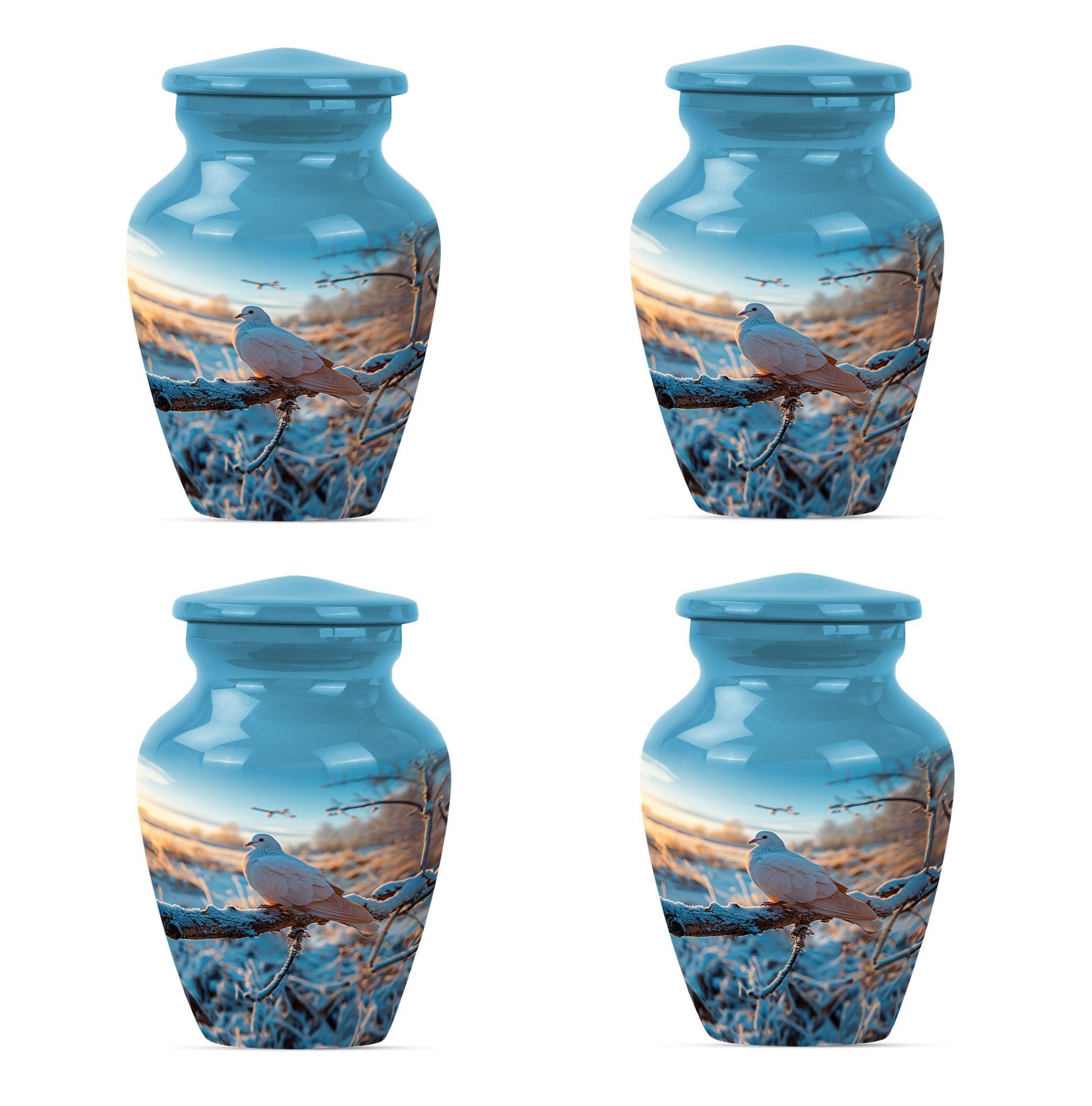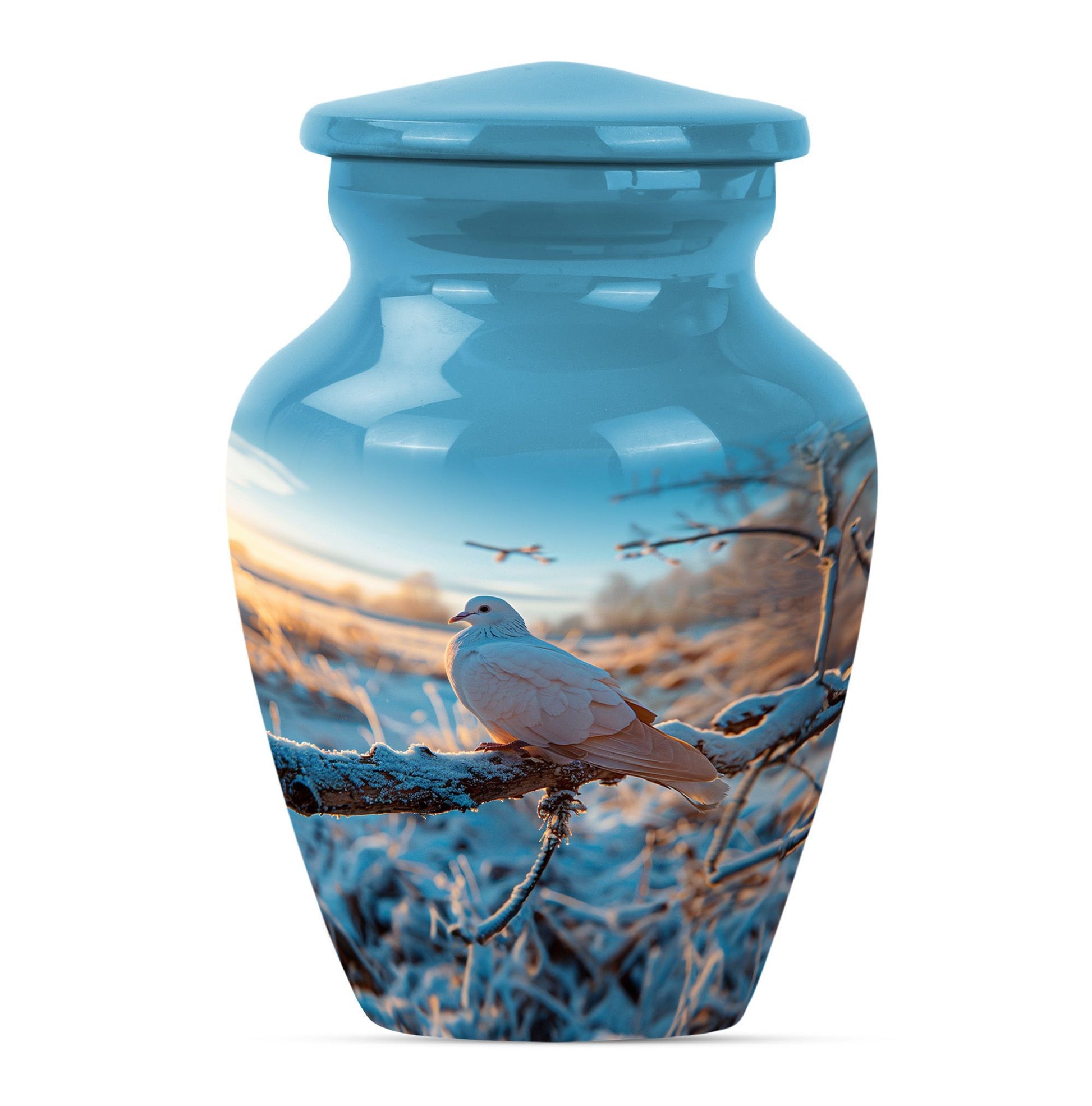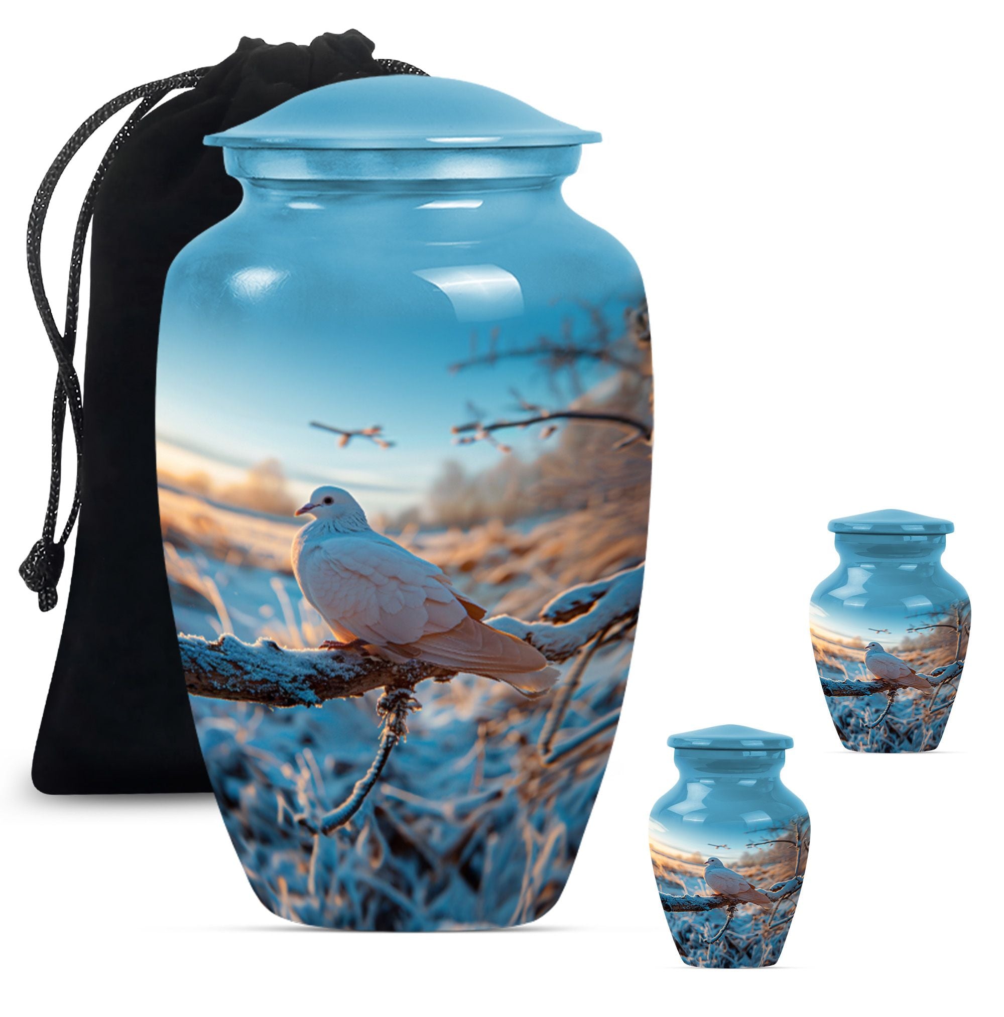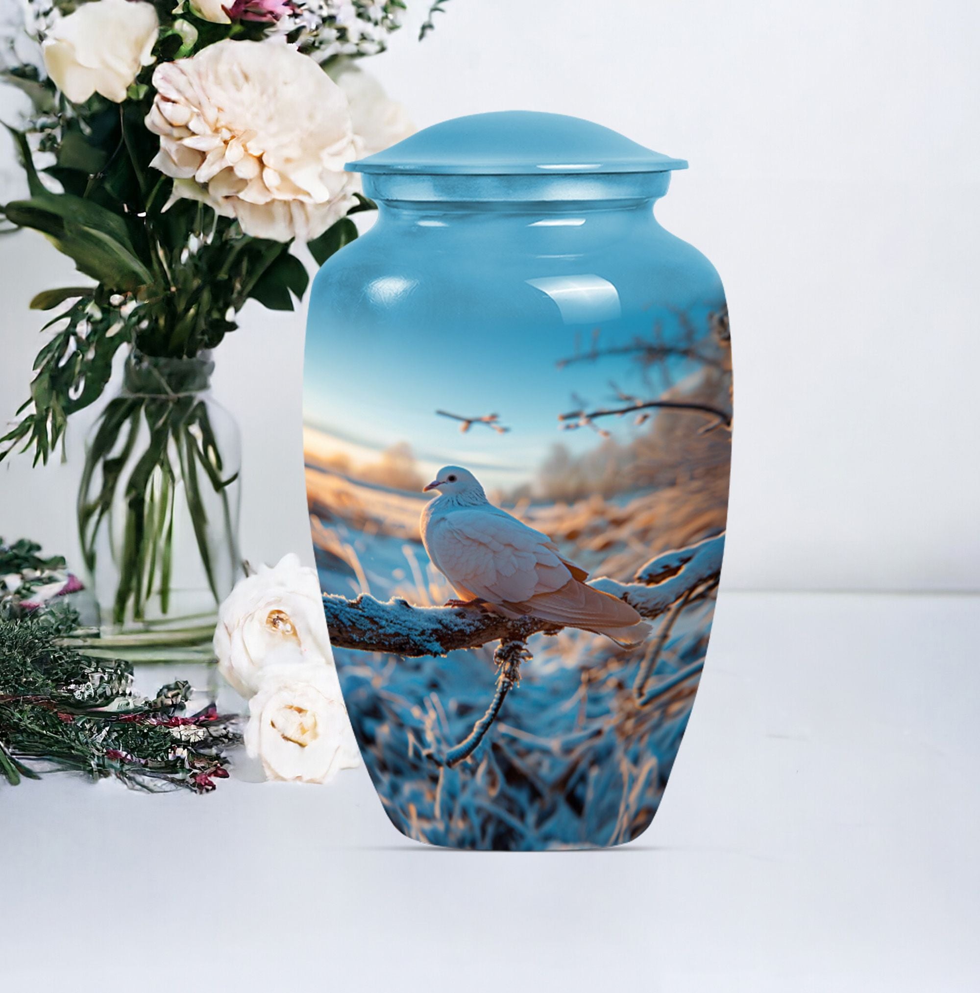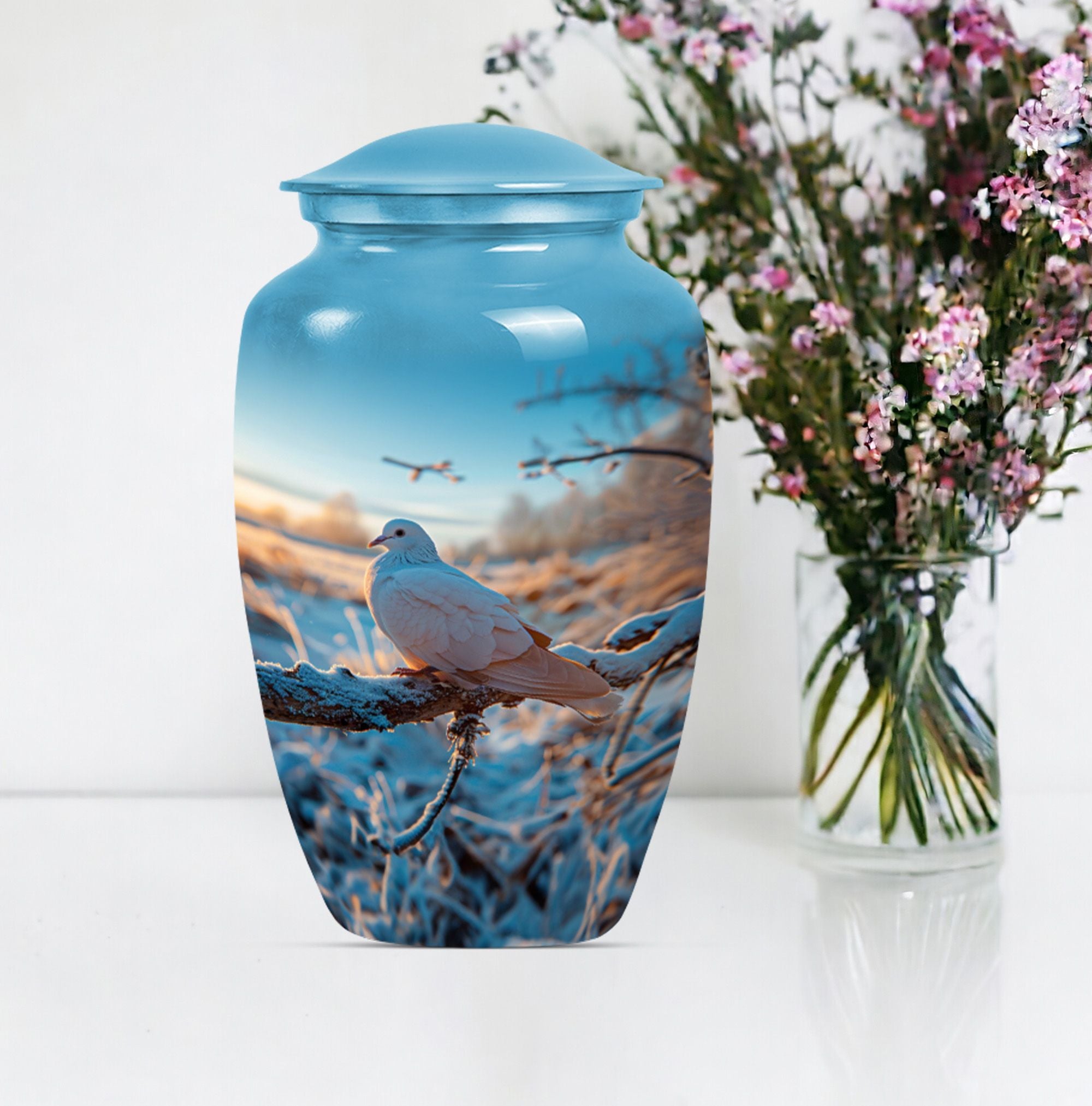 Comfort, remembrance, and respect take on a new level with our beautifully crafted dove Urn. Our 10-inch burial urn is an impeccable choice for storing cremation ashes, a touching tribute to your departed. Weighing a stable 3.3 pounds, the memorial urn's robust build reflects the strong bond shared with your loved one. Its sizeable capacity of 200 cubic inches ensures ample space. The urn, made from high-grade aluminium, exudes sturdiness and long-lasting quality. It also offers a personal touch with the option to engrave names, threading an intimate bond with the dearly departed. The urn comes with a velvet pouch for secure containment of ashes. The abstract theme represents the transcendental journey of life, offering a poignant symbol. Opt for this signature large urn, and honor the memory of your loved one with a worthy resting place. Ideal for adult human ashes, this cremation urn sets an eternal abode for your beloved.