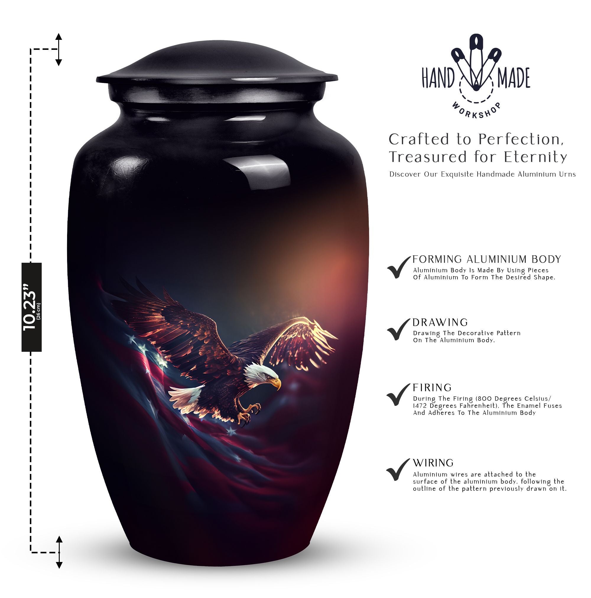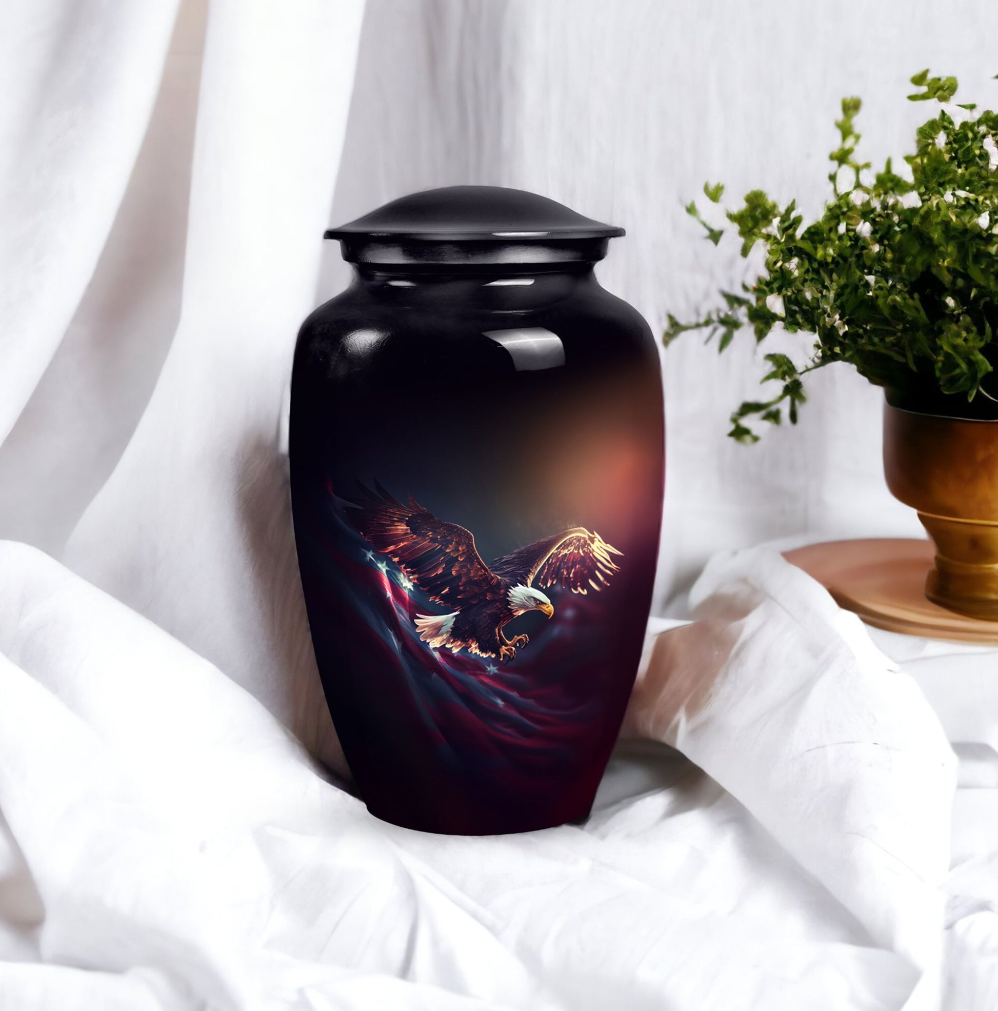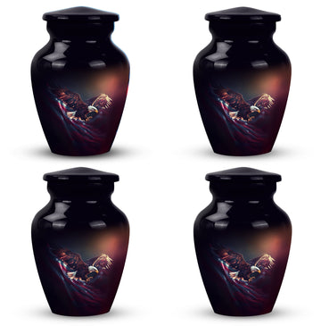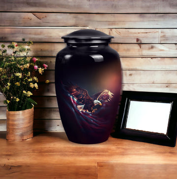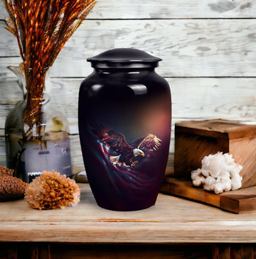 Capture the soaring spirit of your departed loved ones with our 'Flying Eagle Urns for Ashes'. This meticulously crafted piece turns memorial urns into a unique art form, celebrating life and remembrance. Spanning a height of 10 inches and weighing 3.3 pounds, this large urn provides a capacious 200-cubic-inch interior, ideal for preserving precious ashes. Made from top-tier aluminium, it boasts durability as much as a timeless aesthetic. Our urn for ashes goes beyond its primary function as cremation containers for ashes, serving as a touching tribute to your loved ones. It comes with a velvet pouch, ensuring the containment of ashes is handled with care and respect. What's more, you can personalize the urn with engraved names, adding a bespoke touch to this symbol of memory and respect. This item measures 3 inches, an ideal size to place it discreetly in your personal space. Commemorate your loved ones with our unique urns for dad, a perfect addition to your memorial ceremony supplies.