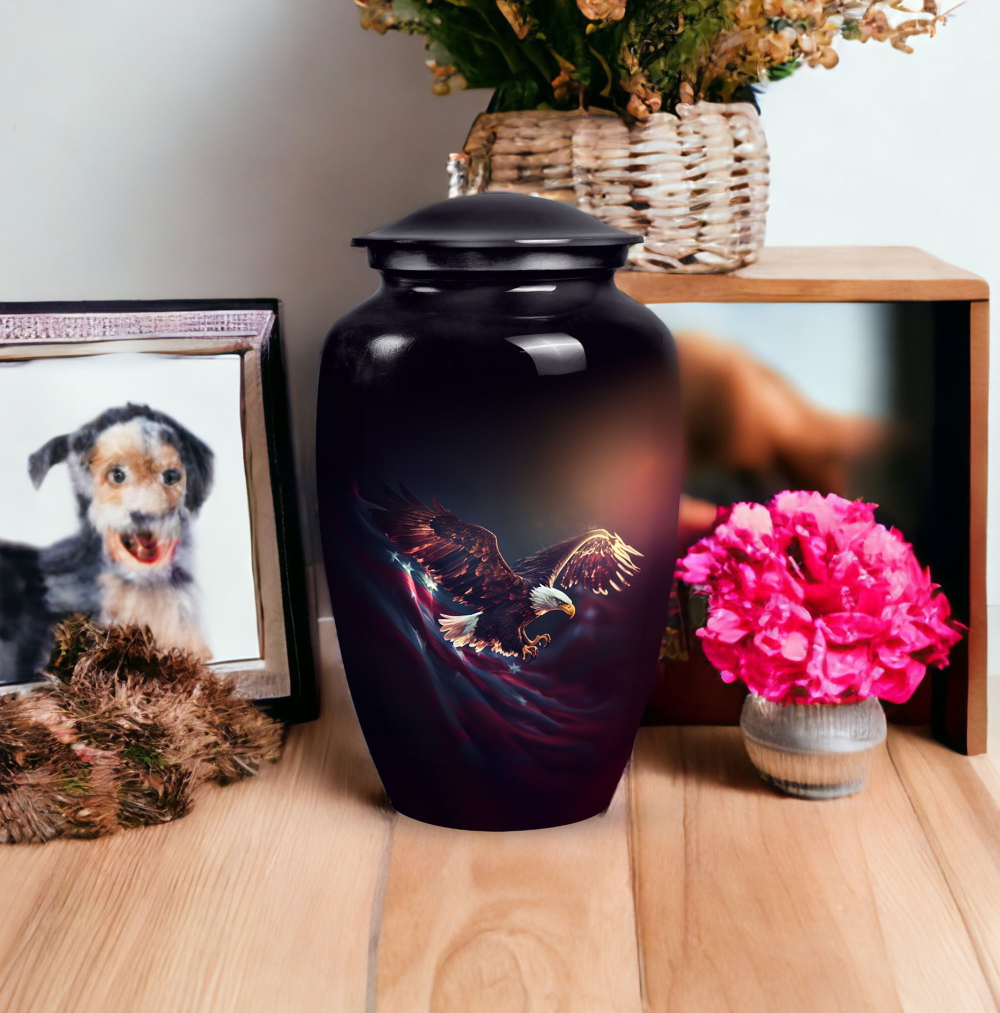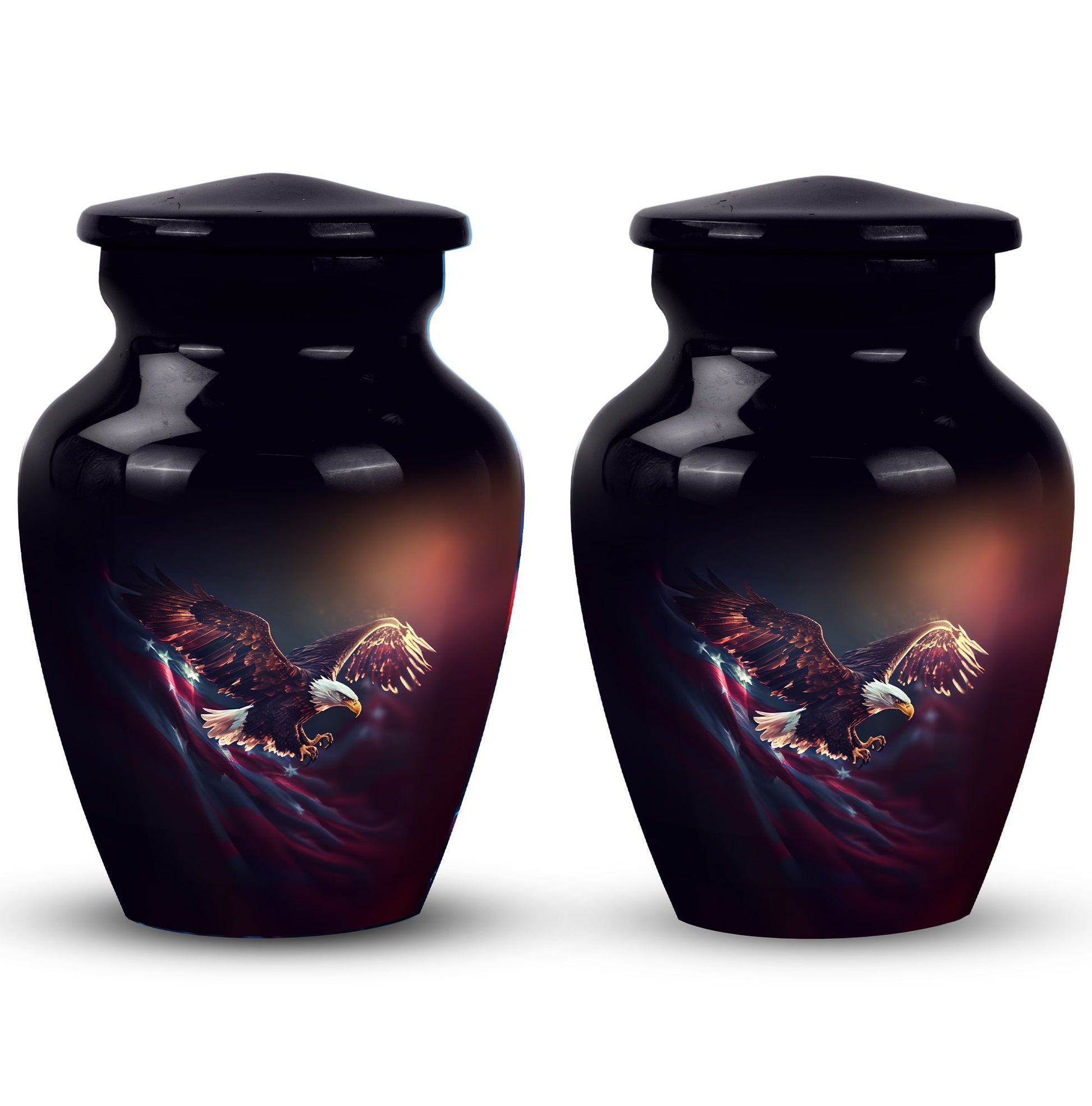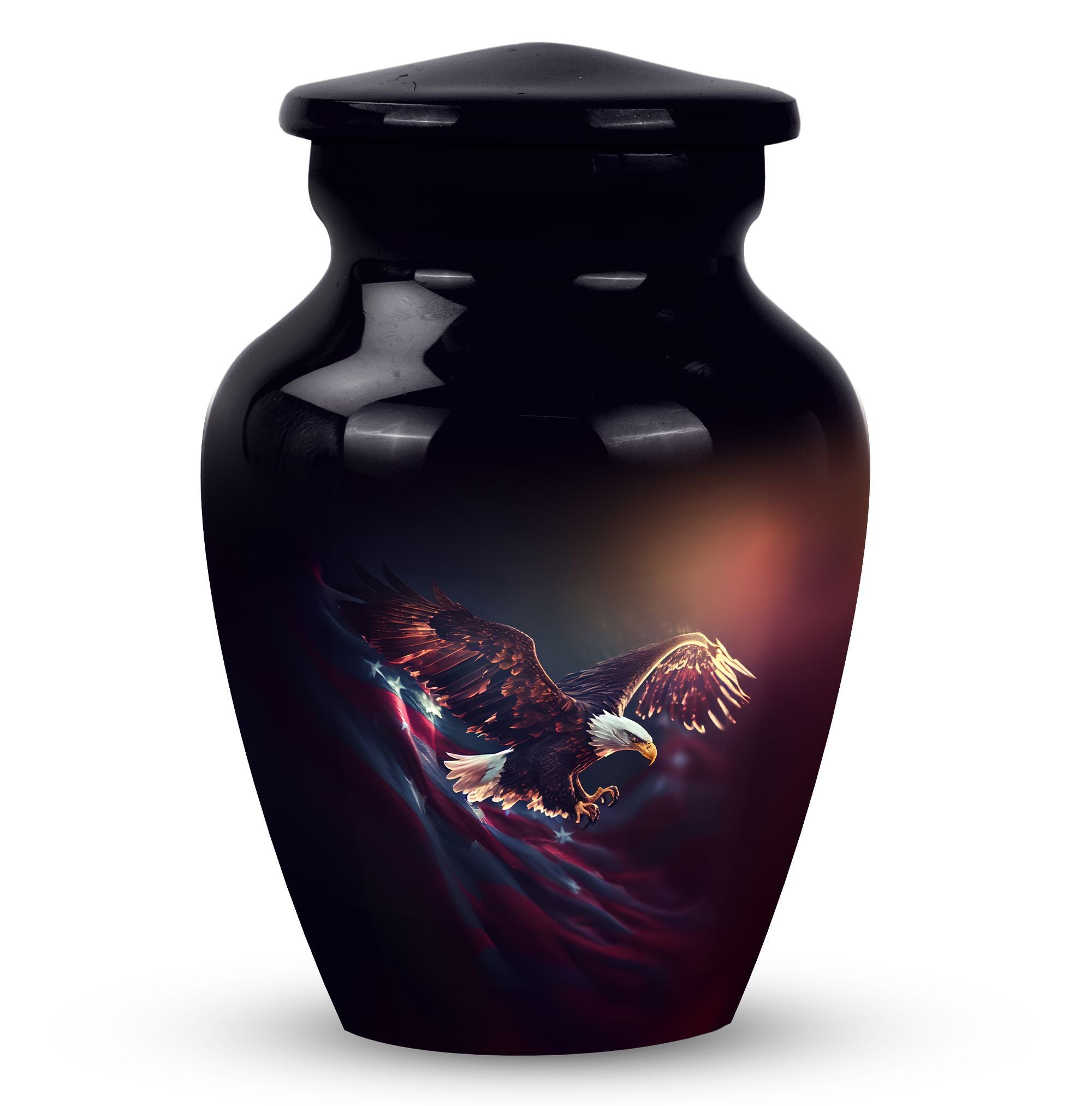 Capture the soaring spirit of your departed loved ones with our 'Flying Eagle Urns for Ashes'. This meticulously crafted piece turns memorial urns into a unique art form, celebrating life and remembrance. Spanning a height of 10 inches and weighing 3.3 pounds, this large urn provides a capacious 200-cubic-inch interior, ideal for preserving precious ashes. Made from top-tier aluminium, it boasts durability as much as a timeless aesthetic. Our urn for ashes goes beyond its primary function as cremation containers for ashes, serving as a touching tribute to your loved ones. It comes with a velvet pouch, ensuring the containment of ashes is handled with care and respect. What's more, you can personalize the urn with engraved names, adding a bespoke touch to this symbol of memory and respect. This item measures 3 inches, an ideal size to place it discreetly in your personal space. Commemorate your loved ones with our unique urns for dad, a perfect addition to your memorial ceremony supplies.