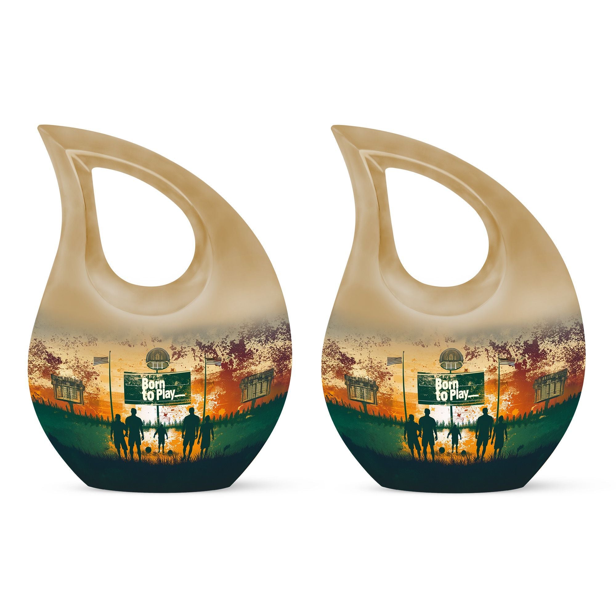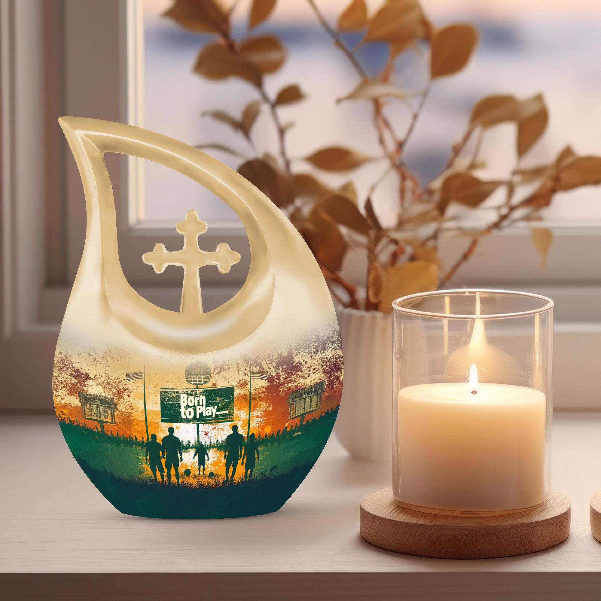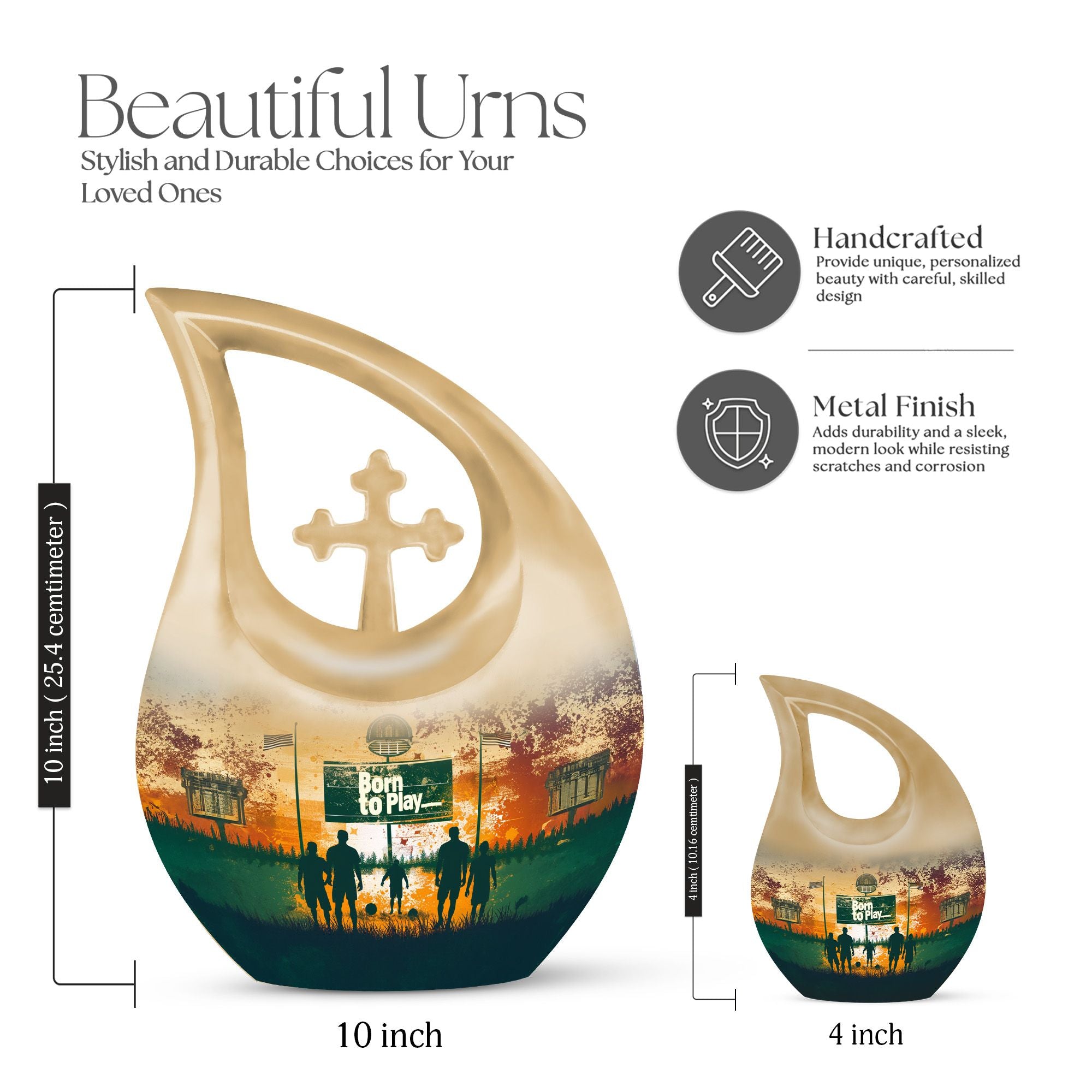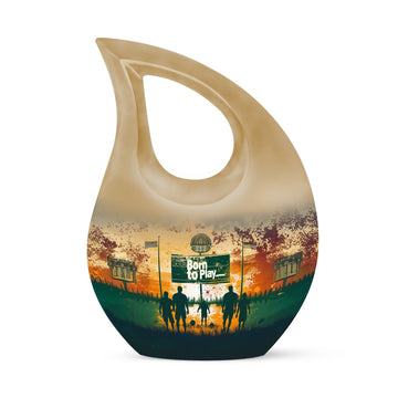 This Football Cremation Urn provides a heartfelt and dignified tribute for families honoring mom and dad, capturing the spirit, strength, and passion of a loved one who cherished the game. Its elegant golden finish and detailed sports artwork make it a meaningful choice for those seeking a memorial that reflects both love and individuality. Ideal for families needing large human urns, it offers a comforting presence in any remembrance space.