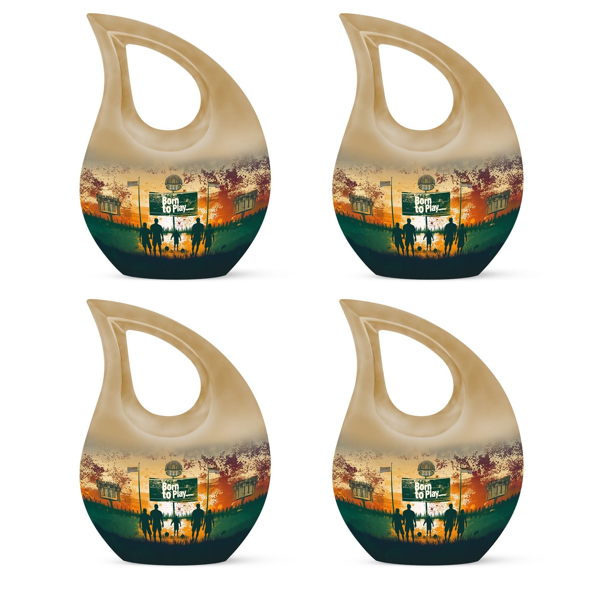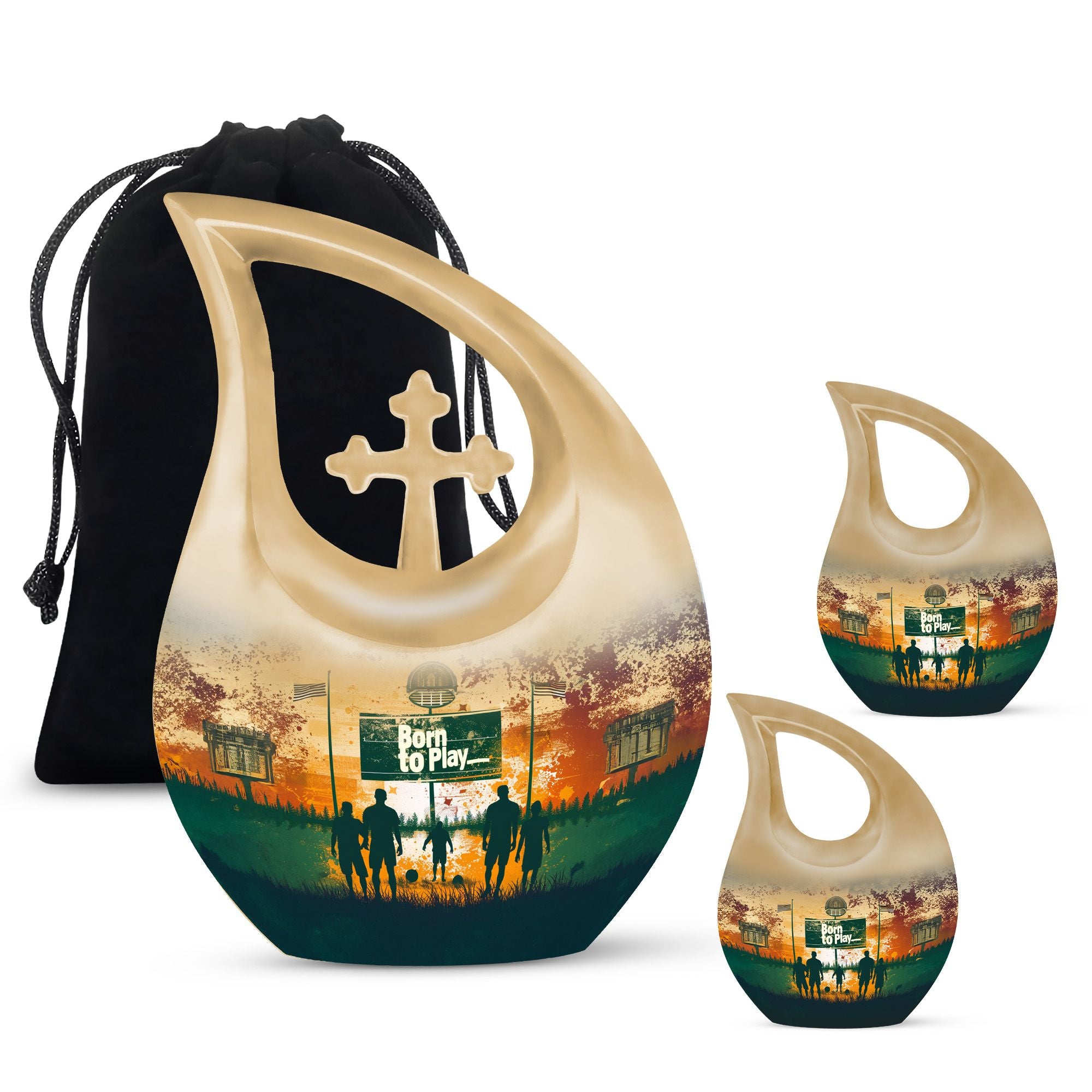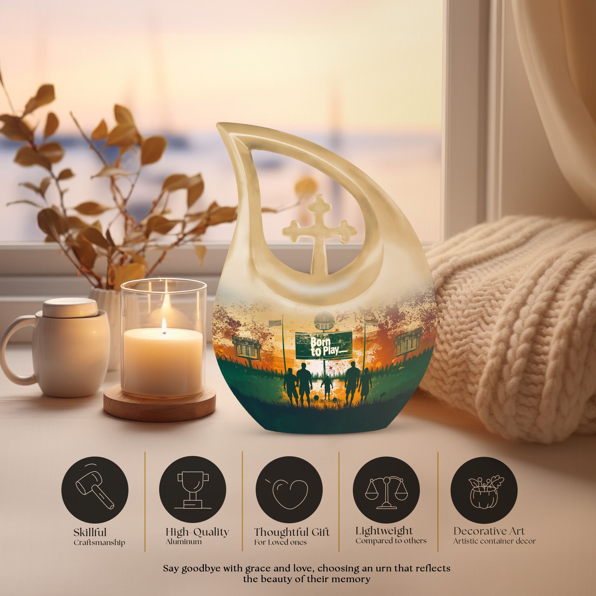 This Football Cremation Urn provides a heartfelt and dignified tribute for families honoring mom and dad, capturing the spirit, strength, and passion of a loved one who cherished the game. Its elegant golden finish and detailed sports artwork make it a meaningful choice for those seeking a memorial that reflects both love and individuality. Ideal for families needing large human urns, it offers a comforting presence in any remembrance space.