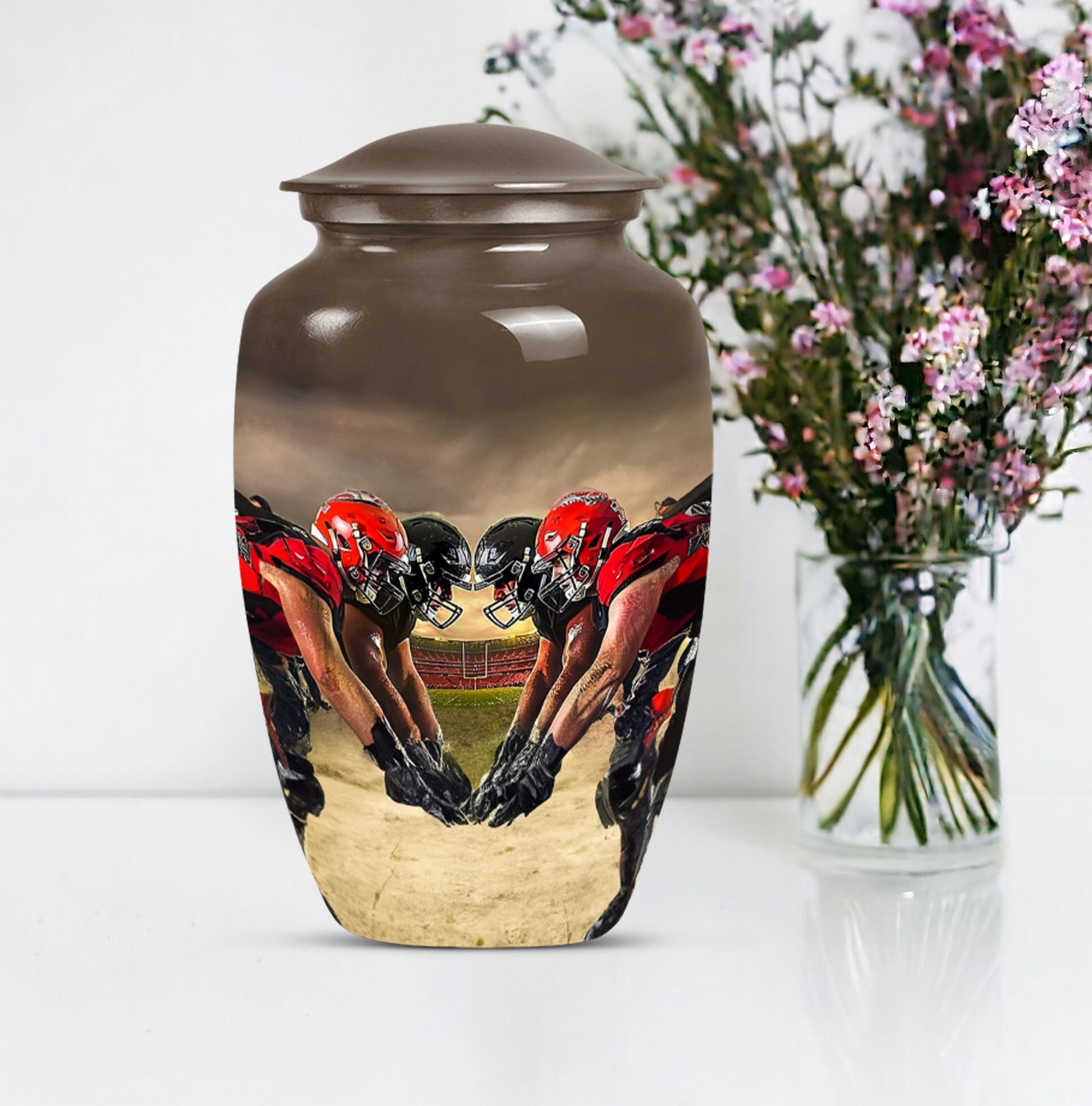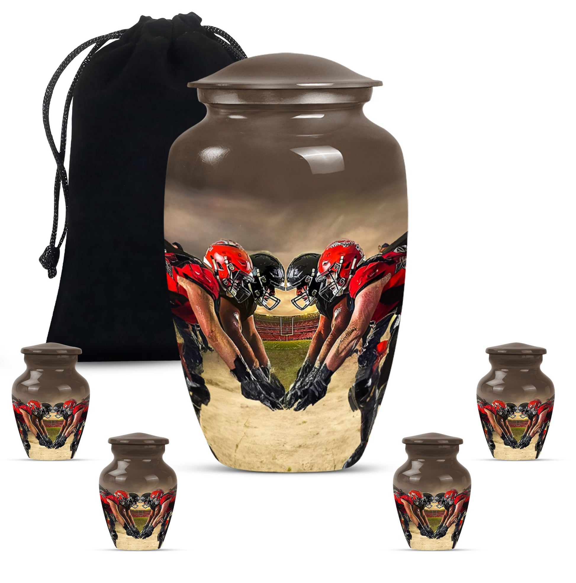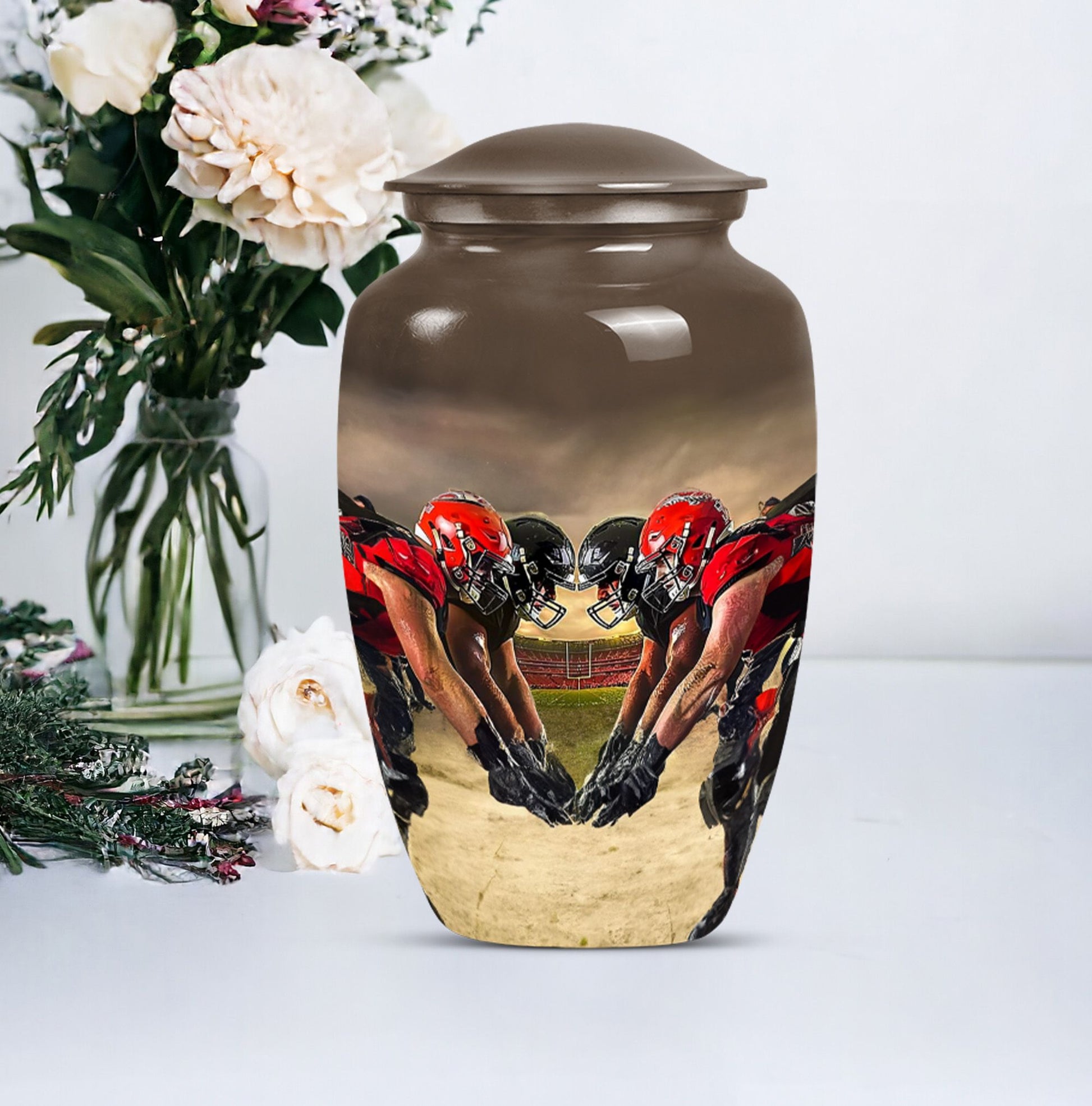 Honor the memory of your loved one with this exquisite 10-inch aluminum Football Urn. Aimed at adults and seniors purchasing memorial ceremony supplies, this large capacity urn holds up to 200 cubic inches of remains. Weighing 3.3 pounds with 10 inches in height, it's a testament to durability and classic design, minus the ostentatious aesthetics. With reverence to the abstract theme, it's sure to be a focal point in any setting. This urn comes with a velvet pouch for safe keeping of ashes, a thoughtfully understood need. Further, adding your personal touch is made easy by opting for names to be engraved. Under the broad umbrella of 'memorial adult urns', this singular piece finely balances tradition with contemporary - much like the football theme. Here's an elegant and lasting tribute as unique as the life they led. Keywords: ashes urn, human ash urns, cremation containers for human ashes, funeral burial urns.