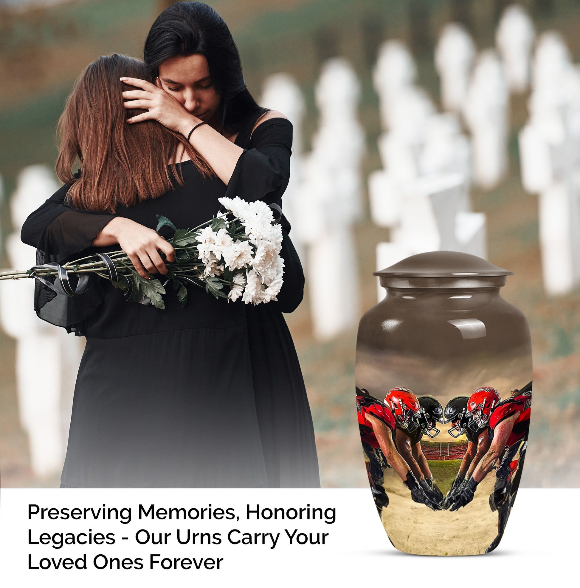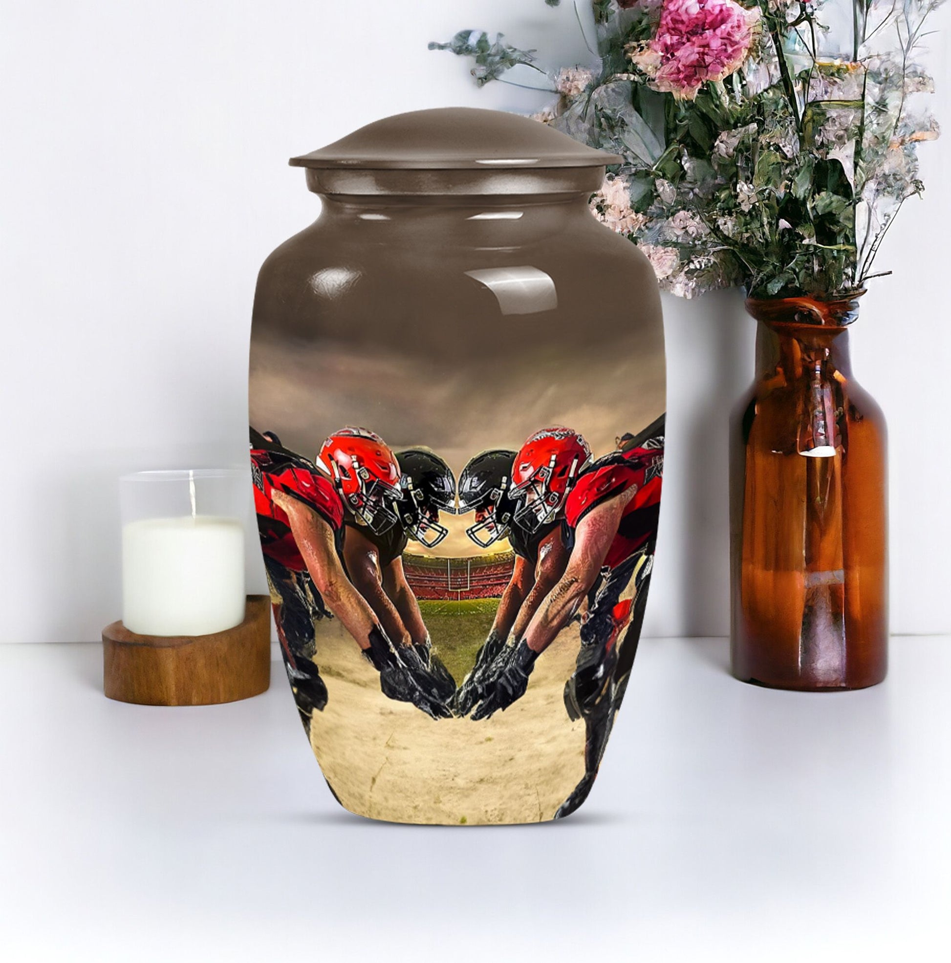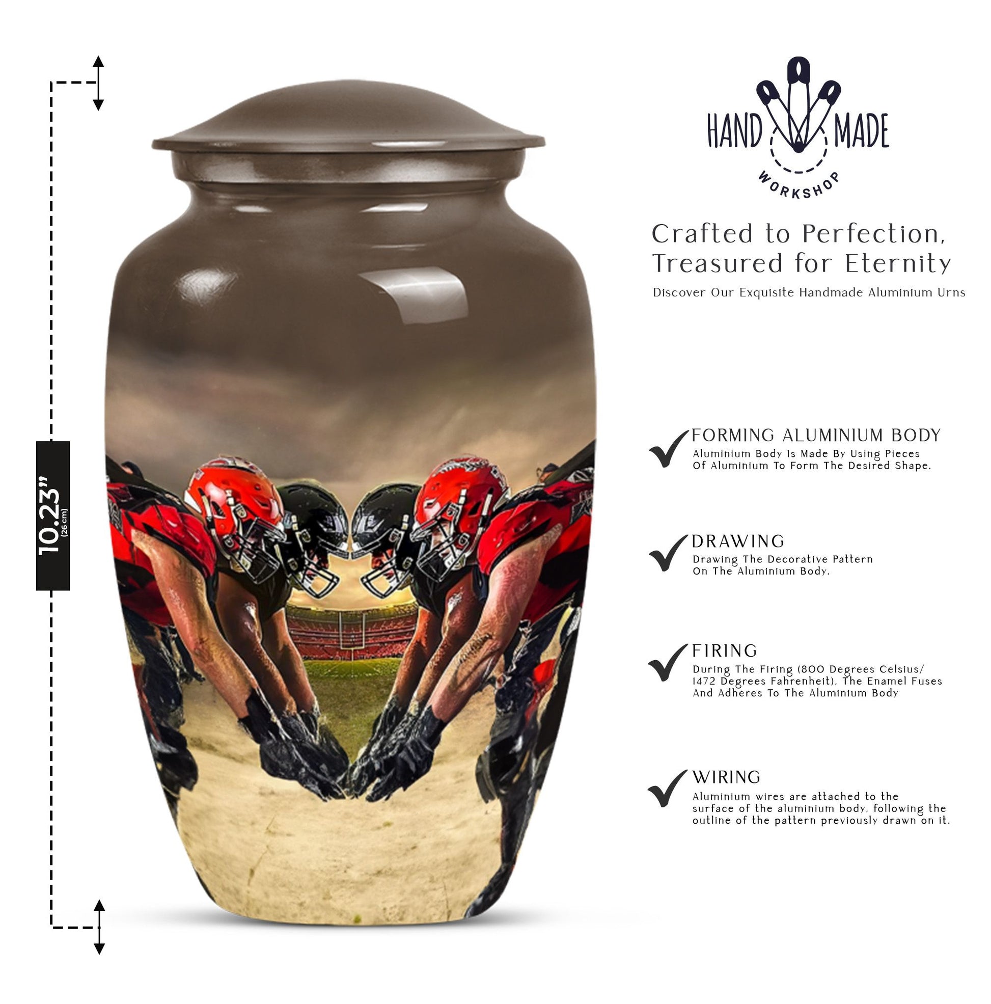 Honor the memory of your loved one with this exquisite 10-inch aluminum Football Urn. Aimed at adults and seniors purchasing memorial ceremony supplies, this large capacity urn holds up to 200 cubic inches of remains. Weighing 3.3 pounds with 10 inches in height, it's a testament to durability and classic design, minus the ostentatious aesthetics. With reverence to the abstract theme, it's sure to be a focal point in any setting. This urn comes with a velvet pouch for safe keeping of ashes, a thoughtfully understood need. Further, adding your personal touch is made easy by opting for names to be engraved. Under the broad umbrella of 'memorial adult urns', this singular piece finely balances tradition with contemporary - much like the football theme. Here's an elegant and lasting tribute as unique as the life they led. Keywords: ashes urn, human ash urns, cremation containers for human ashes, funeral burial urns.
