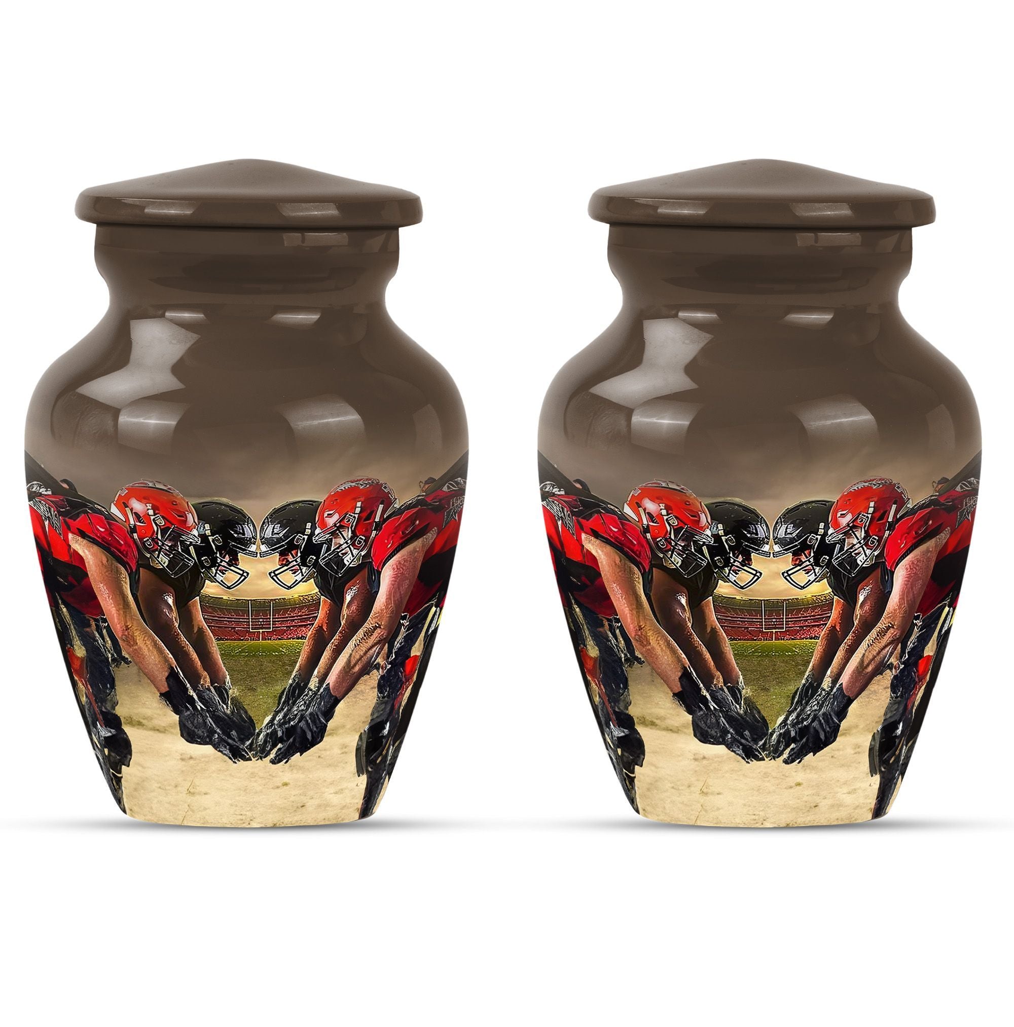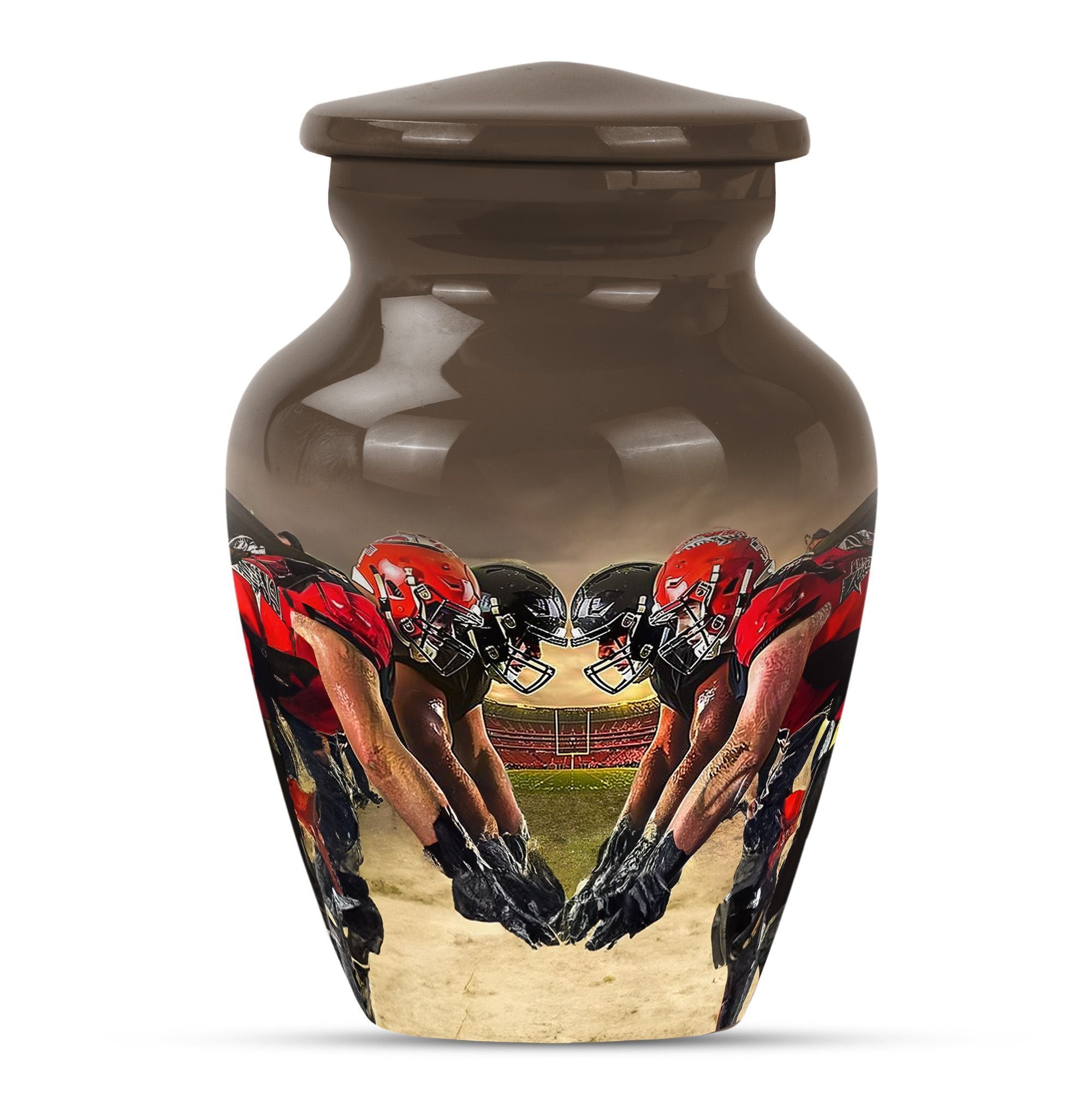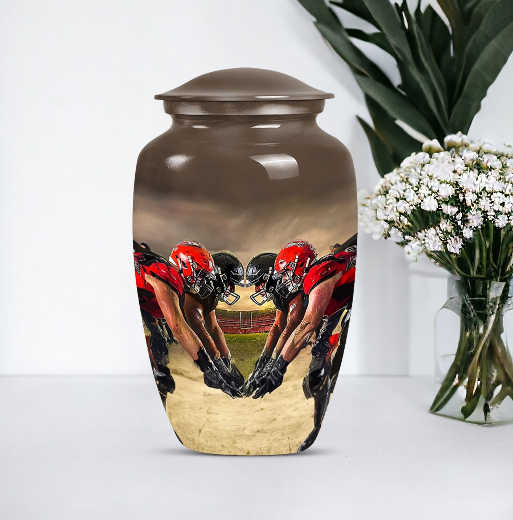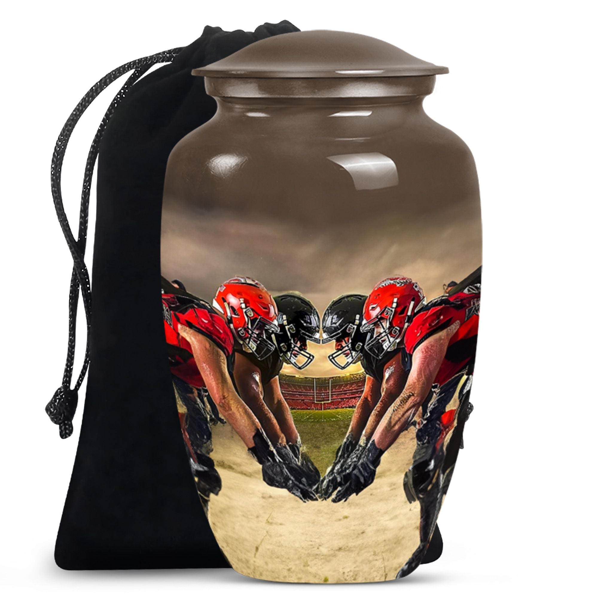 Honor the memory of your loved one with this exquisite 10-inch aluminum Football Urn. Aimed at adults and seniors purchasing memorial ceremony supplies, this large capacity urn holds up to 200 cubic inches of remains. Weighing 3.3 pounds with 10 inches in height, it's a testament to durability and classic design, minus the ostentatious aesthetics. With reverence to the abstract theme, it's sure to be a focal point in any setting. This urn comes with a velvet pouch for safe keeping of ashes, a thoughtfully understood need. Further, adding your personal touch is made easy by opting for names to be engraved. Under the broad umbrella of 'memorial adult urns', this singular piece finely balances tradition with contemporary - much like the football theme. Here's an elegant and lasting tribute as unique as the life they led. Keywords: ashes urn, human ash urns, cremation containers for human ashes, funeral burial urns.