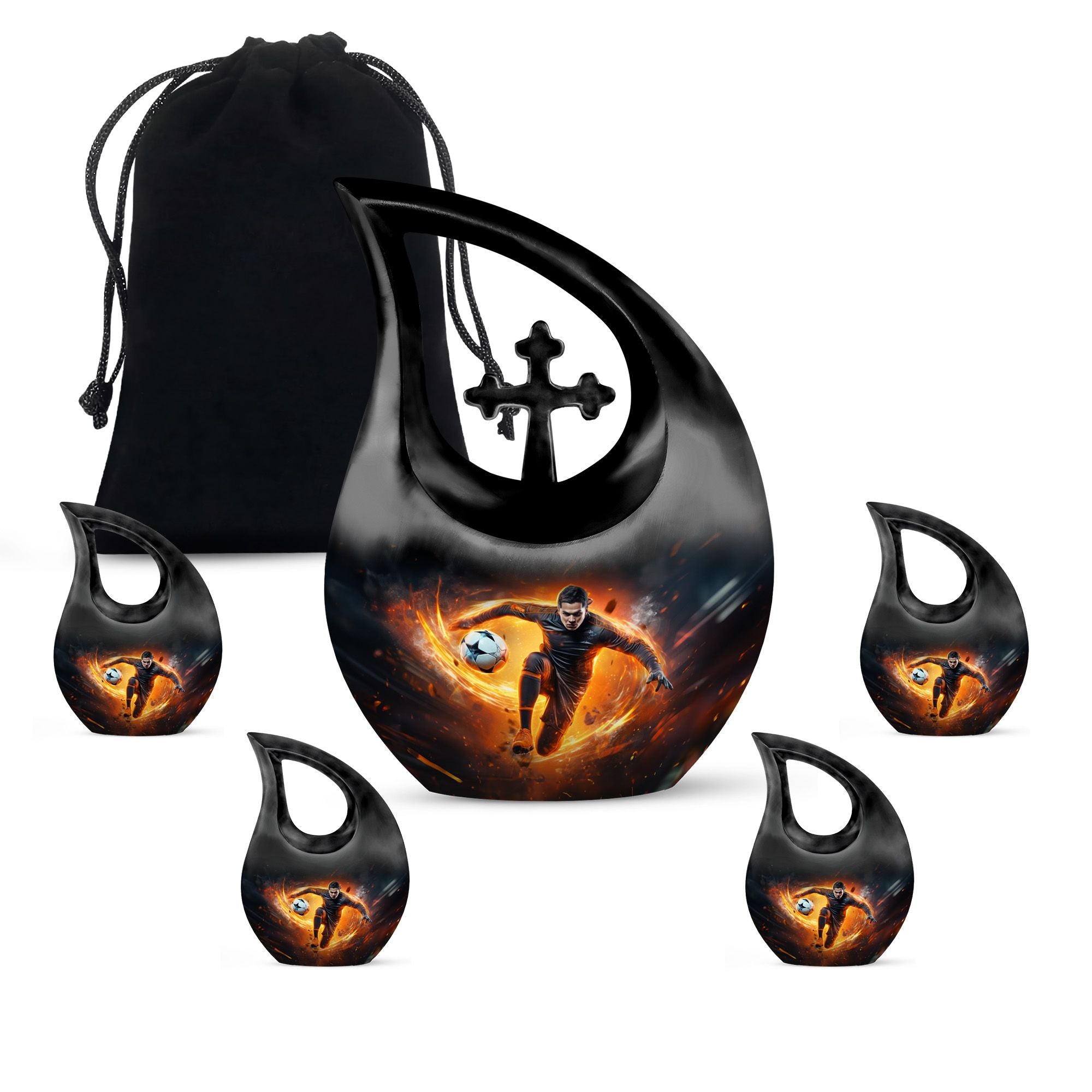Features:• Material: Aluminium• Dimensions: Height 10 inches• Capacity: 200 cubic inches• Lid: Secure screw-top lid• Design: Football-themed memorial artwork• Use: Adult Male/Female Cremation