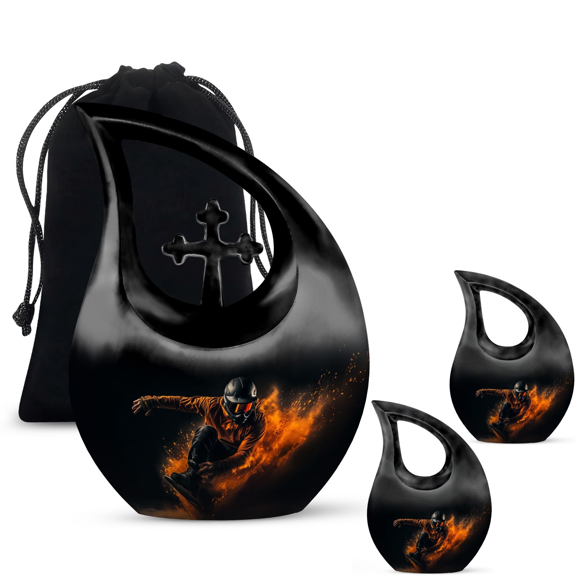 Crafted from durable aluminum, this urn blends artistic style with long-lasting security. Its detailed ice-surfing design creates a unique and peaceful memorial piece suitable for home display, ceremonies, or personal remembrance. This full-size urn pairs beautifully with keepsake urns, mini urns for human ashes, and coordinating mini urns for sharing ashes for families wishing to create a complete memorial set. The secure screw-top lid ensures ashes remain protected, while the modern artwork adds a meaningful decorative touch.
