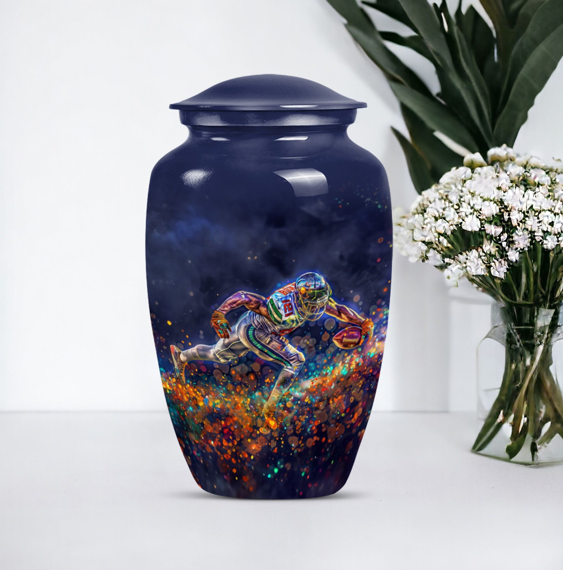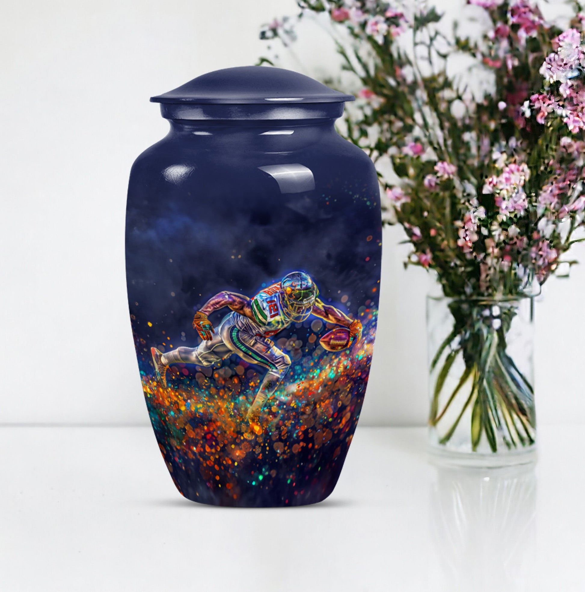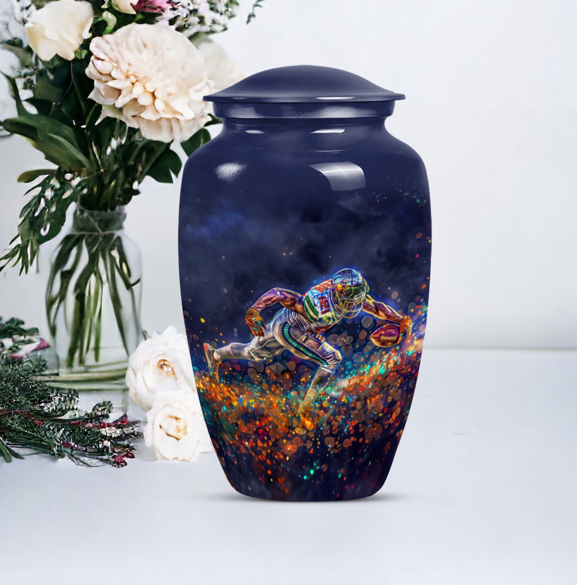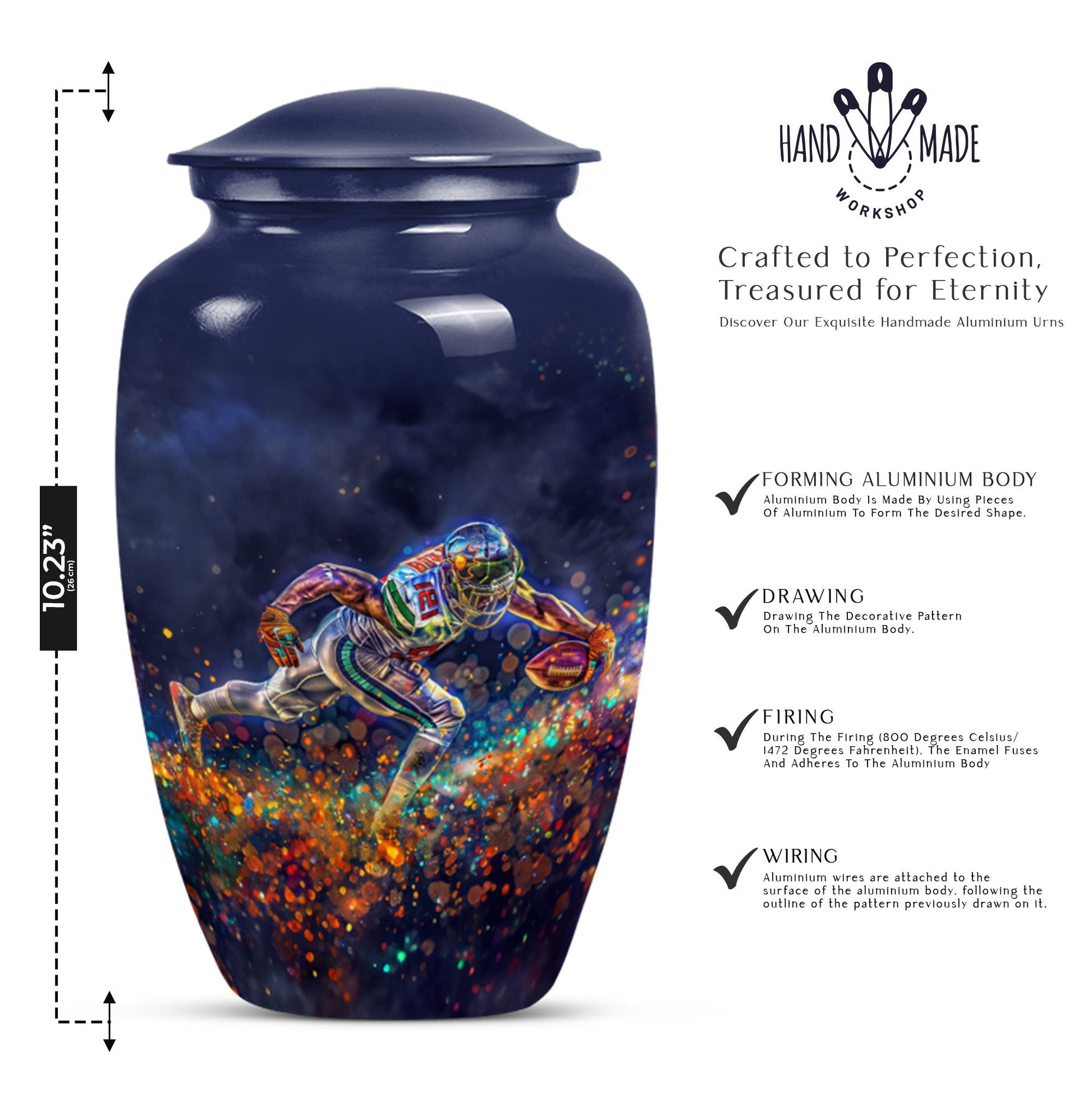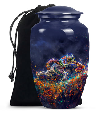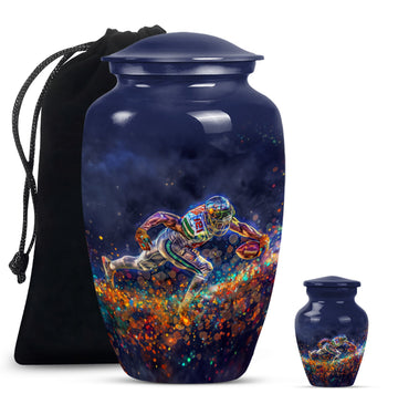 Discover a beautiful way to preserve the memory of your loved one with this unique, meticulously crafted memorial medium urn. Made of sturdy aluminium, this classic urn is shipped with a velvet pouch to ensure safe containment of ashes. Measuring 10 inches in height with a weight of 3.3 pounds, it has a generous capacity of 200 cubic inches. This urn is more than just a resting place for the deceased – you can personalize it with engraved names to add a touch of sentimentality. With an abstract theme, this product is suitable for anyone in search of large urns. Apart from the beautiful outlook, the football Urn is designed to serve as a fitting tribute to an unforgettable legacy. While perfectly suitable for home use, this cremation urn can also be used for burial purposes, acting as a symbol of endless affection even in the face of death. This product is an exemplary choice amongst funeral burial urns for adult human ashes or cremation urns for human ashes. Note: This product has been optimized for SEO with the keywords 'memorial urns', 'funeral burial urns for adult human ashes', 'footboll urn', 'ash burial urn', and 'cremation urn'.