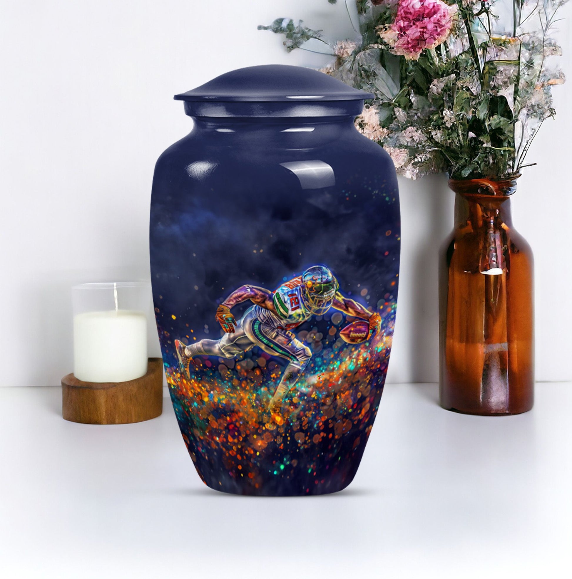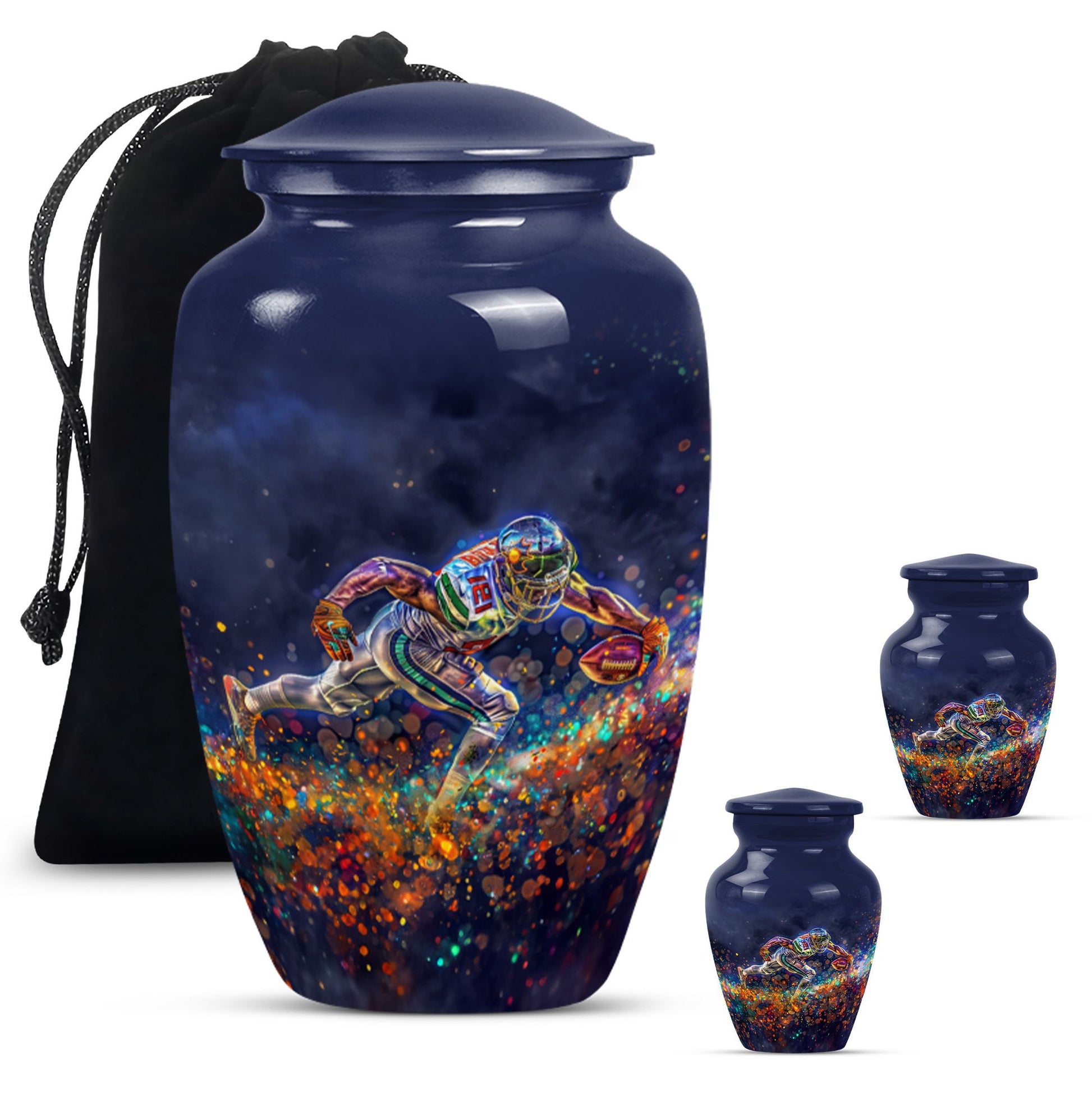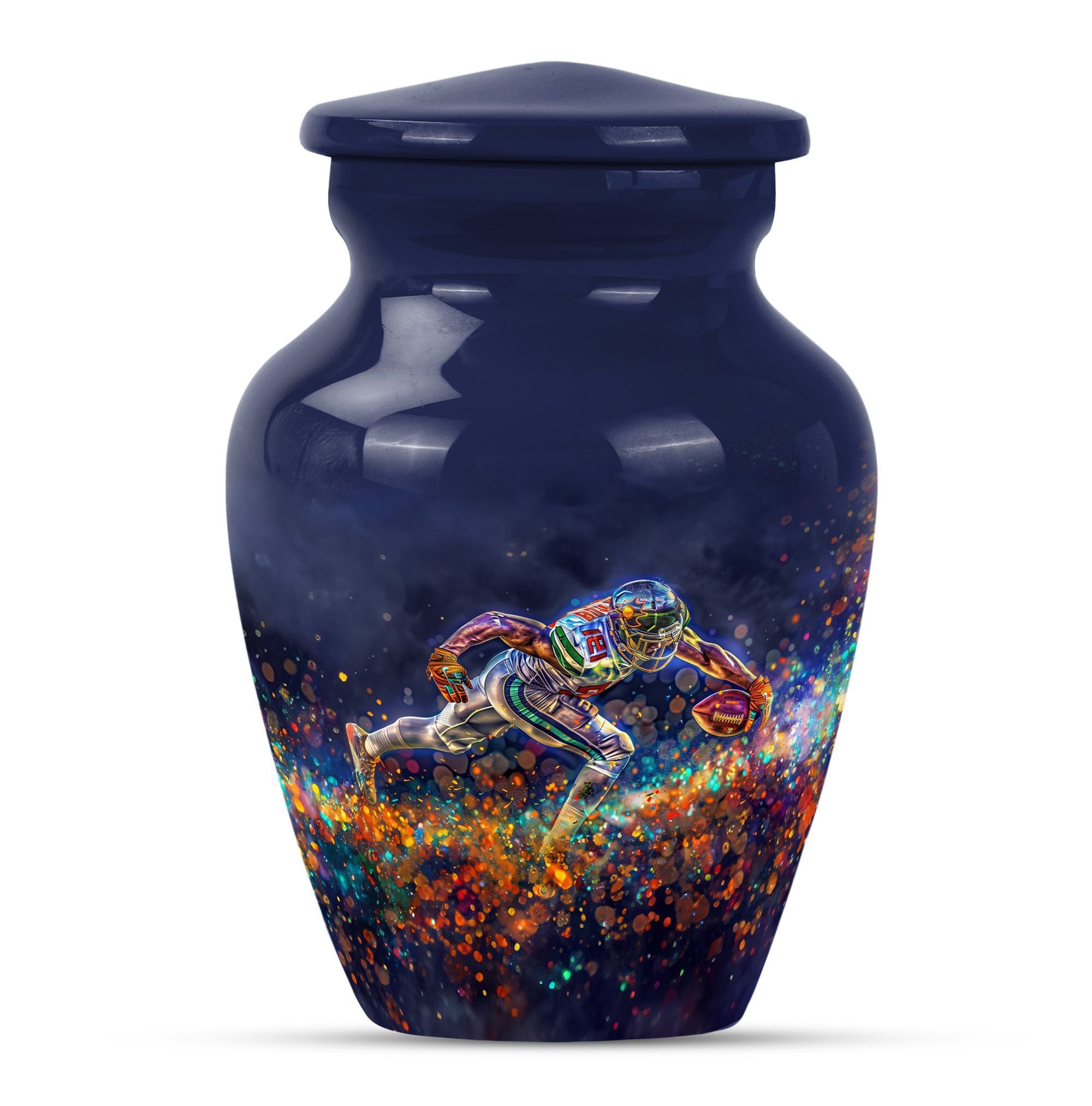Discover a beautiful way to preserve the memory of your loved one with this unique, meticulously crafted memorial medium urn. Made of sturdy aluminium, this classic urn is shipped with a velvet pouch to ensure safe containment of ashes. Measuring 10 inches in height with a weight of 3.3 pounds, it has a generous capacity of 200 cubic inches. This urn is more than just a resting place for the deceased – you can personalize it with engraved names to add a touch of sentimentality. With an abstract theme, this product is suitable for anyone in search of large urns. Apart from the beautiful outlook, the football Urn is designed to serve as a fitting tribute to an unforgettable legacy. While perfectly suitable for home use, this cremation urn can also be used for burial purposes, acting as a symbol of endless affection even in the face of death. This product is an exemplary choice amongst funeral burial urns for adult human ashes or cremation urns for human ashes. Note: This product has been optimized for SEO with the keywords 'memorial urns', 'funeral burial urns for adult human ashes', 'footboll urn', 'ash burial urn', and 'cremation urn'.